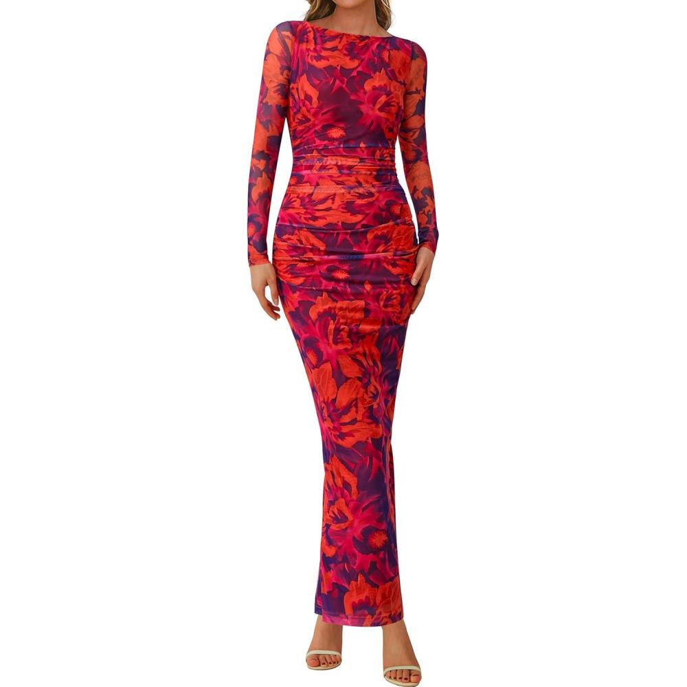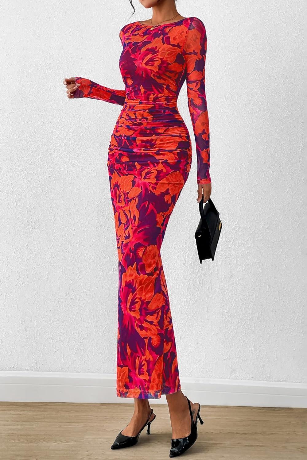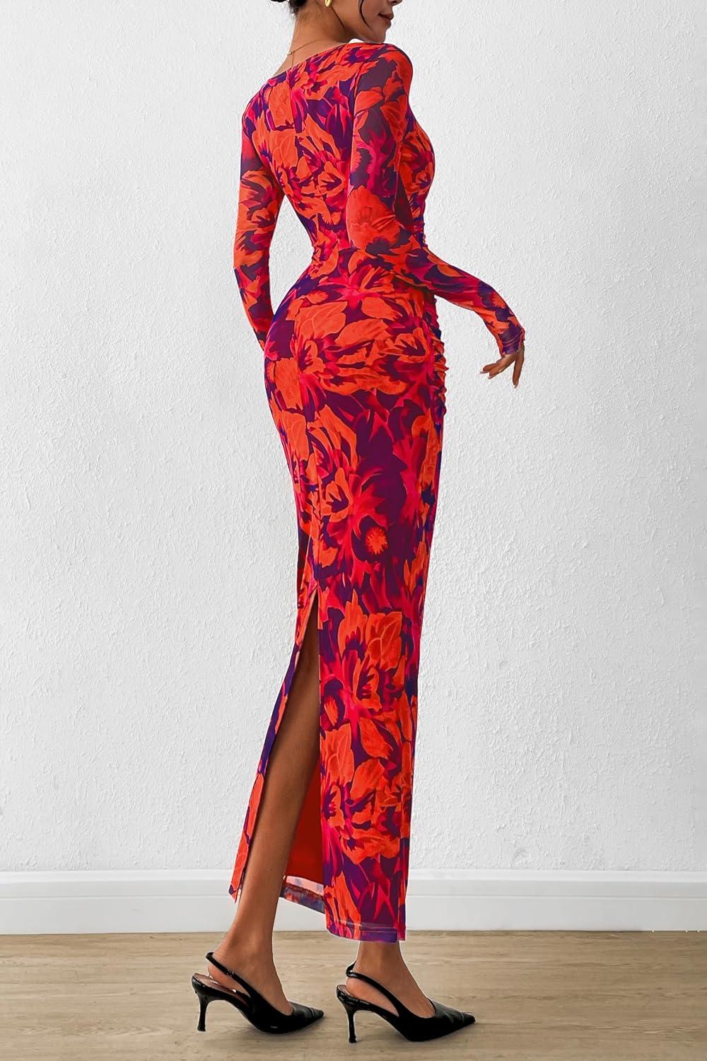 PRETTYGARDEN Women’s Long Sleeve Bodycon Dresses 2025 Fall Sexy Floral Mesh Slit Ruched Tight Maxi Wedding Guest Dress(Red Flower)