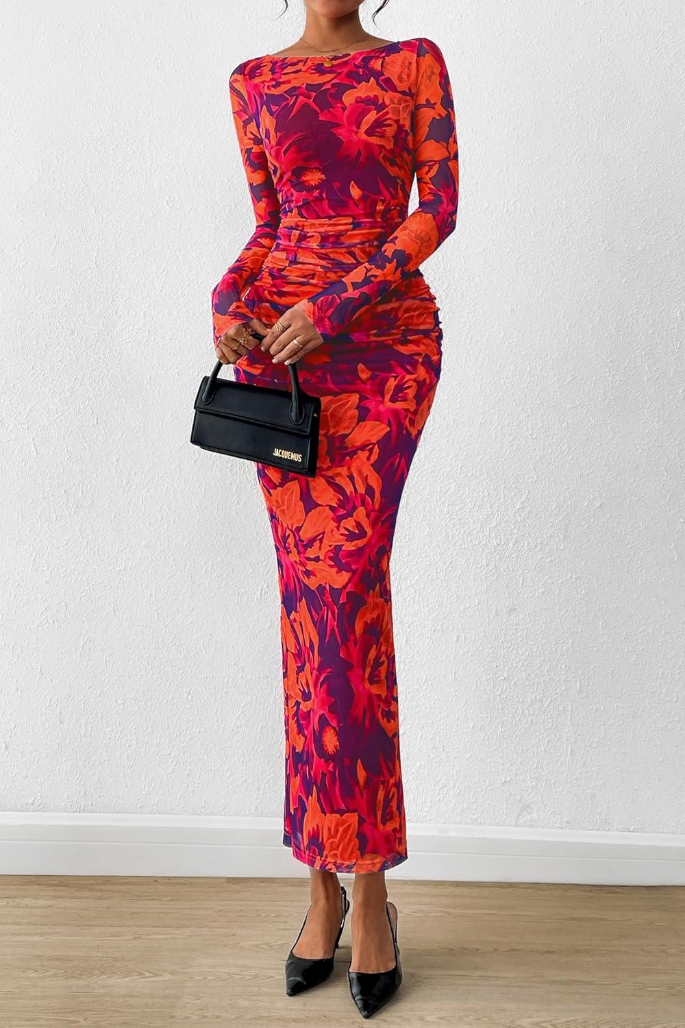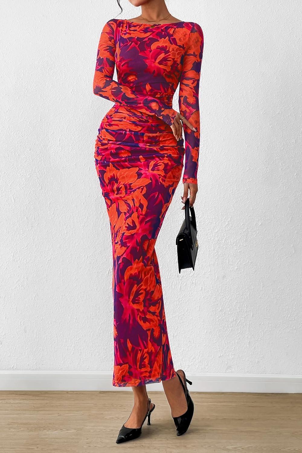 PRETTYGARDEN Women's Long Sleeve Bodycon Dresses 2025 Fall Sexy Floral Mesh Slit Ruched Tight Maxi Wedding Guest Dress(Purple Orange)