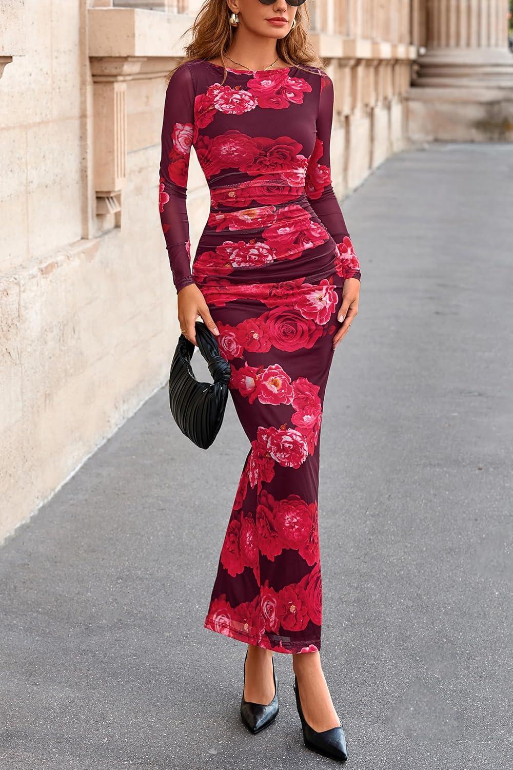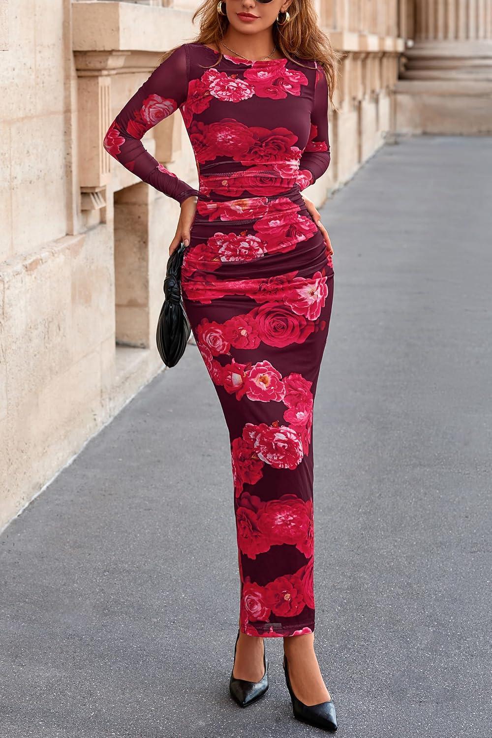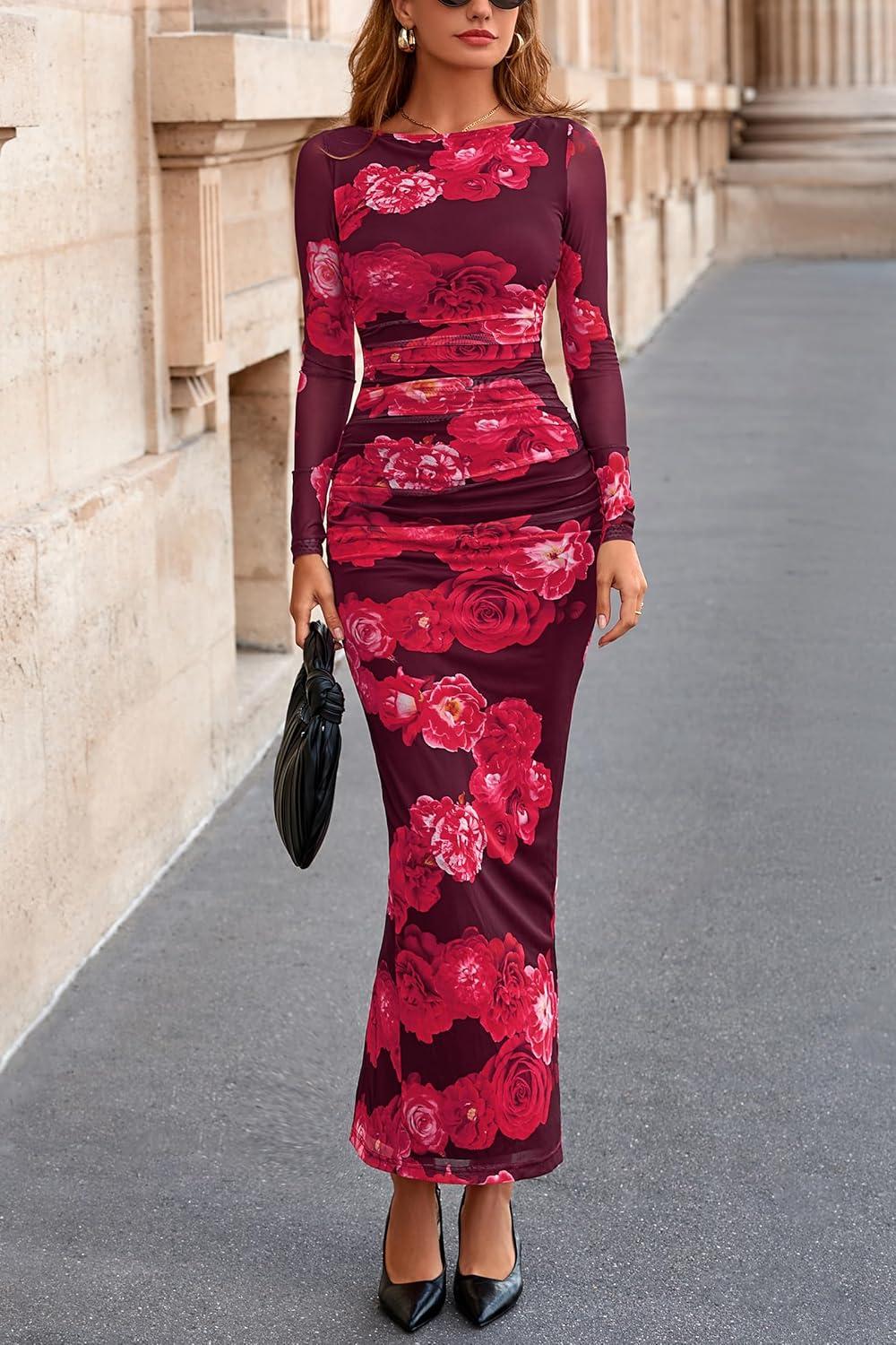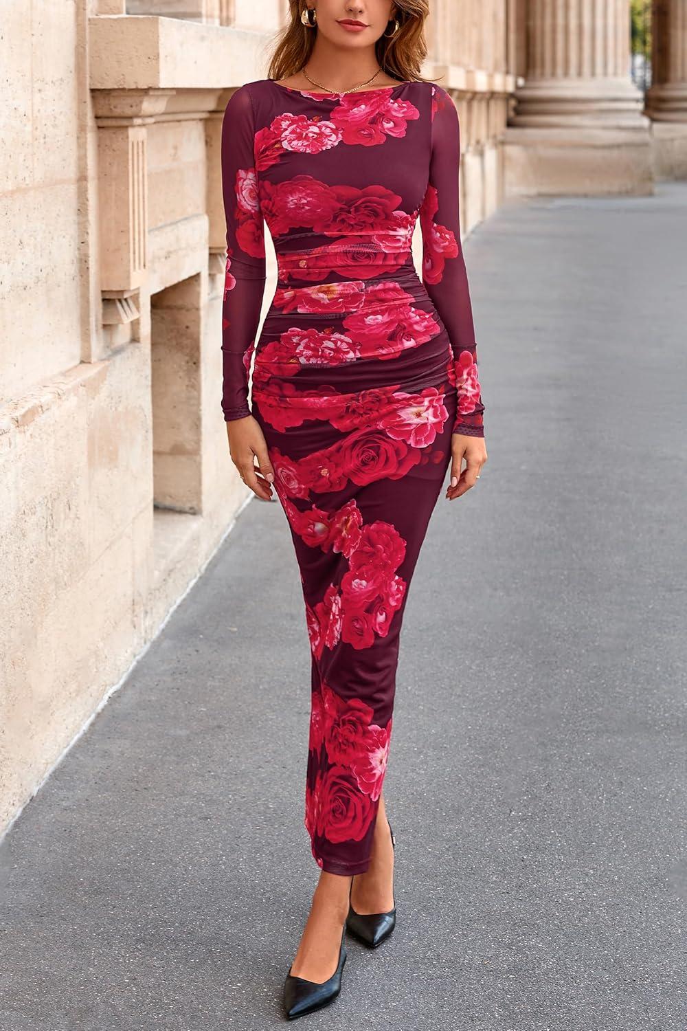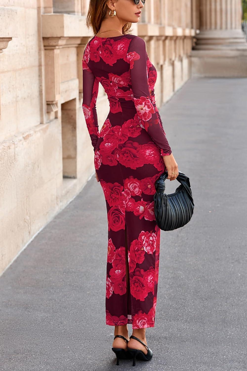 PRETTYGARDEN Women's Long Sleeve Bodycon Dresses 2025 Fall Sexy Floral Mesh Slit Ruched Tight Maxi Wedding Guest Dress(Red Flower)