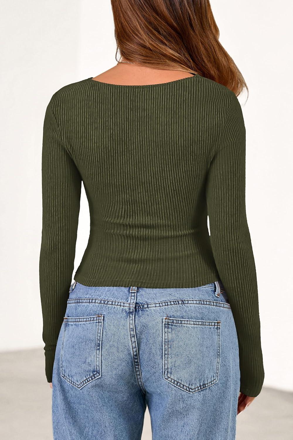 PRETTYGARDEN Women’s Long Sleeve Cowl Neck Ribbed Knit Fall Shirts Slim Fit Ruched Going Out Crop Tops Basic T-Shirts(Army Green)
