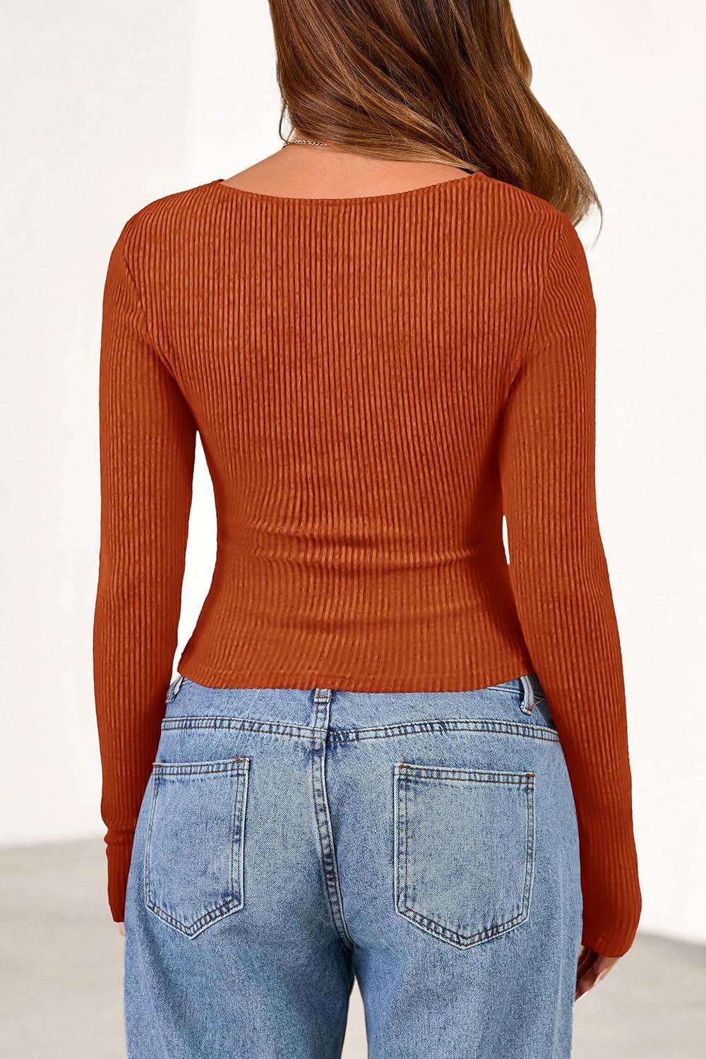 PRETTYGARDEN Women’s Long Sleeve Cowl Neck Ribbed Knit Fall Shirts Slim Fit Ruched Going Out Crop Tops Basic T-Shirts(Burnt Orange)