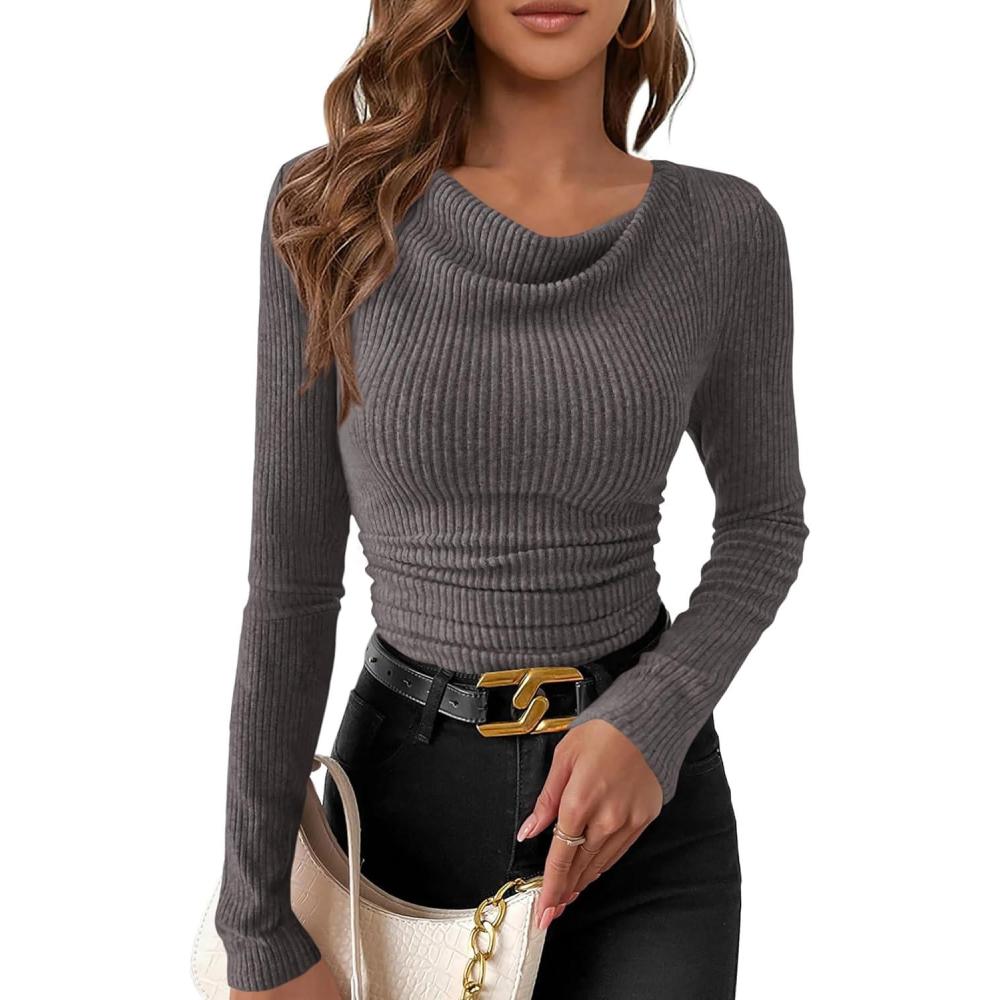 PRETTYGARDEN Women’s Long Sleeve Cowl Neck Ribbed Knit Fall Shirts Slim Fit Ruched Going Out Crop Tops Basic T-Shirts(Dark Grey)