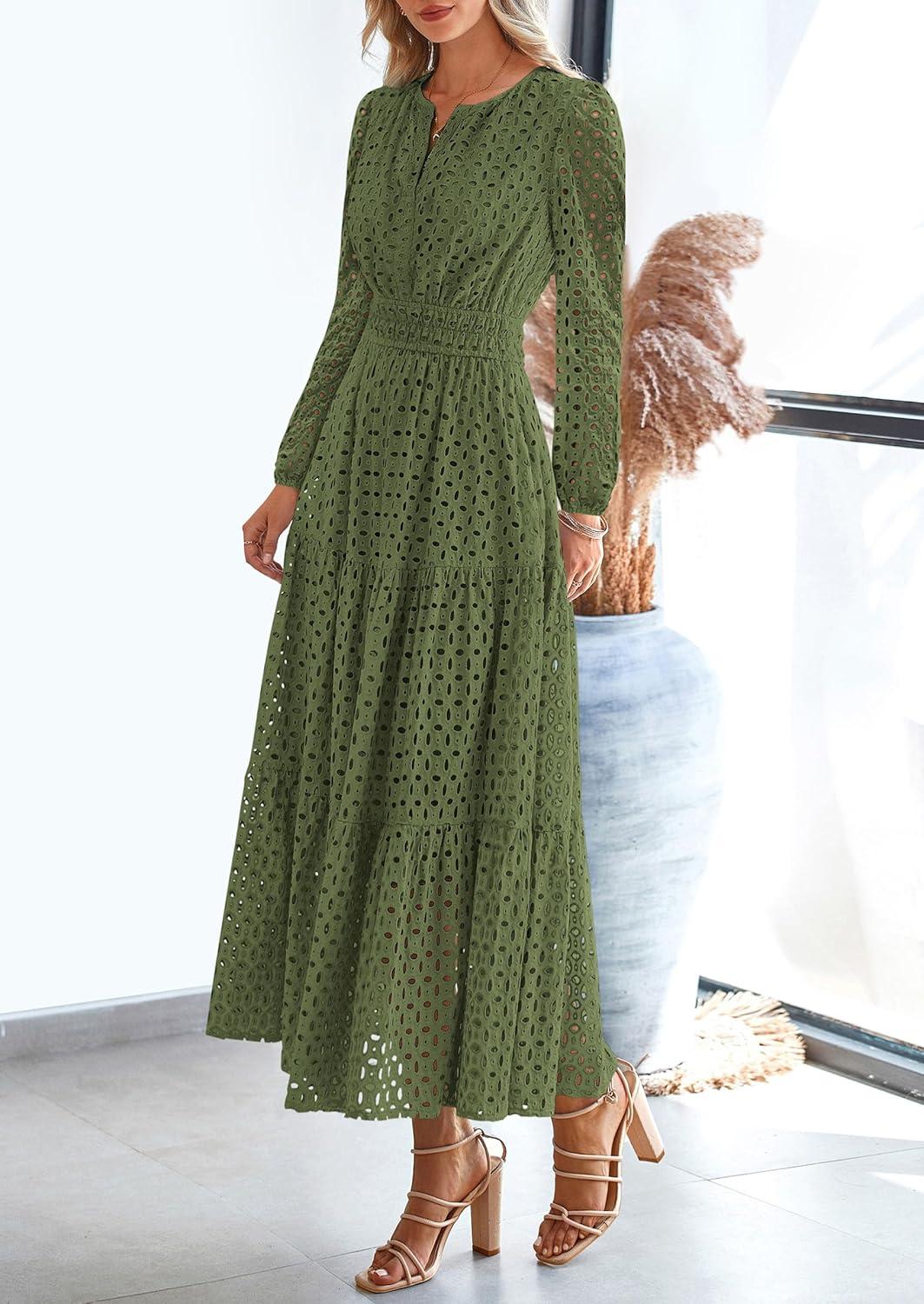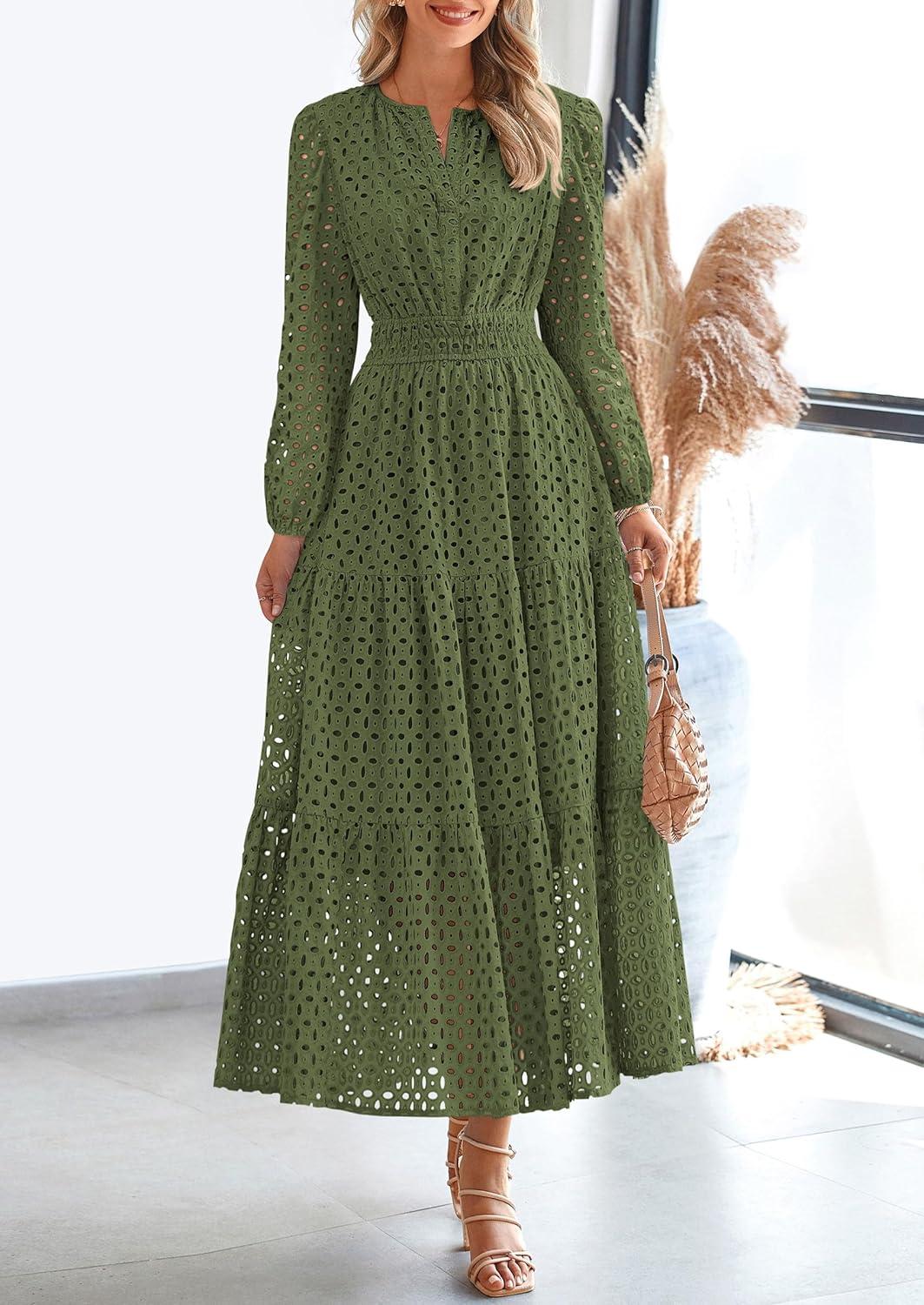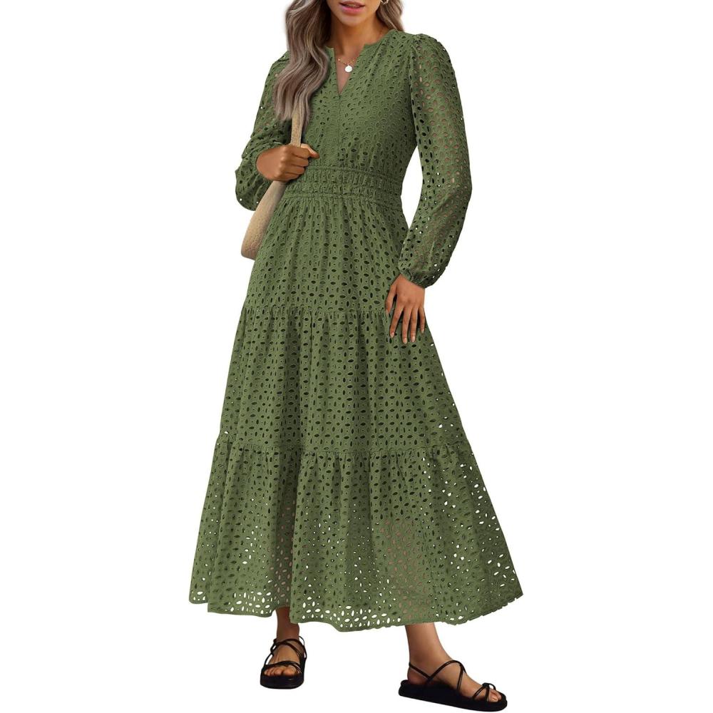 PRETTYGARDEN Women’s Long Sleeve Maxi Dress V Neck Hollow Out Eyelet A Line Long Flowy 2025 Fall Wedding Guest Dresses