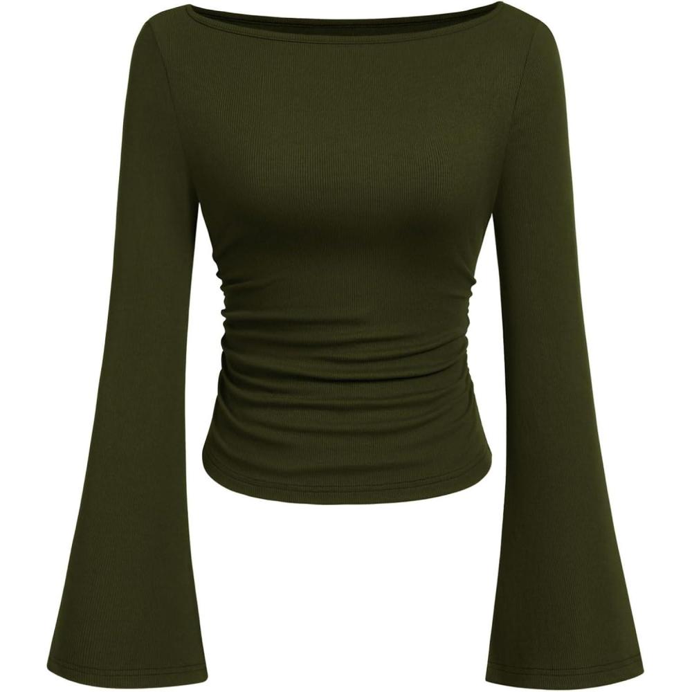 PRETTYGARDEN Women’s Long Sleeve Shirts 2025 Fall Crop Going Out Tops Casual Boat Neck Bell Sleeve Ribbed Ruched Y2K Clothes(Army Green)