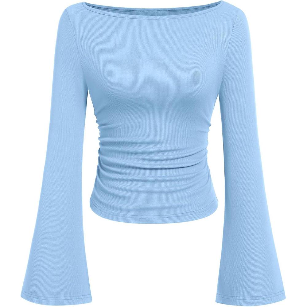 PRETTYGARDEN Women's Long Sleeve Shirts 2025 Fall Crop Going Out Tops Casual Boat Neck Bell Sleeve Ribbed Ruched Y2K Clothes(Sky Blue)
