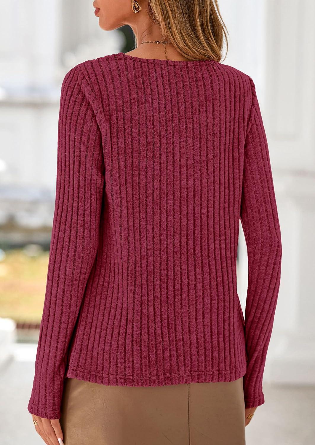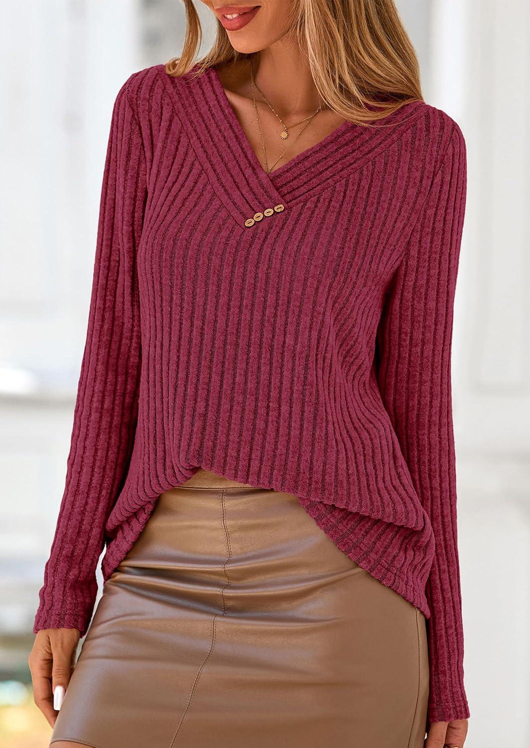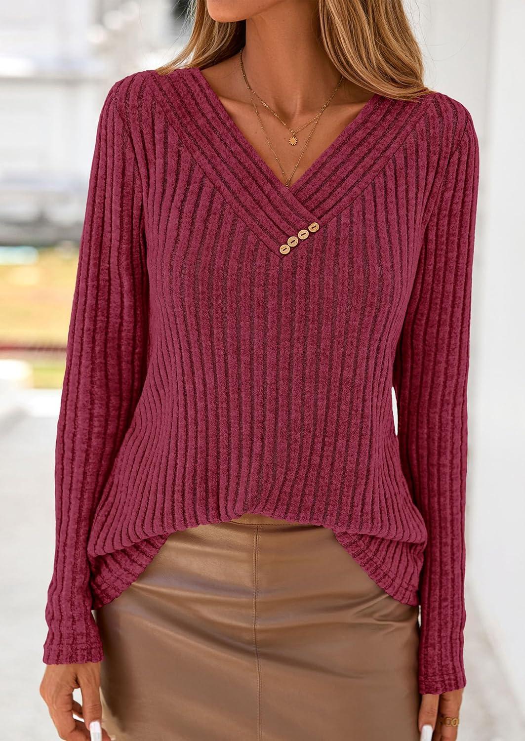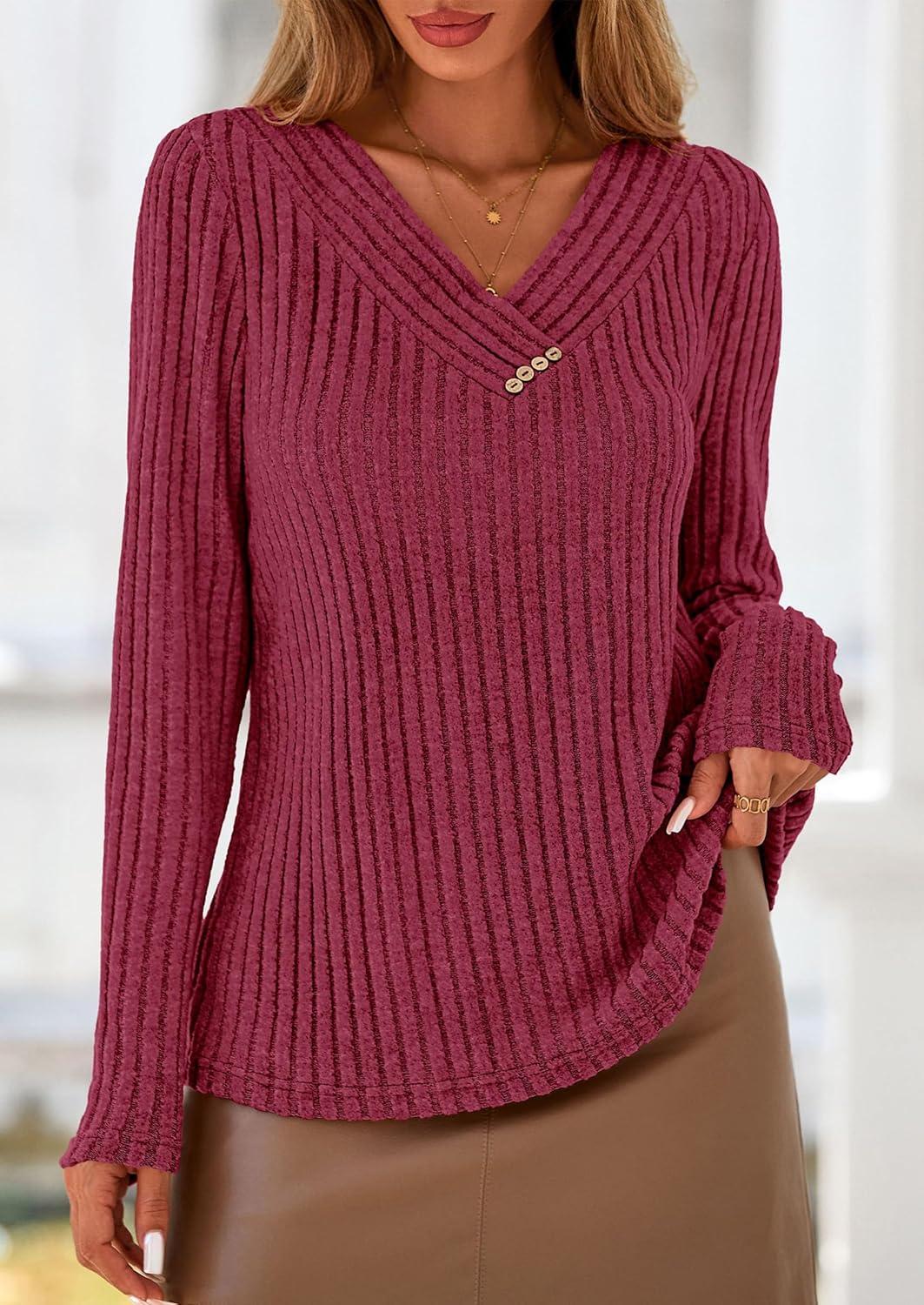 PRETTYGARDEN Women’s Long Sleeve Shirts 2025 Fall Fashion Clothes Casual Ribbed V Neck Loose Tunic Tops Lightweight Sweaters(Burgundy)