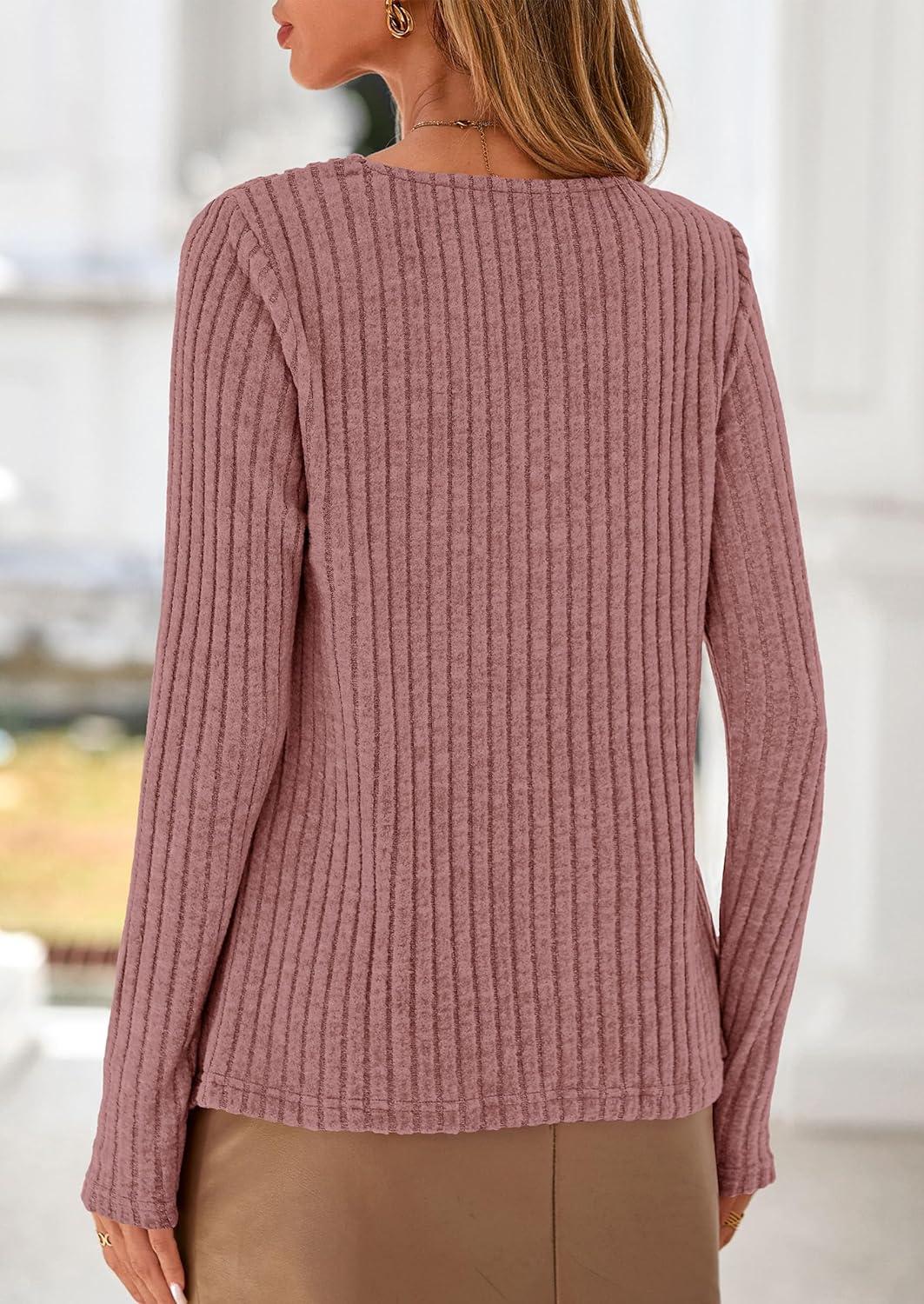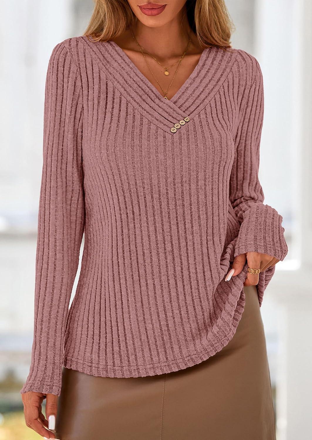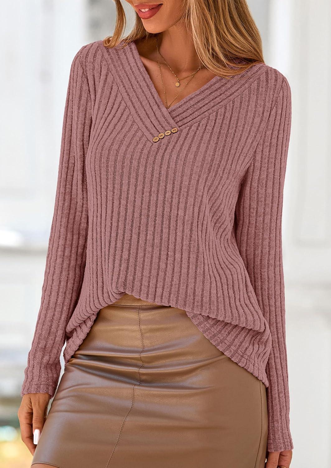 PRETTYGARDEN Women's Long Sleeve Shirts 2025 Fall Fashion Clothes Casual Ribbed V Neck Loose Tunic Tops Lightweight Sweaters(Pink)