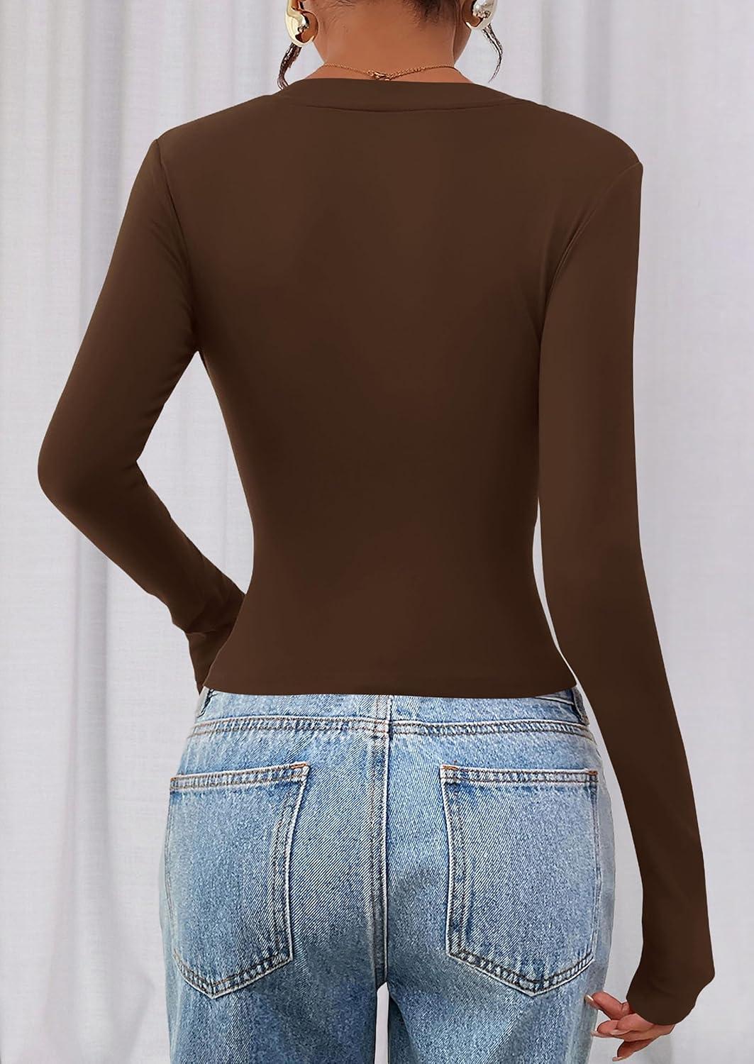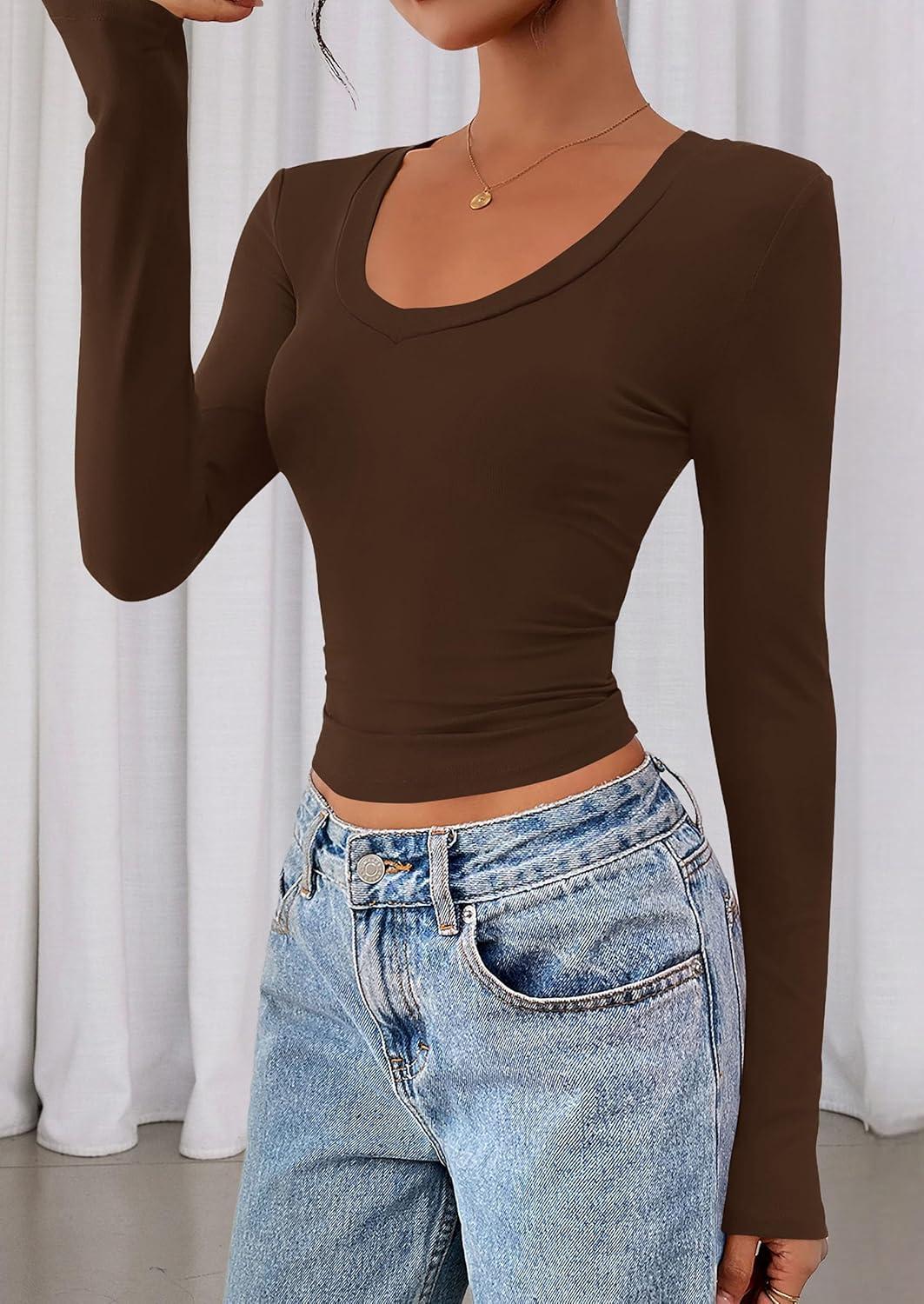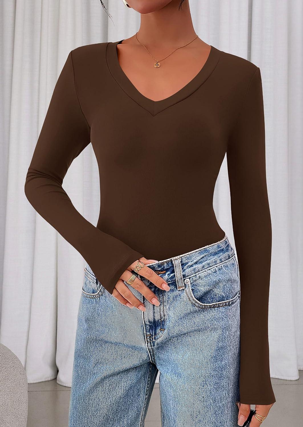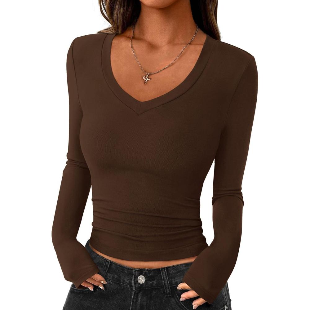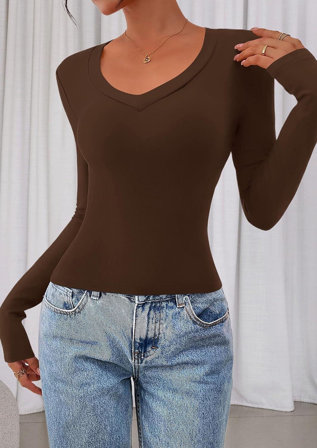 Save big on PRETTYGARDEN Womens Long Sleeve T Shirts 2025 Fall Trendy Deep V Neck Slim Fit Basic Crop Tops Casual Going Out Top(Brown) during our summer blowout sale. Limited quantities available.