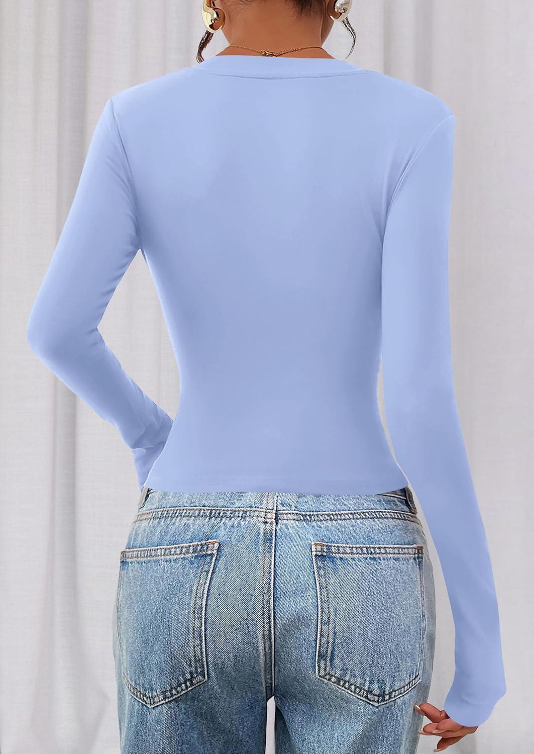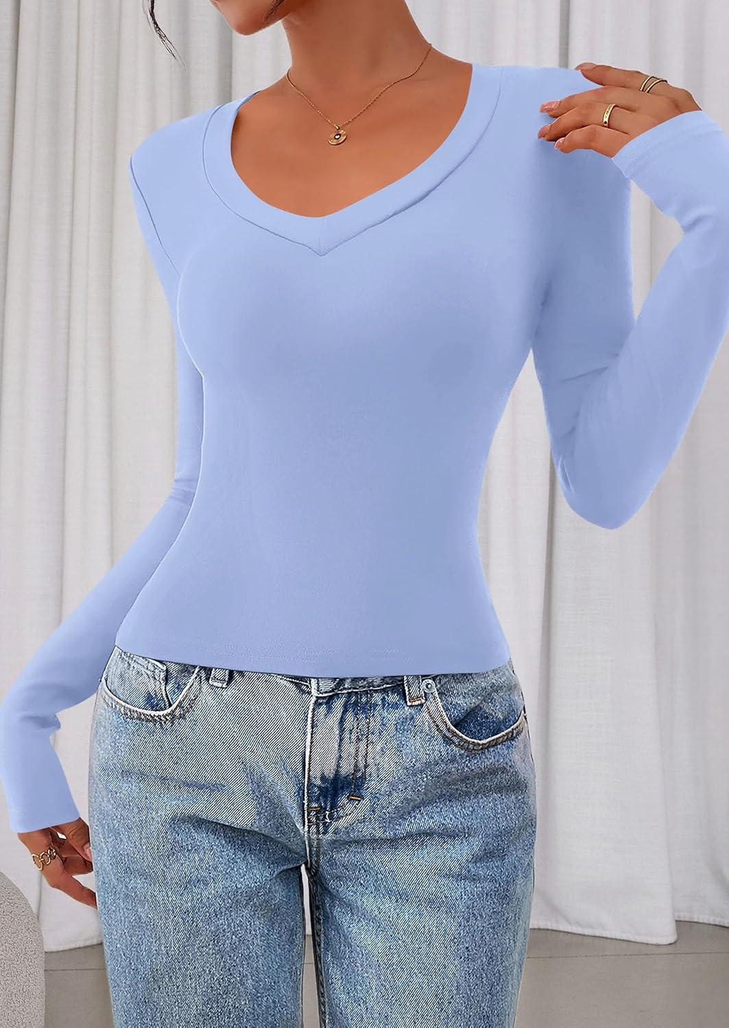 PRETTYGARDEN Womens Long Sleeve T Shirts 2025 Fall Trendy Deep V Neck Slim Fit Basic Crop Tops Casual Going Out Top(Light Blue)