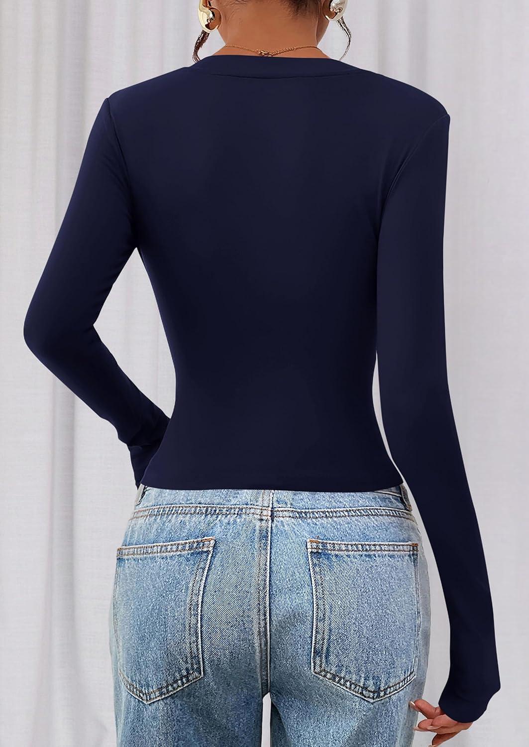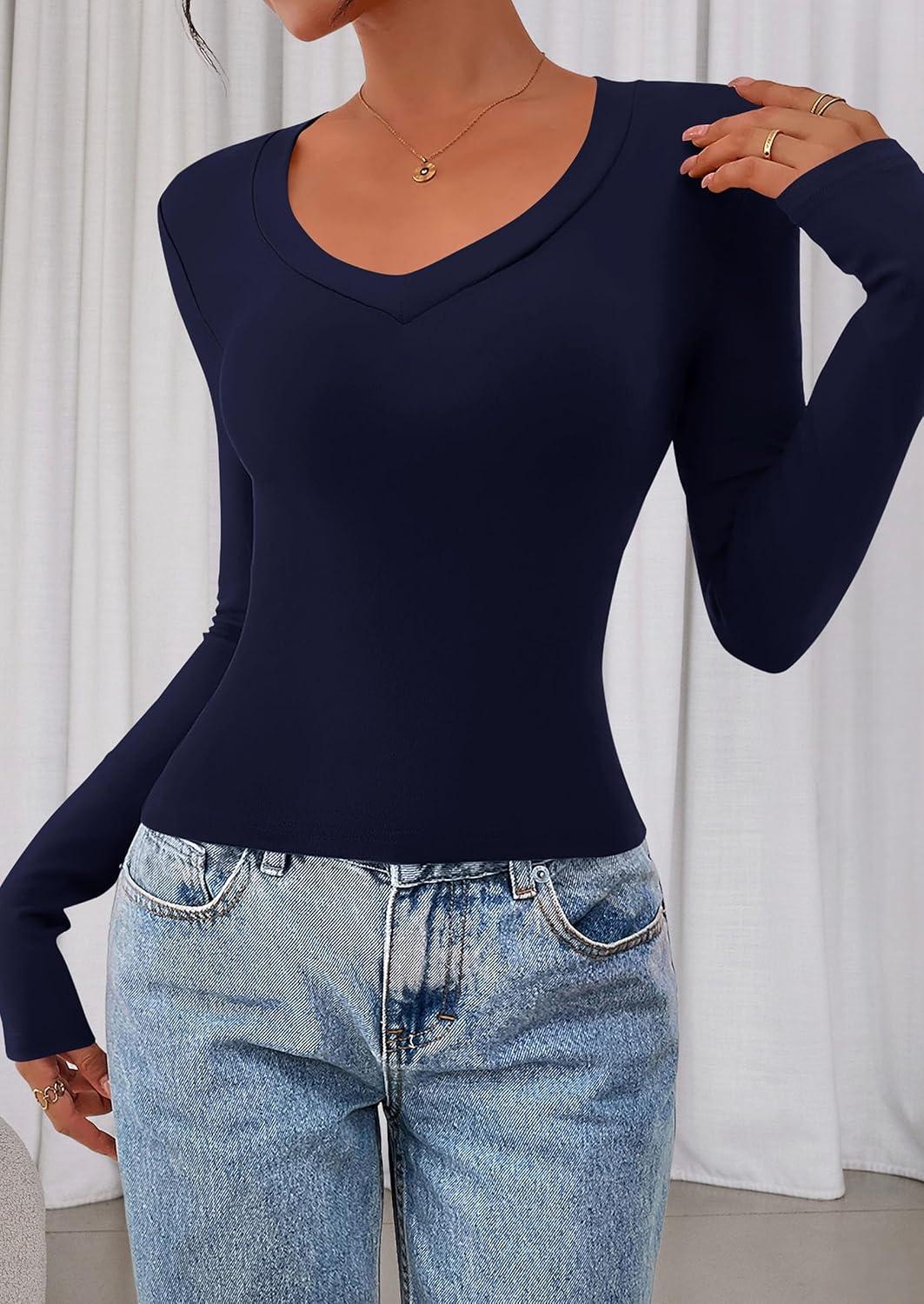 PRETTYGARDEN Womens Long Sleeve T Shirts 2025 Fall Trendy Deep V Neck Slim Fit Basic Crop Tops Casual Going Out Top(Navy Blue)