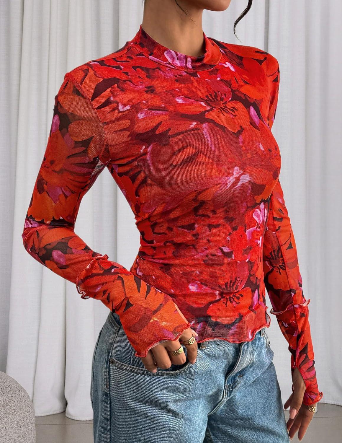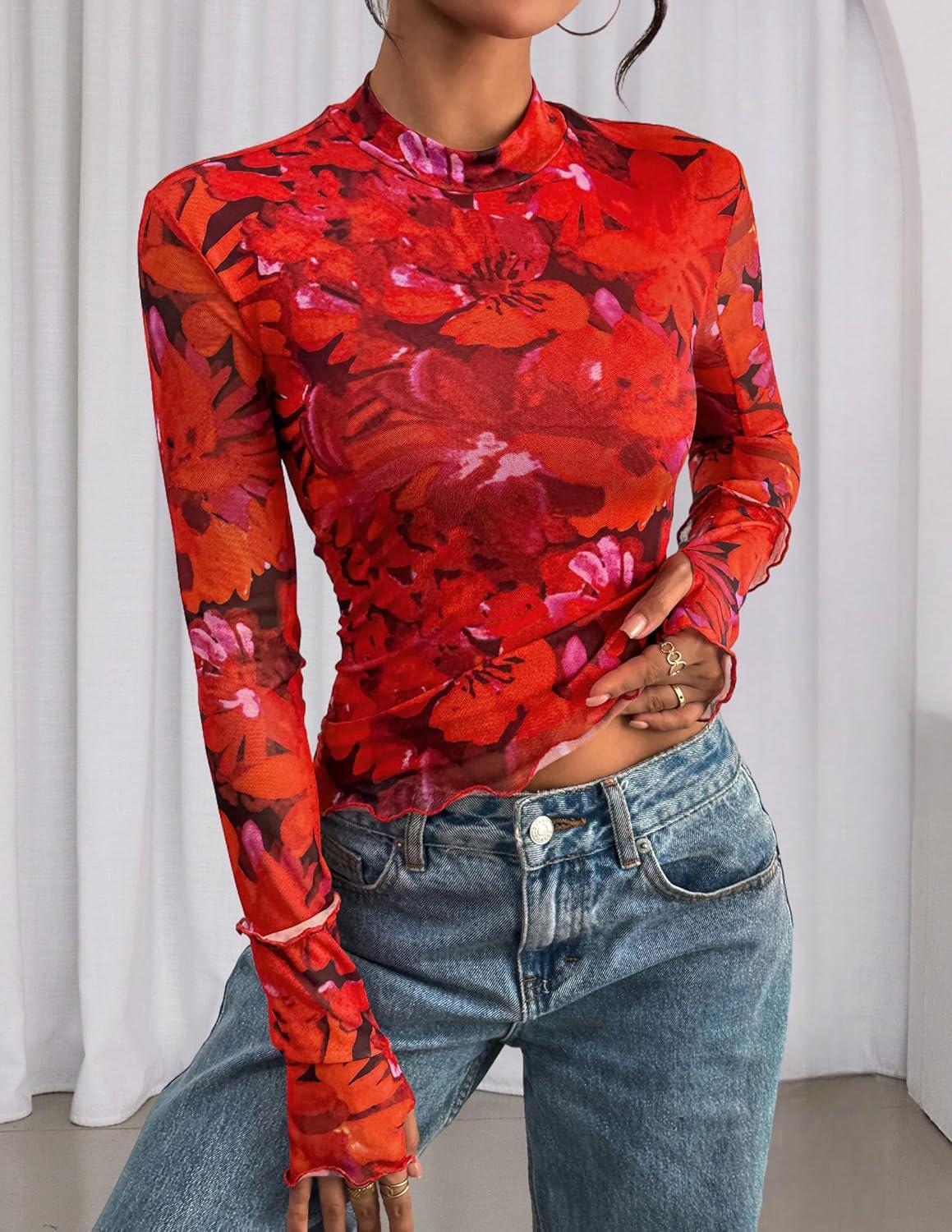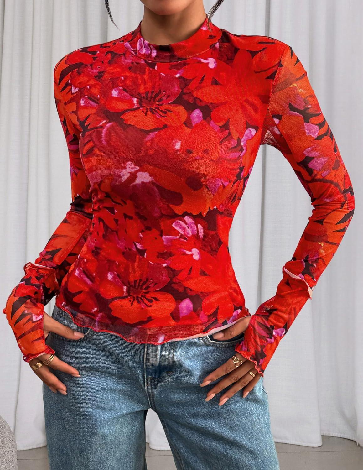 PRETTYGARDEN Womens Mesh Floral Blouses 2025 Fall Clothes Long Sleeve Going Out Tops Fitted Shirts Date Night Outfit(Floral Orange Red)