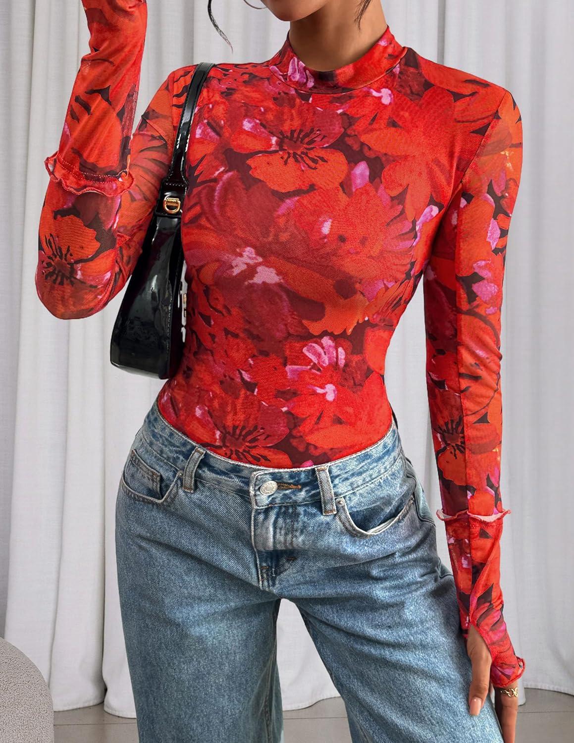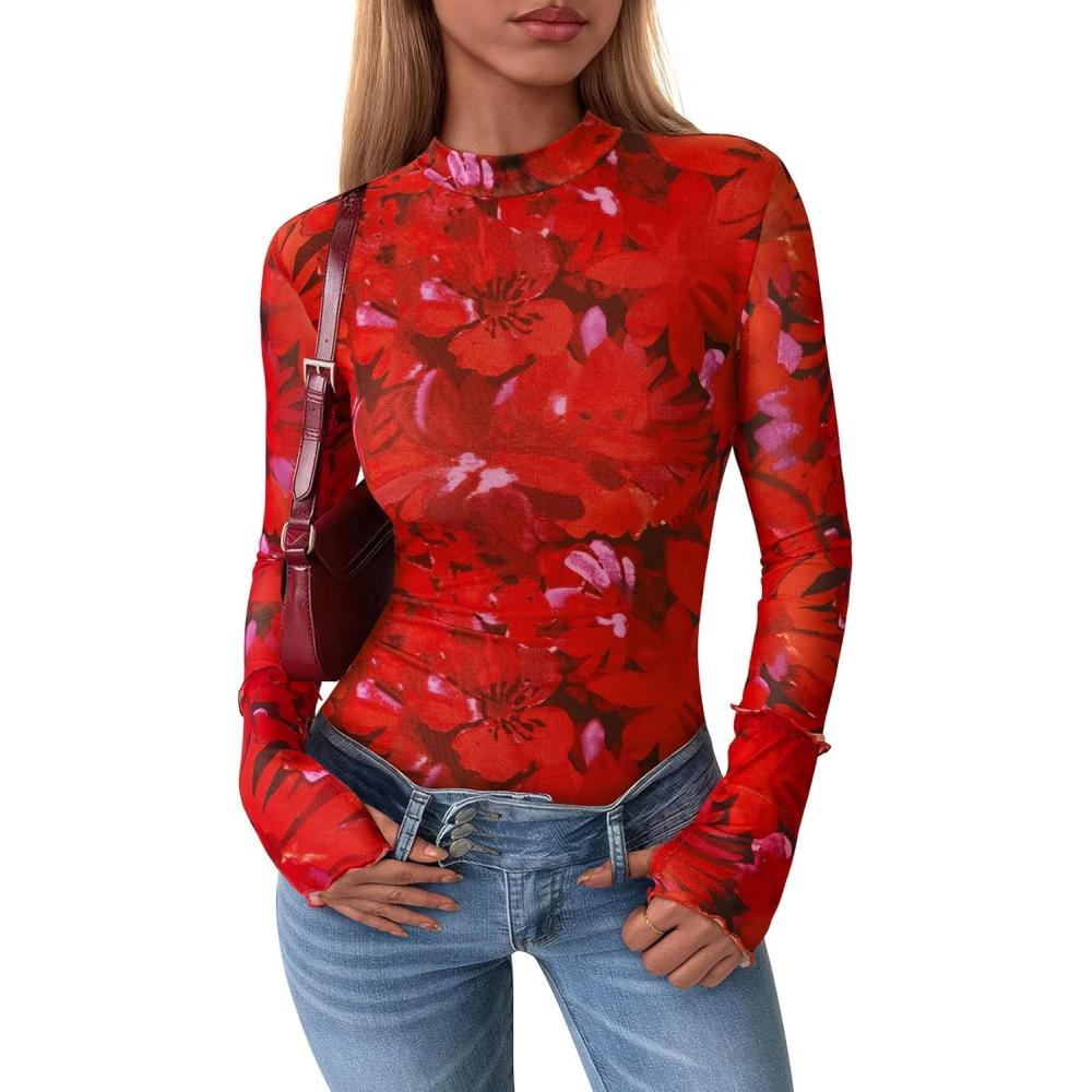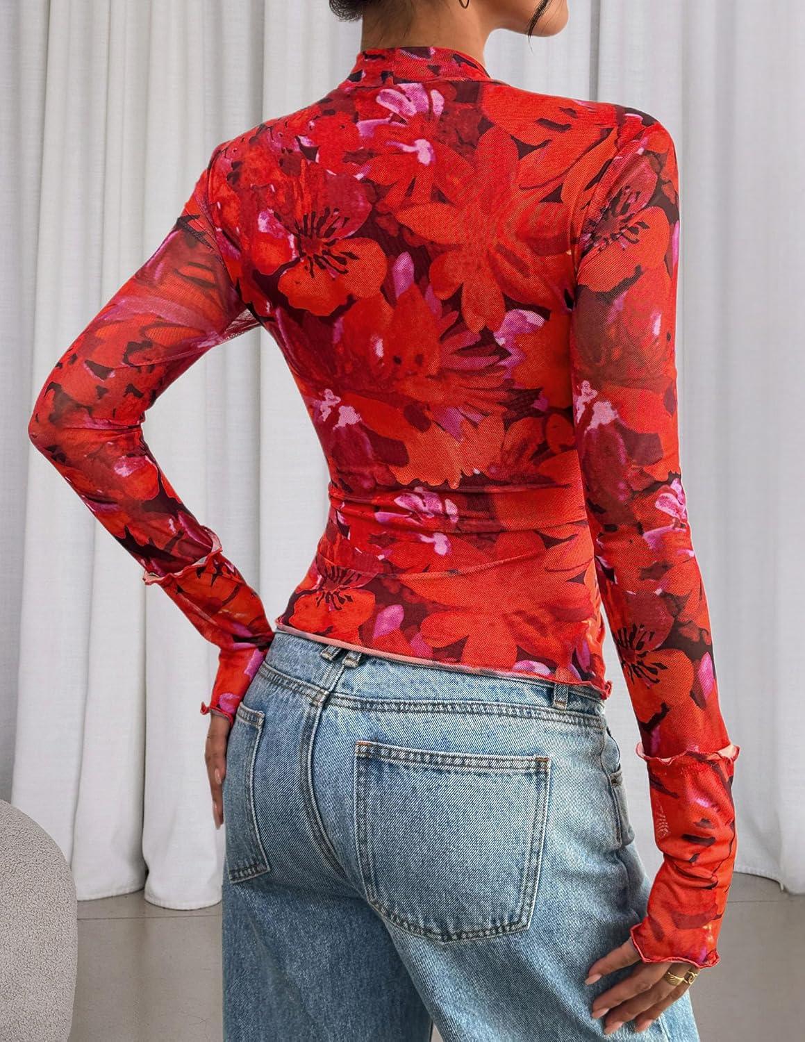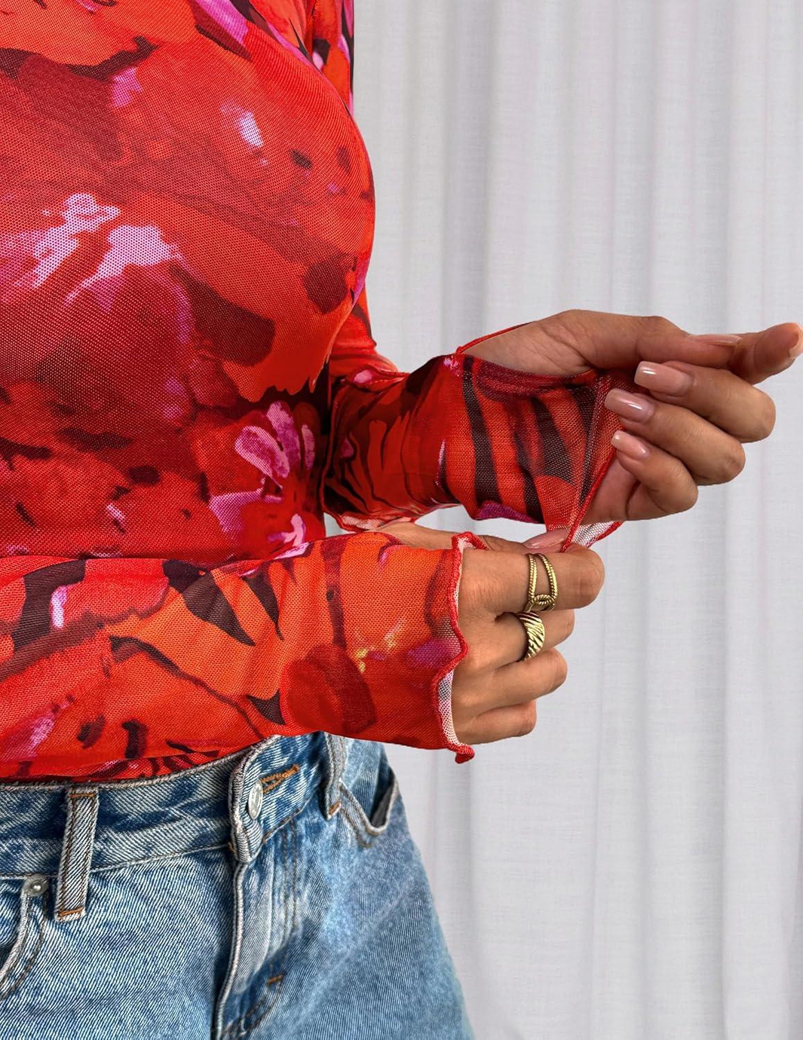 PRETTYGARDEN Womens Mesh Floral Blouses 2025 Fall Clothes Long Sleeve Going Out Tops Fitted Shirts Date Night Outfit(Floral Orange Red)