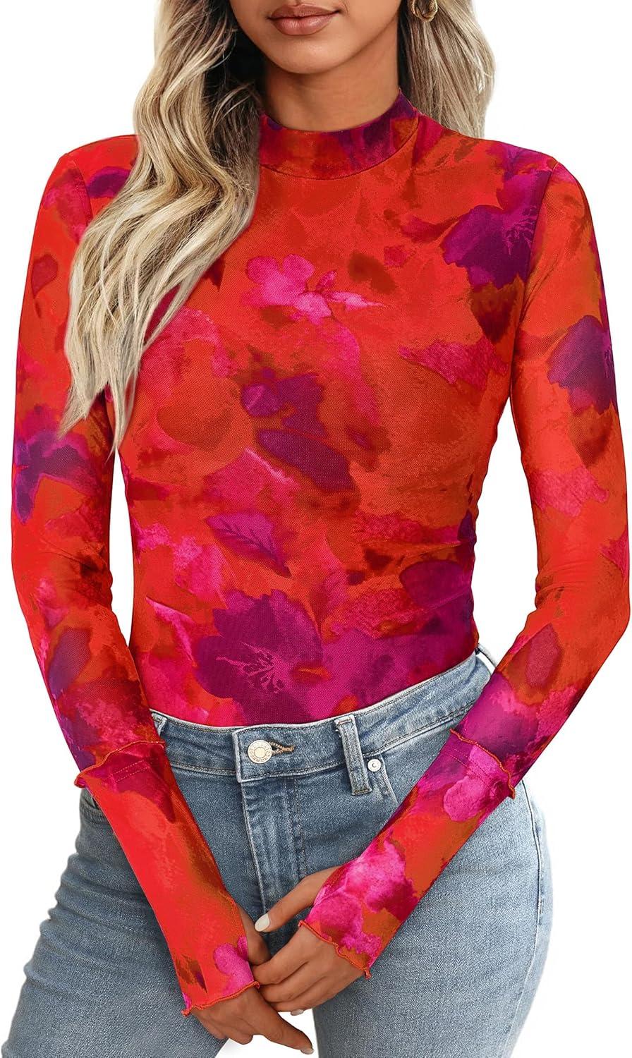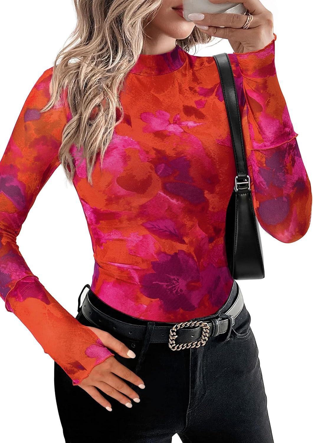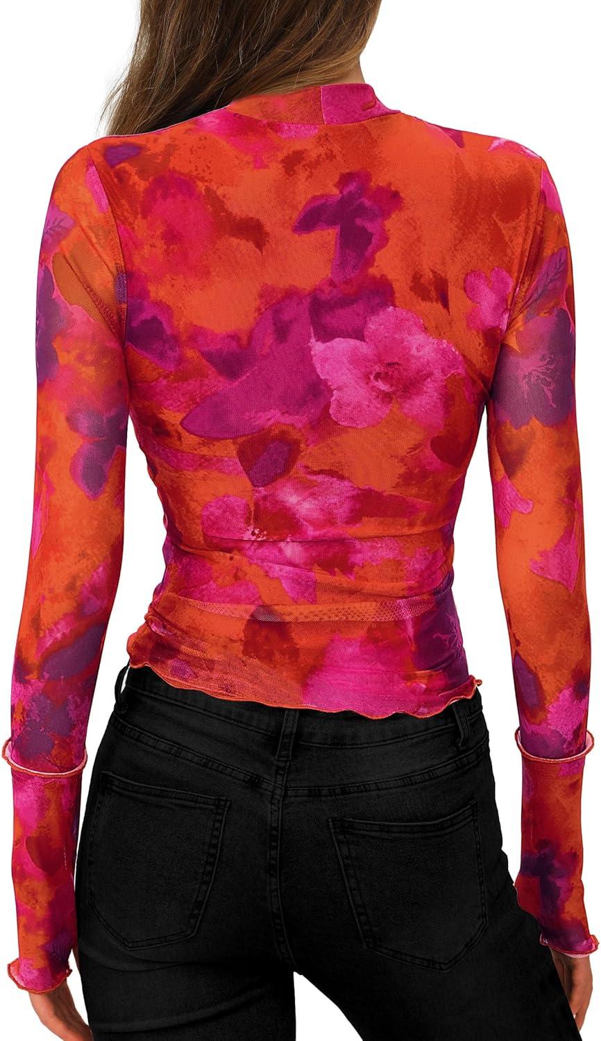 PRETTYGARDEN Womens Mesh Floral Blouses 2025 Fall Clothes Long Sleeve Going Out Tops Fitted Shirts Date Night Outfit(Floral Red Purple)
