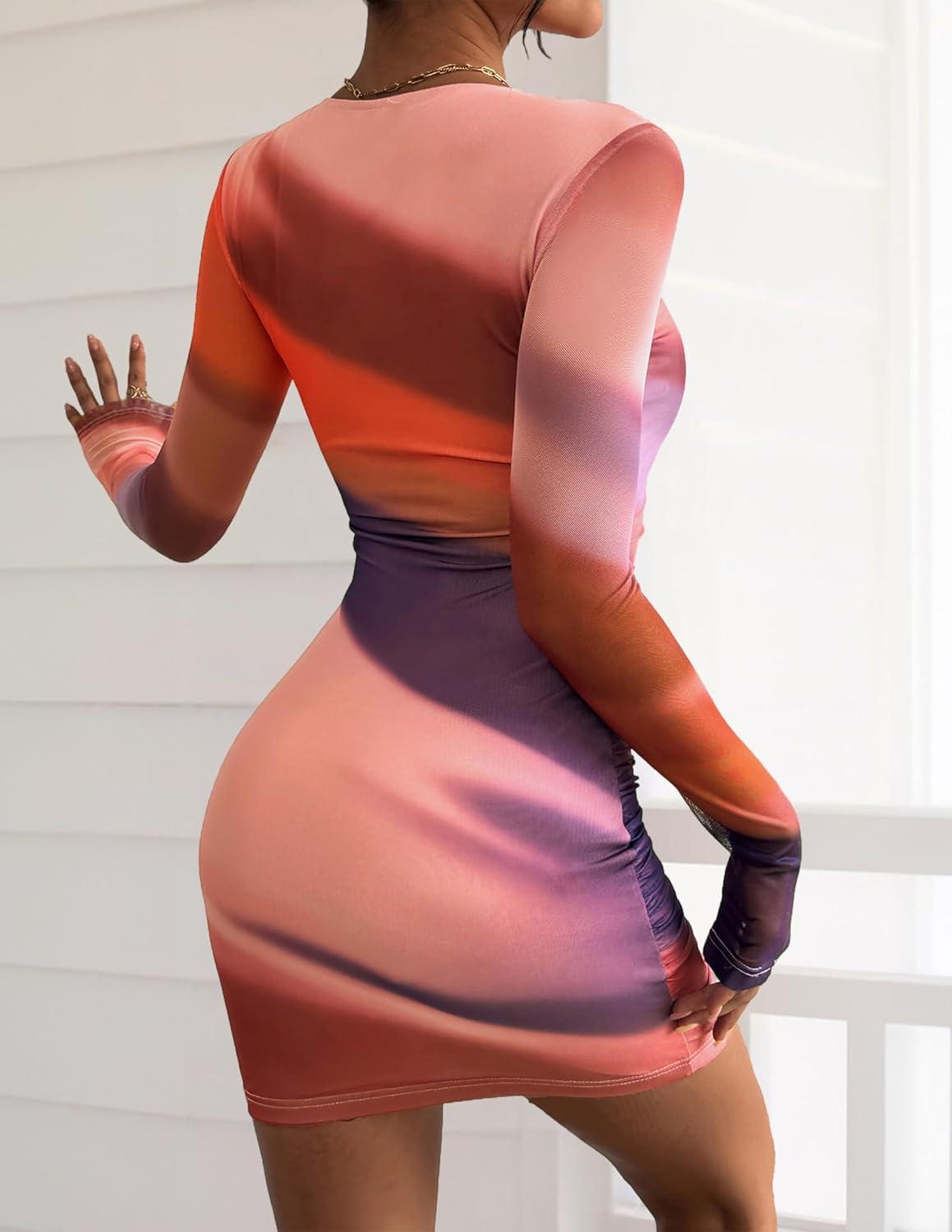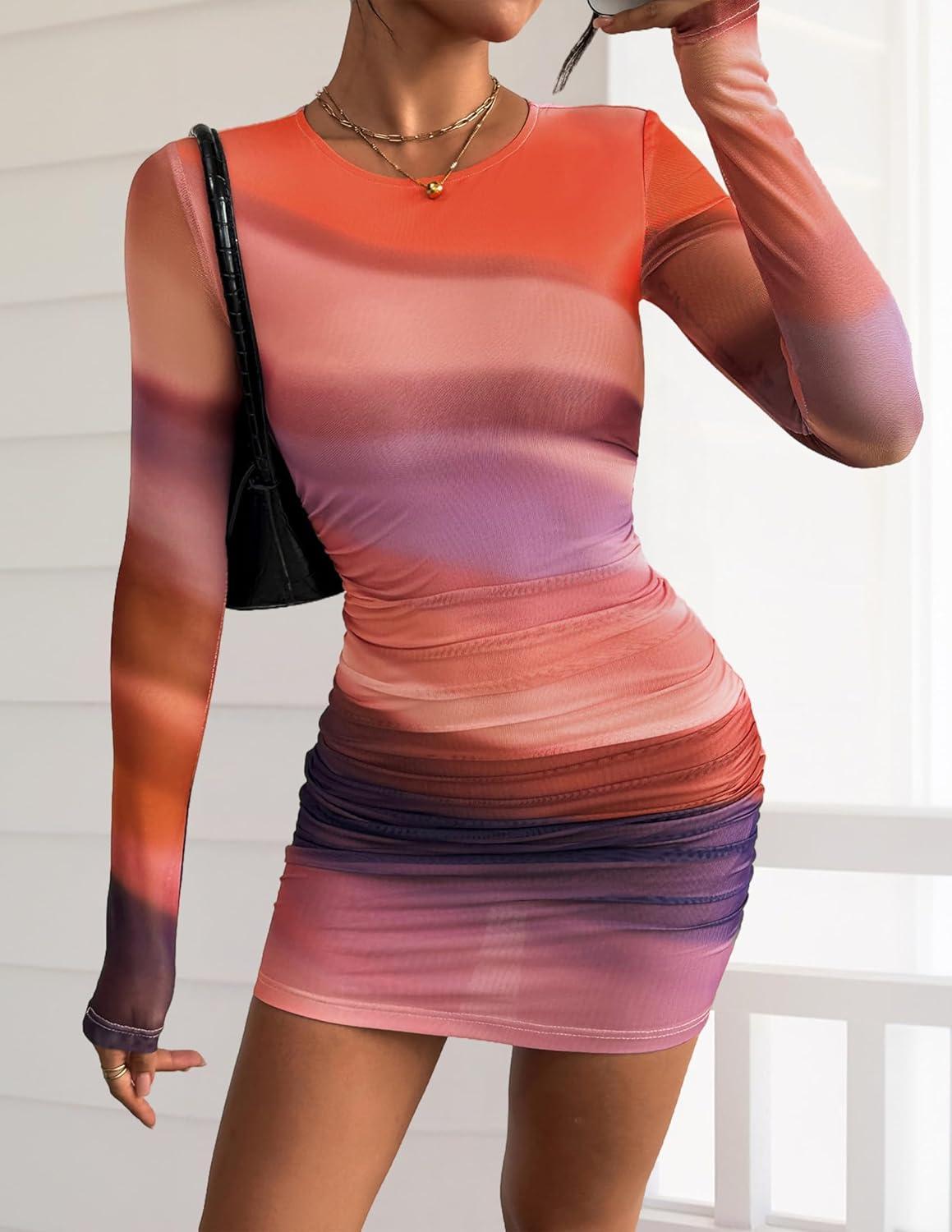PRETTYGARDEN Women’s Mini Dress Fall Outfits 2025 Trendy Tie Dye Print Long Sleeve Homecoming Club Party Bodycon Dresses(Purple Orange)