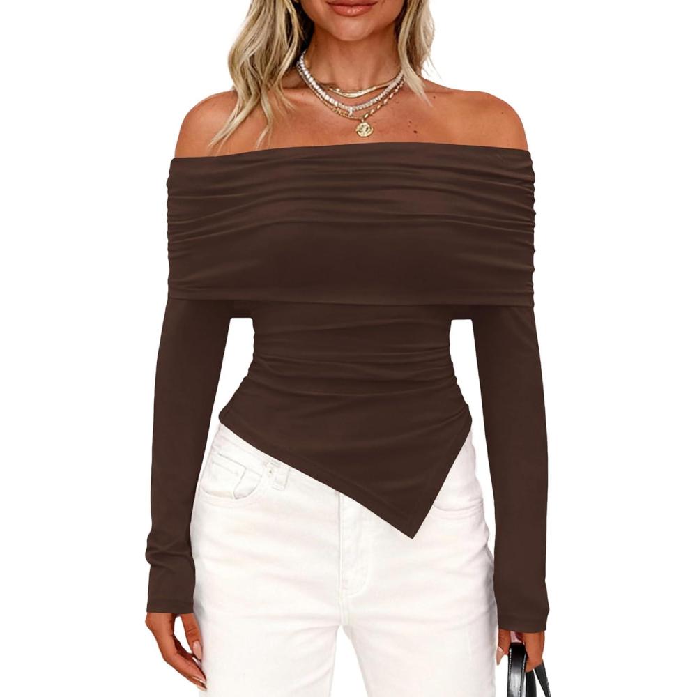 PRETTYGARDEN Women’s Off The Shoulder Tops Spring Fashion 2026 Long Sleeve Shirts Going Out Slim Fitted Blouses Fall Clothes(Brown)