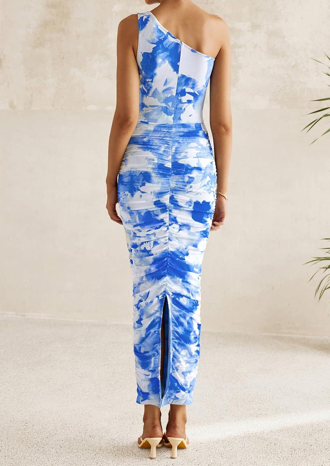 PRETTYGARDEN Women's One Shoulder Bodycon Dresses Summer 2025 Ruched Floral Beach Cocktail Wedding Guest Dress(Blue)