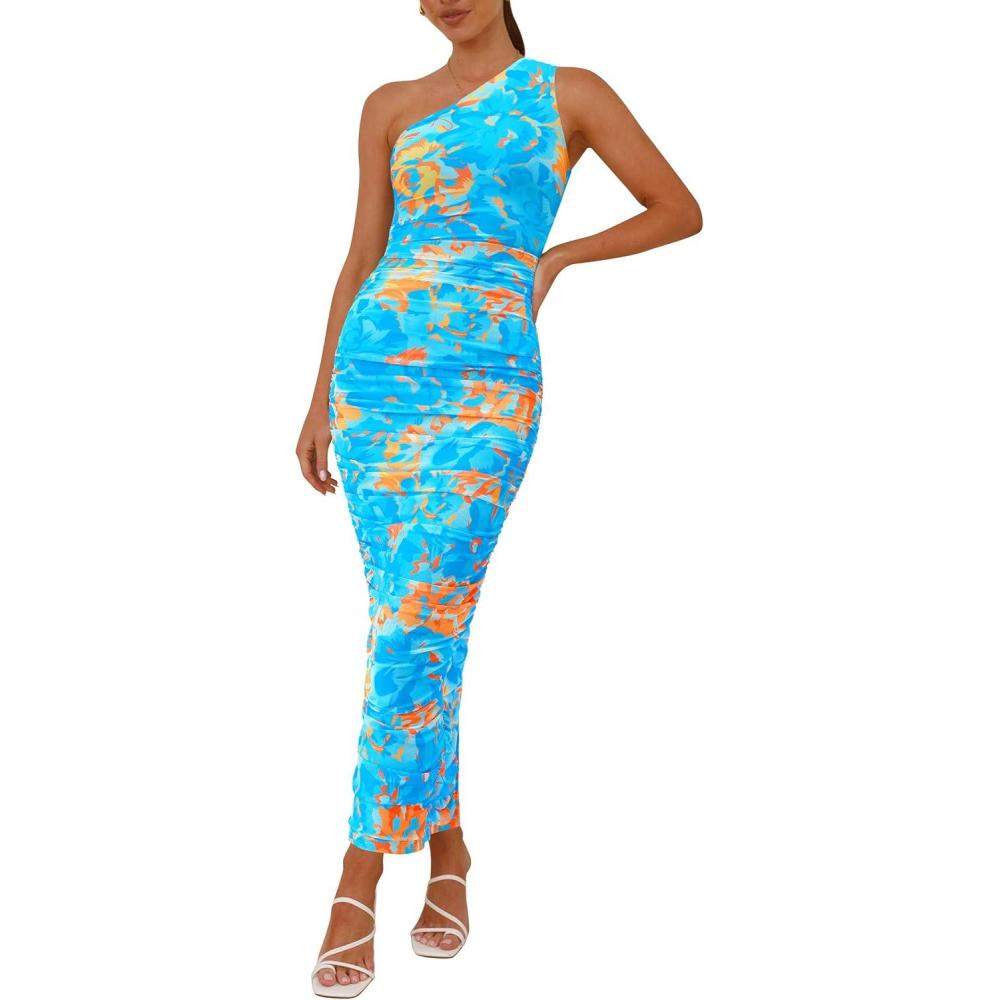 PRETTYGARDEN Women’s One Shoulder Bodycon Dresses Summer 2025 Ruched Floral Beach Cocktail Wedding Guest Dress(Floral Light Blue)