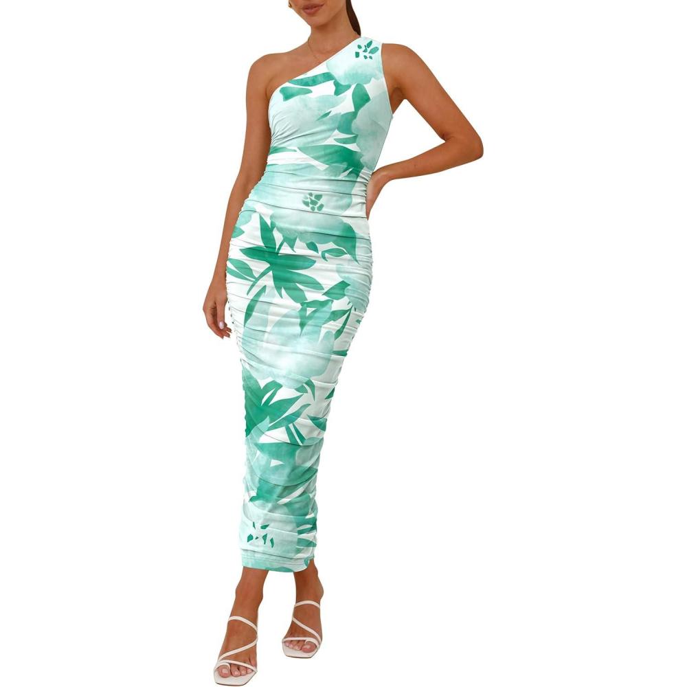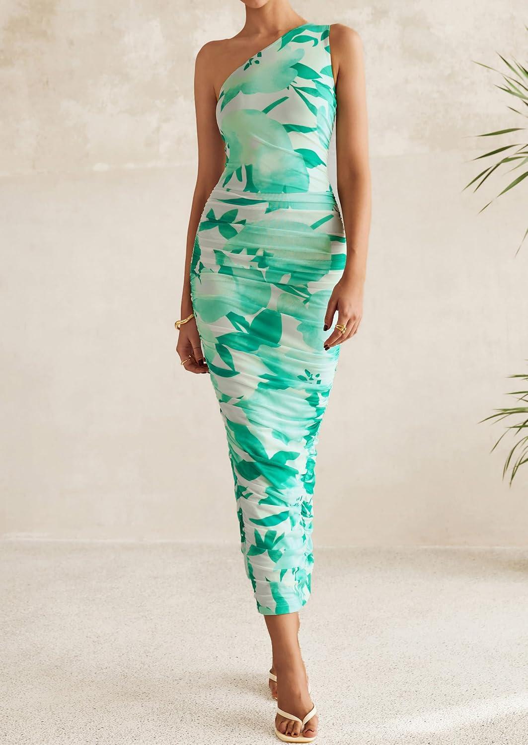 PRETTYGARDEN Women's One Shoulder Bodycon Dresses Summer 2025 Ruched Floral Beach Cocktail Wedding Guest Dress(Green)