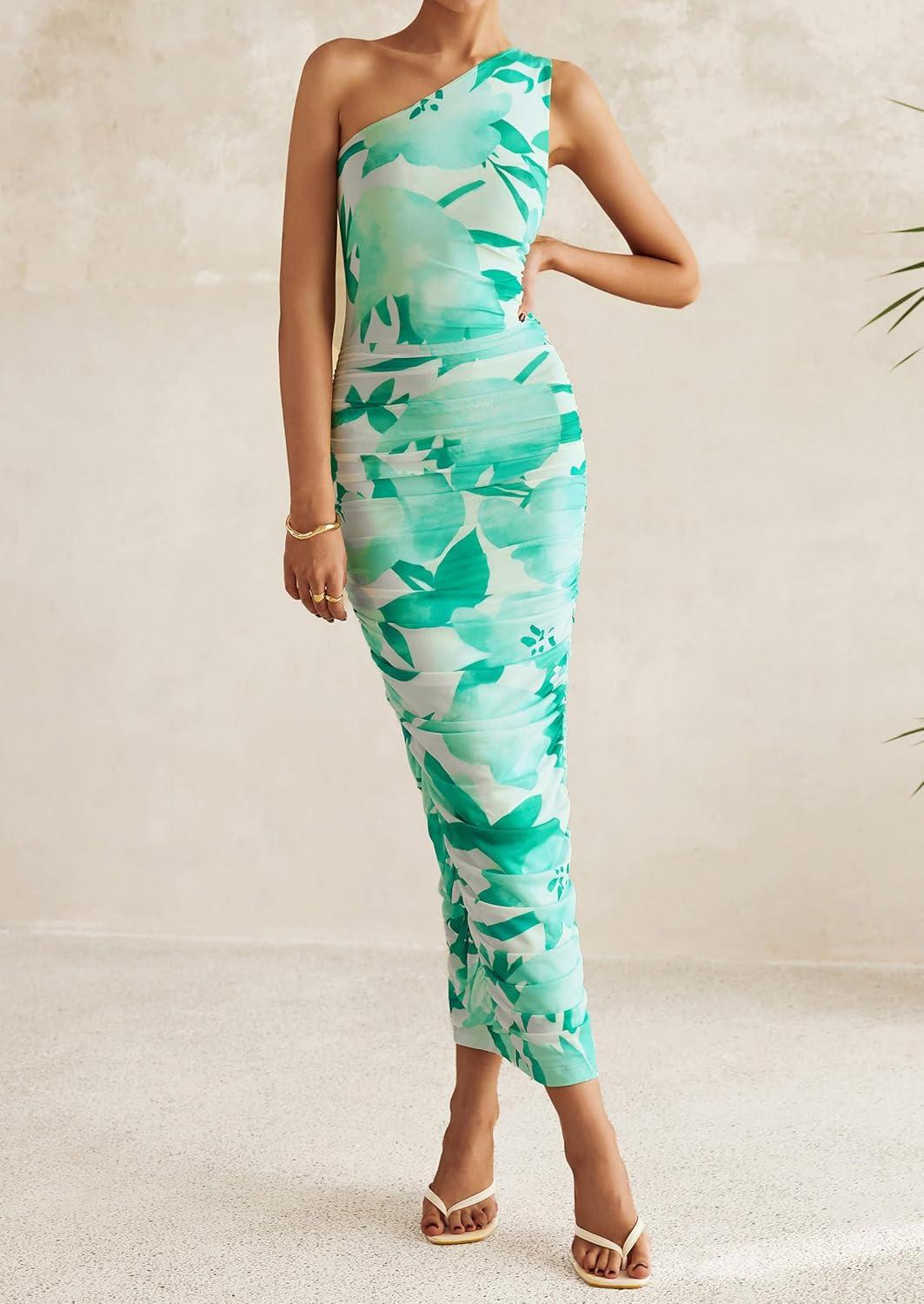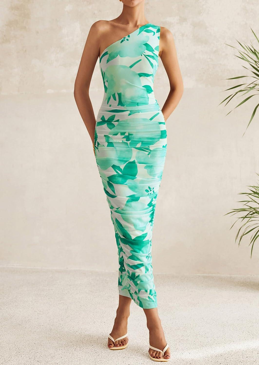 PRETTYGARDEN Women’s One Shoulder Bodycon Dresses Summer 2025 Ruched Floral Beach Cocktail Wedding Guest Dress(Green Floral)