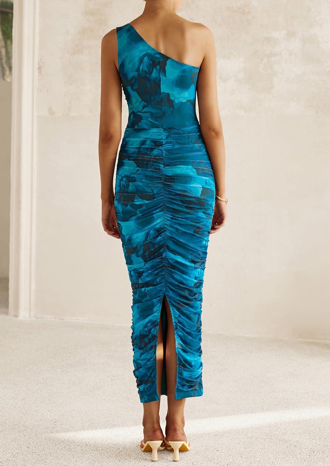 PRETTYGARDEN Women’s One Shoulder Bodycon Dresses Summer 2025 Ruched Floral Beach Cocktail Wedding Guest Dress(Lake Blue Floral)