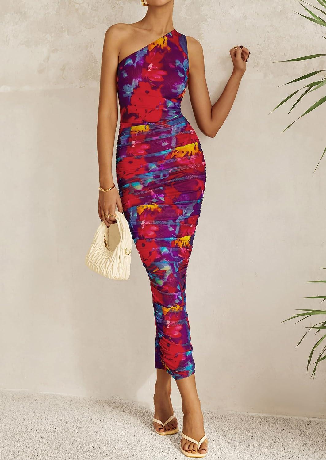 PRETTYGARDEN Women’s One Shoulder Bodycon Dresses Summer 2025 Ruched Floral Beach Cocktail Wedding Guest Dress(Navy Red Flower)