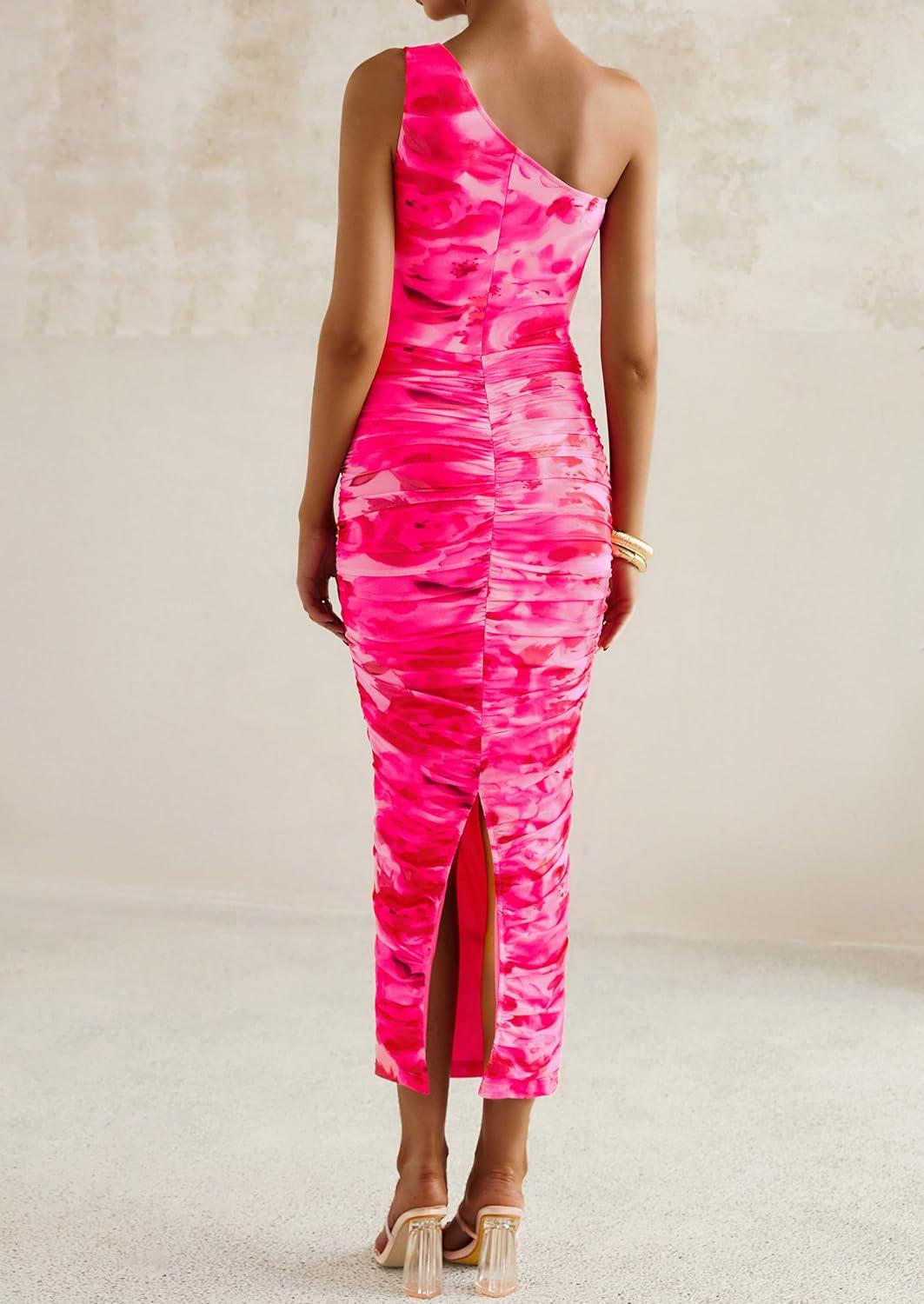 PRETTYGARDEN Women's One Shoulder Bodycon Dresses Summer 2025 Ruched Floral Beach Cocktail Wedding Guest Dress(Pink Floral)