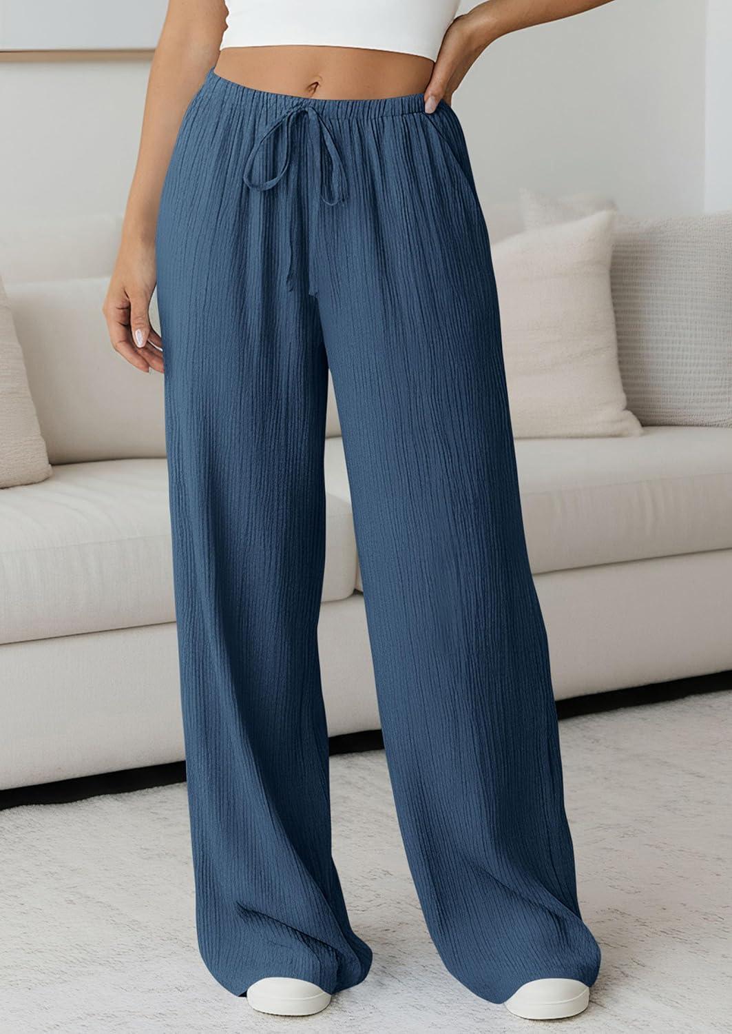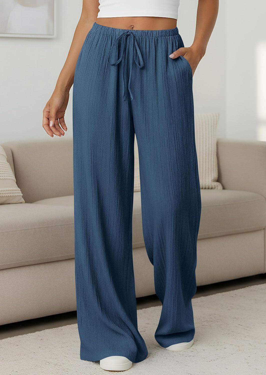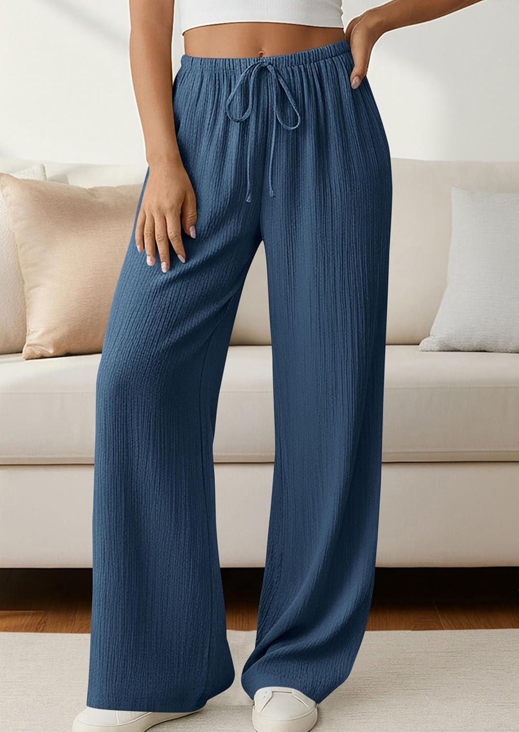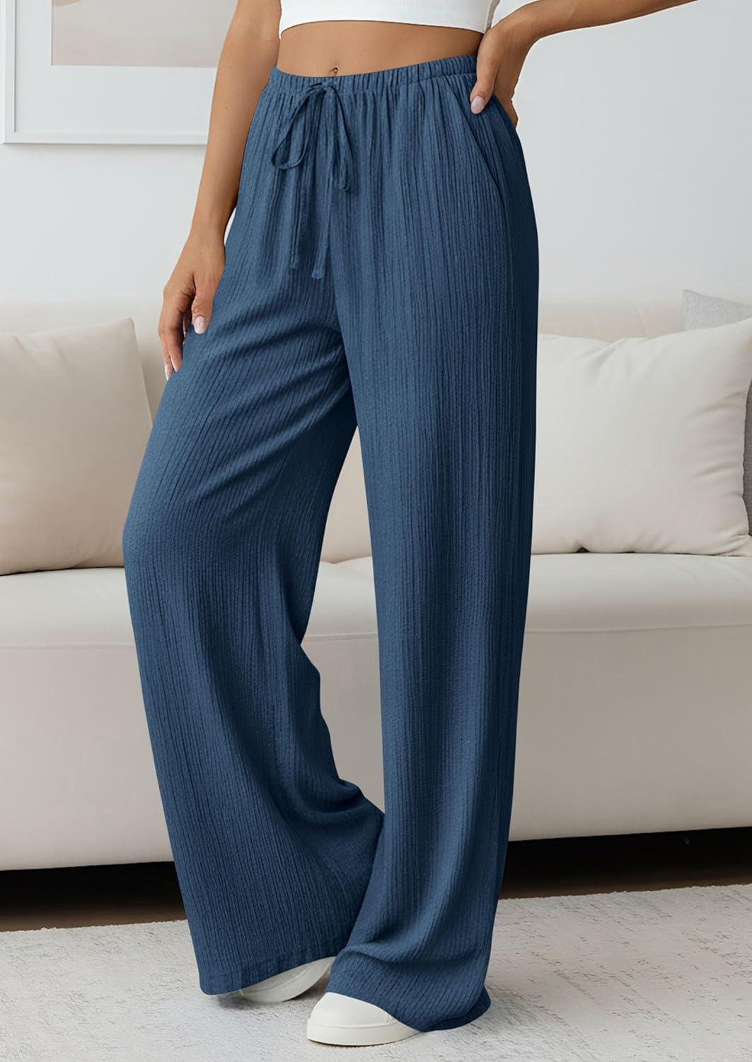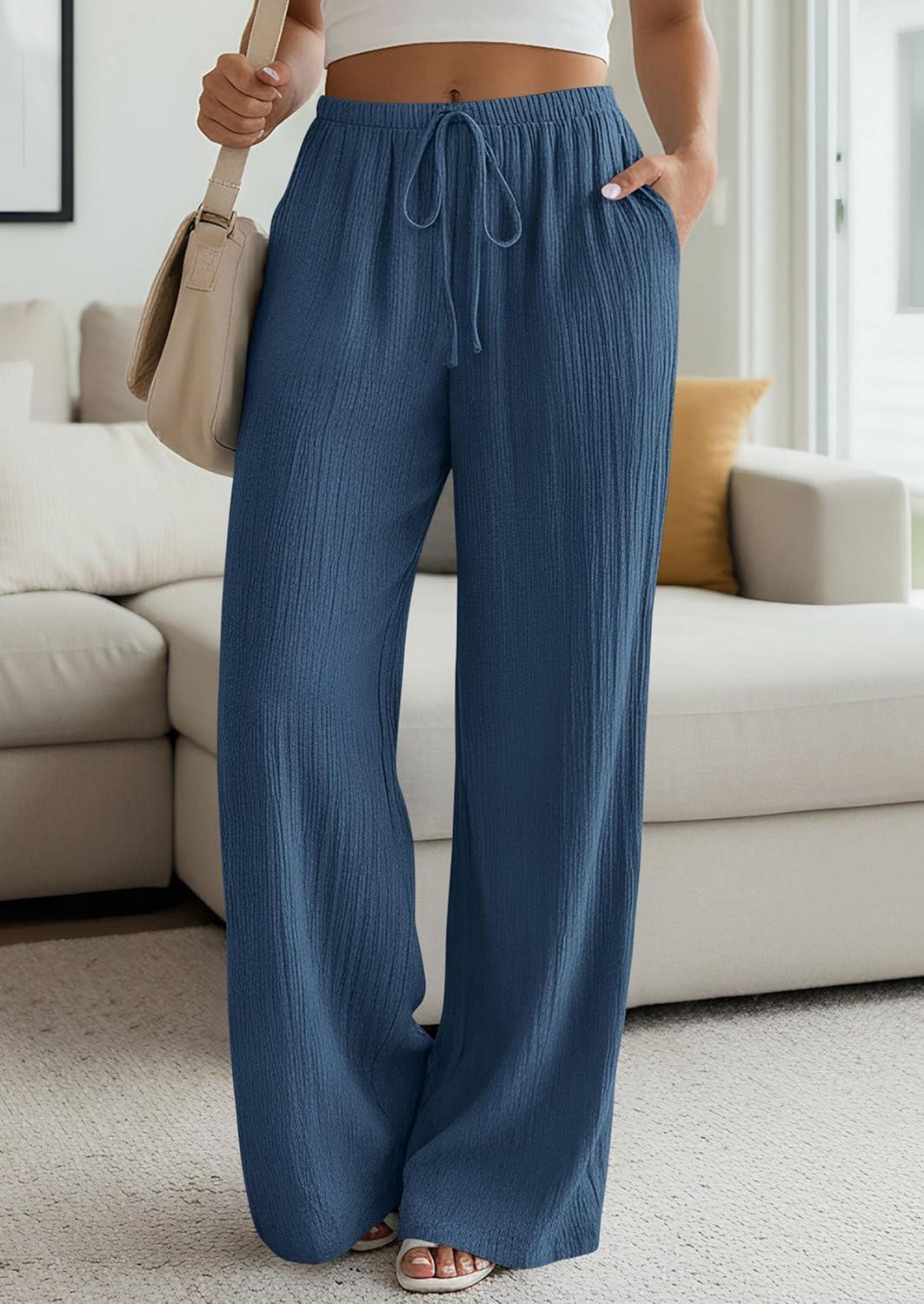 PRETTYGARDEN Womens Palazzo Pants Summer Fashion 2026 High Waisted Wide Leg Drawstring Flowy Beach Trousers with Pockets(Dark Blue)