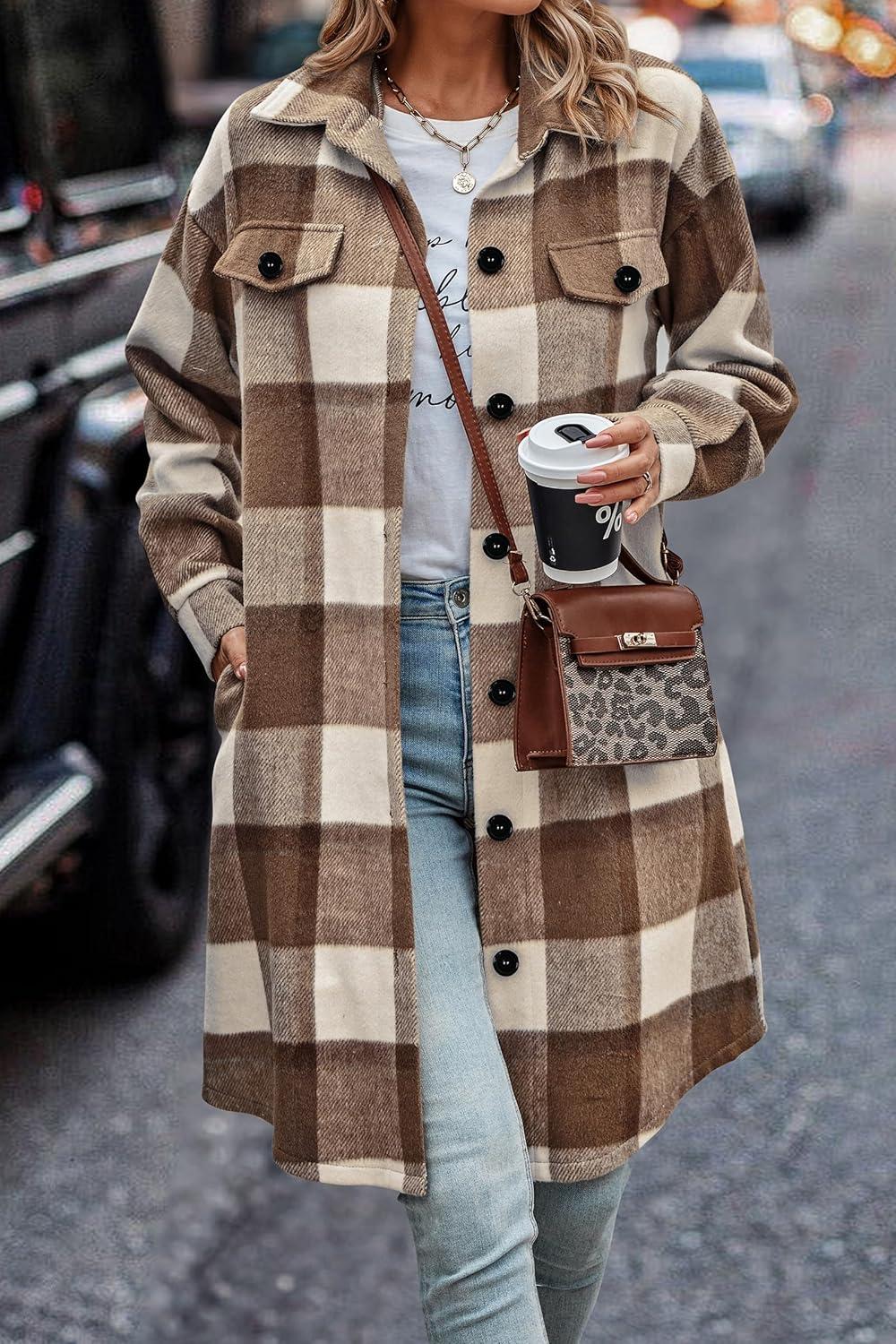 PRETTYGARDEN Womens Plaid Shacket Jacket Fall Fashion 2025 Long Sleeve Button Up Flannel Shirt Winter Clothing Woolen Coats(Plaid Brown)