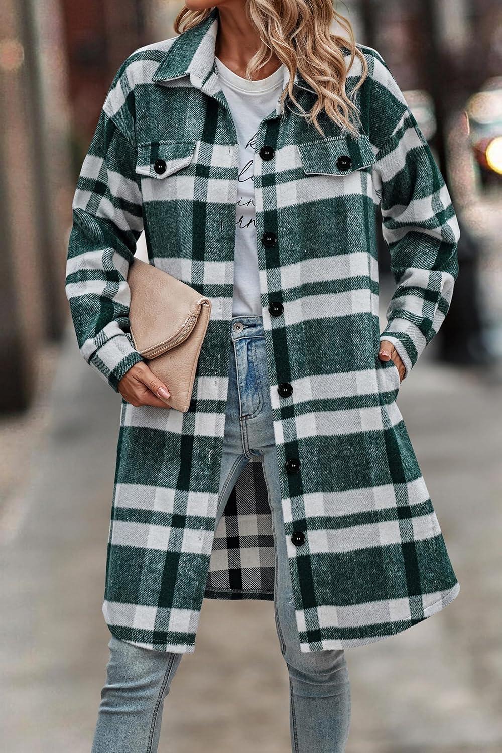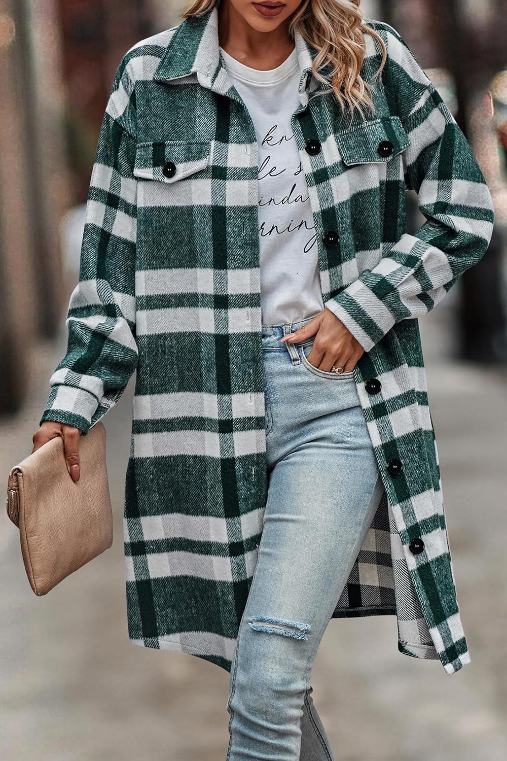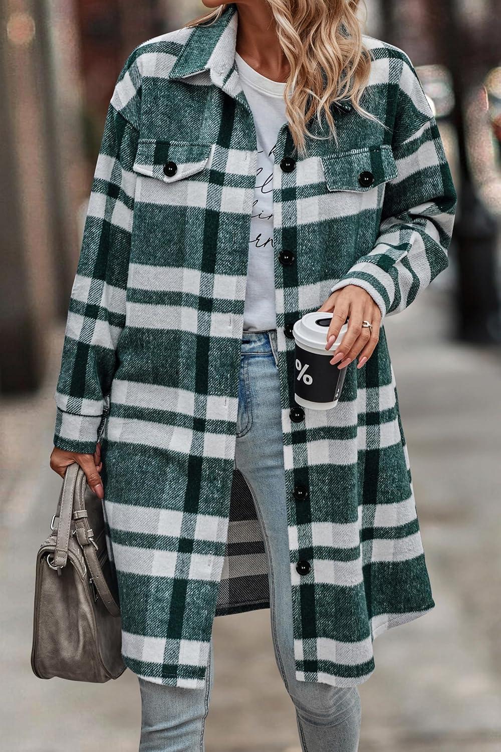 PRETTYGARDEN Womens Plaid Shacket Jacket Fall Fashion 2025 Long Sleeve Button Up Flannel Shirt Winter Clothing Woolen Coats(Plaid Dark Green)