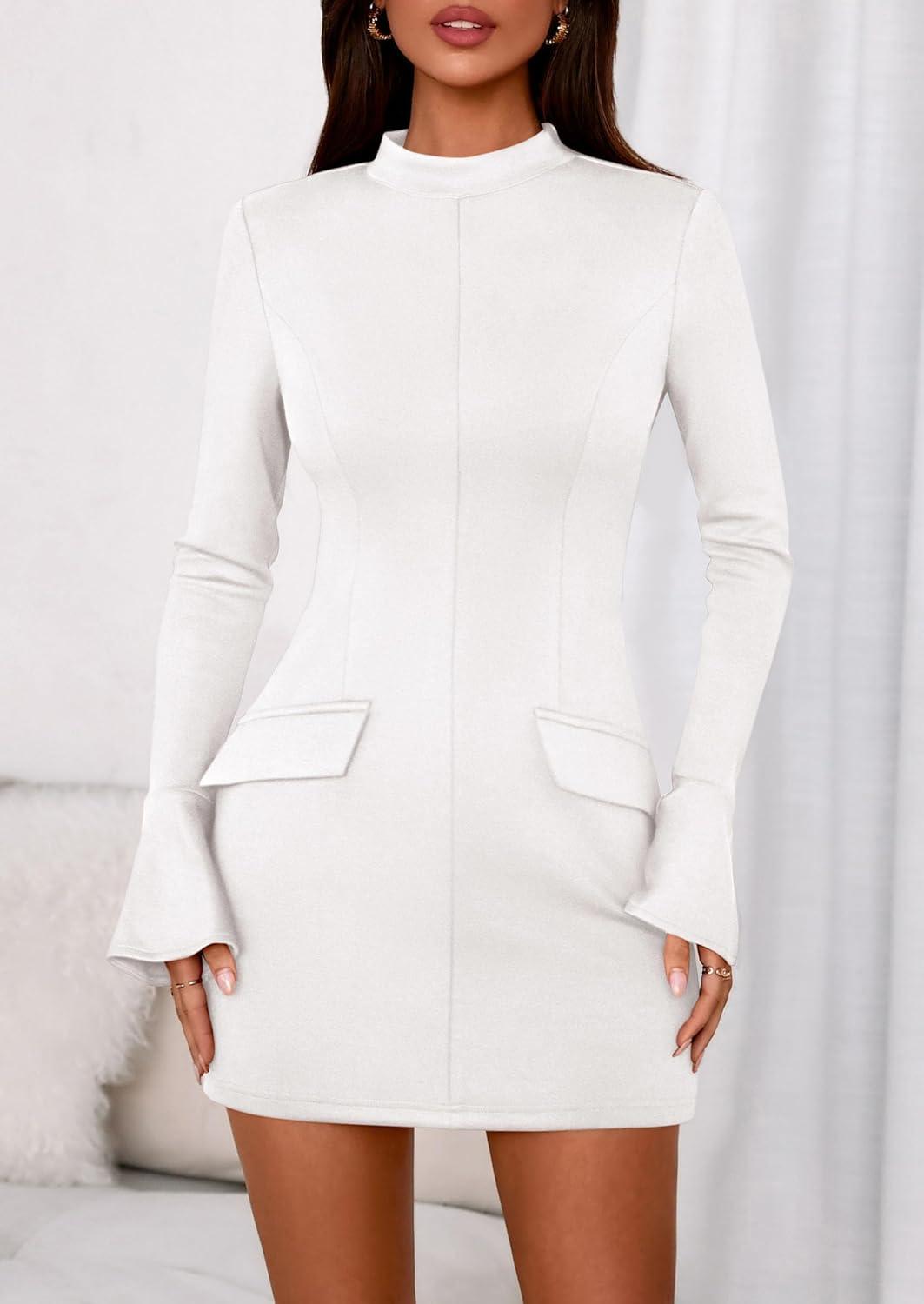 PRETTYGARDEN Womens Short Formal Dresses 2025 Fall Long Sleeve Mock Neck Elegant Cocktail Party Club Bodycon Mini Dress(White)