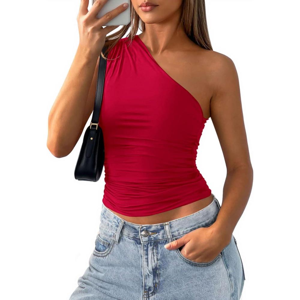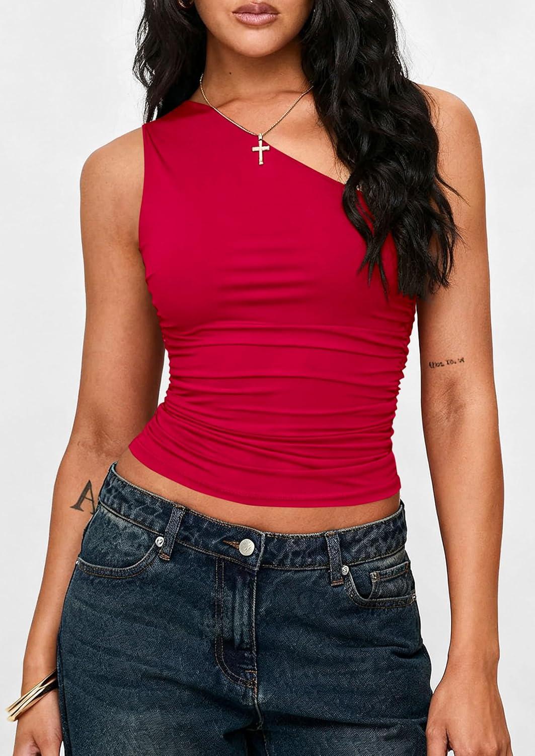 PRETTYGARDEN Womens Sleeveless One Shoulder Tank Top Ruched Slim Fit Shirts Basic Crop Y2k Tops 2026 Spring Fashion Clothing(Red)