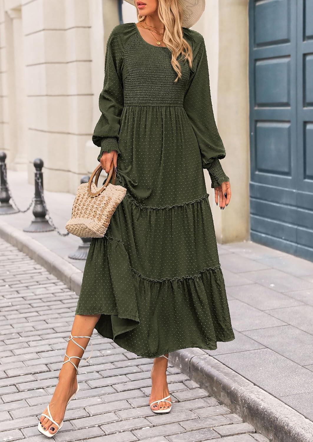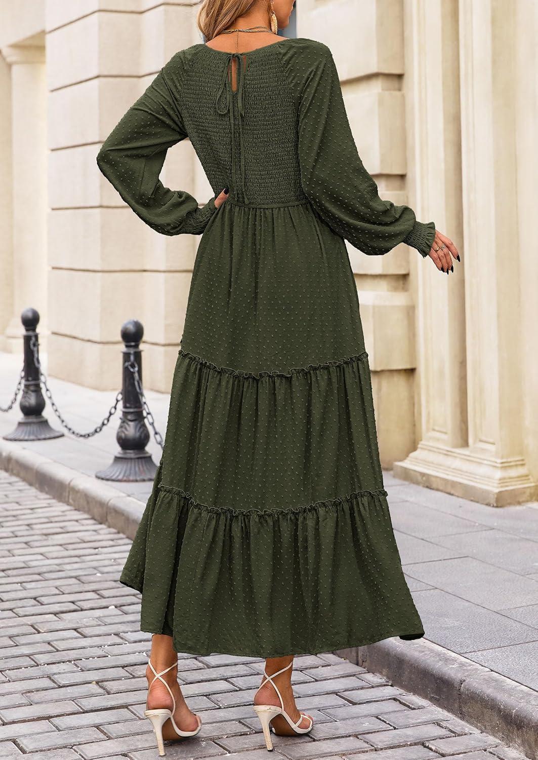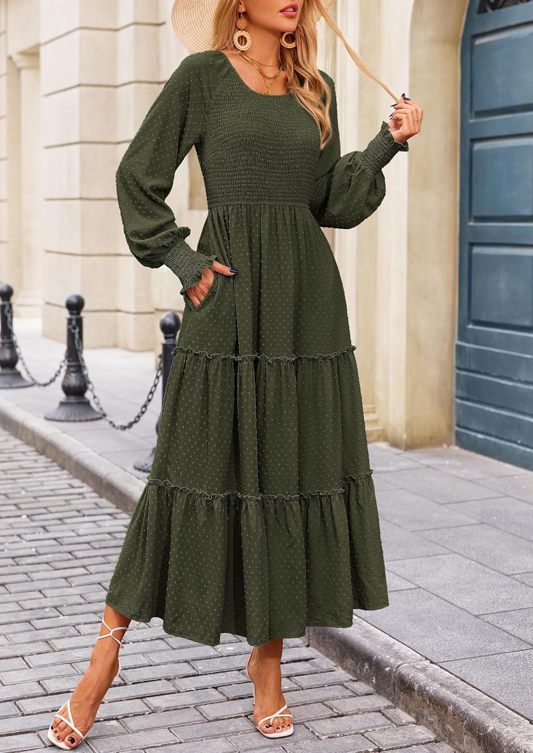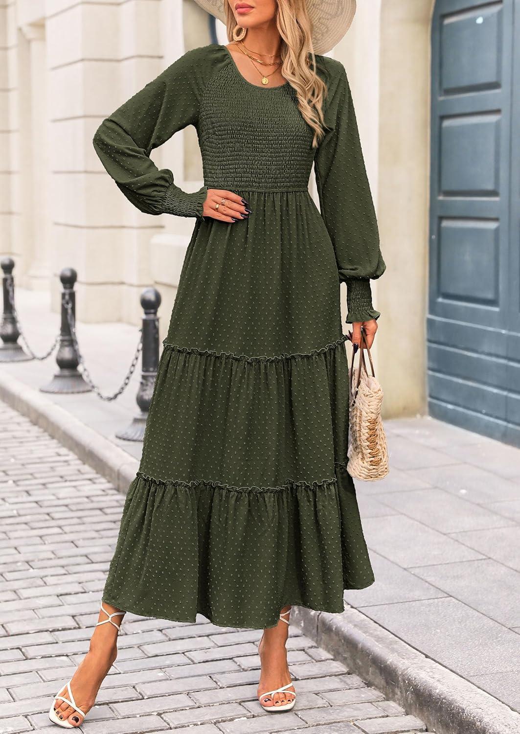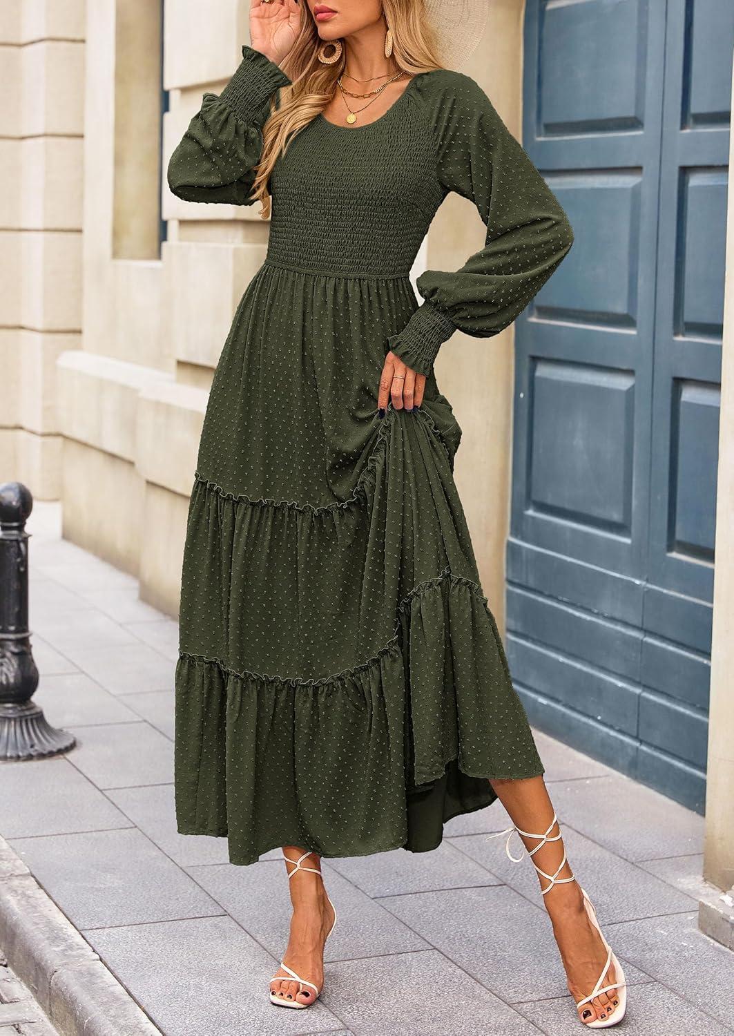 PRETTYGARDEN Women's Smocked Maxi Dress 2025 Fall Casual Long Sleeve Swiss Dot Ruffle Long Flowy Wedding Guest Dresses(Army Green)