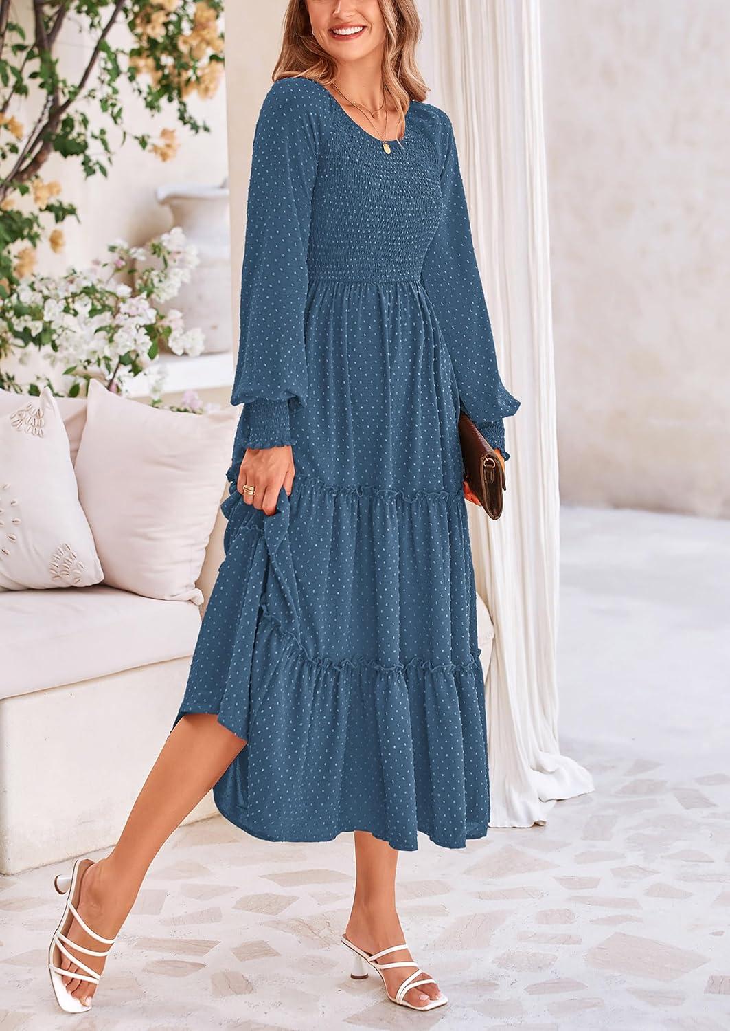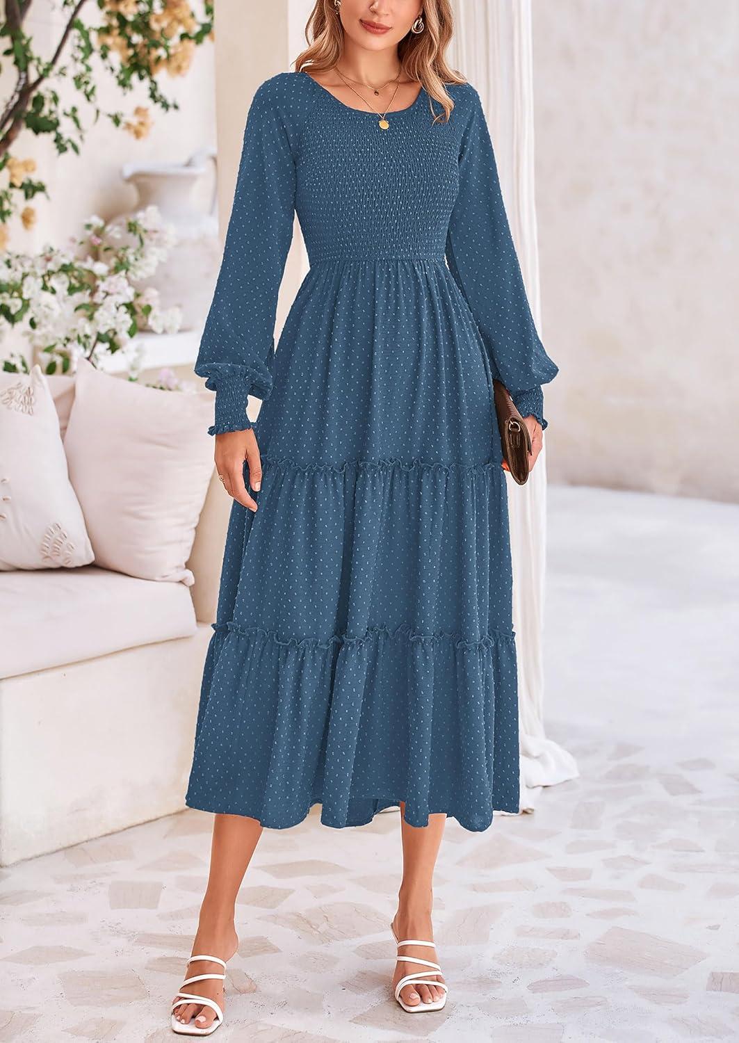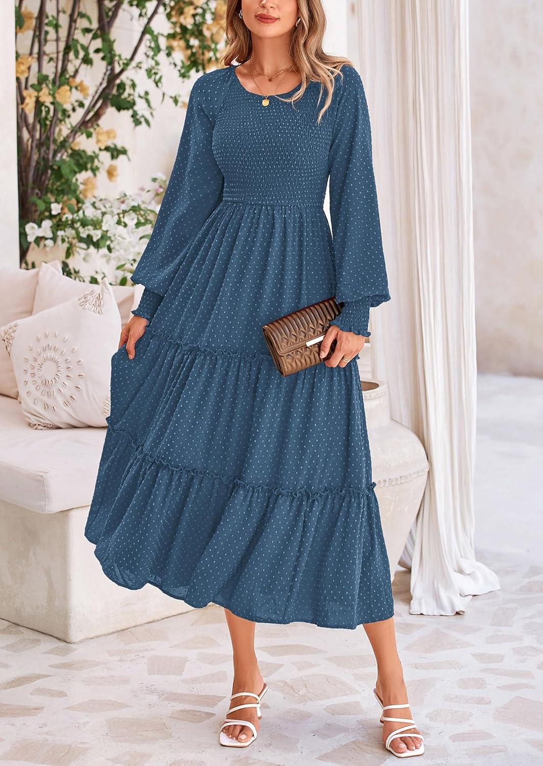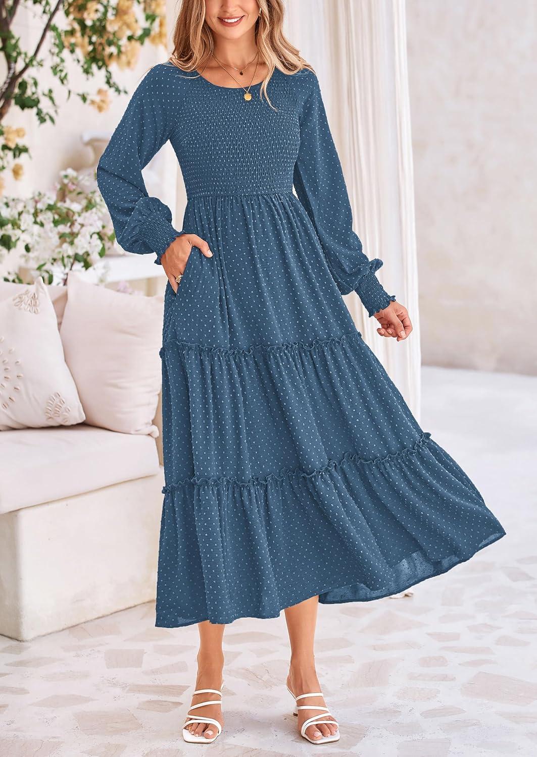 PRETTYGARDEN Women's Smocked Maxi Dress 2025 Fall Casual Long Sleeve Swiss Dot Ruffle Long Flowy Wedding Guest Dresses(Dark Blue)