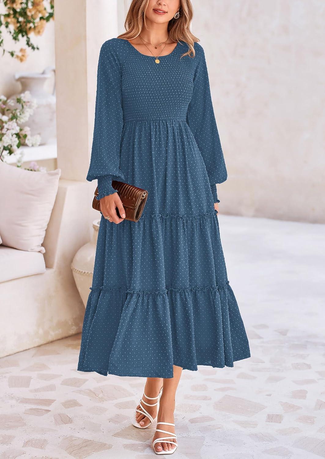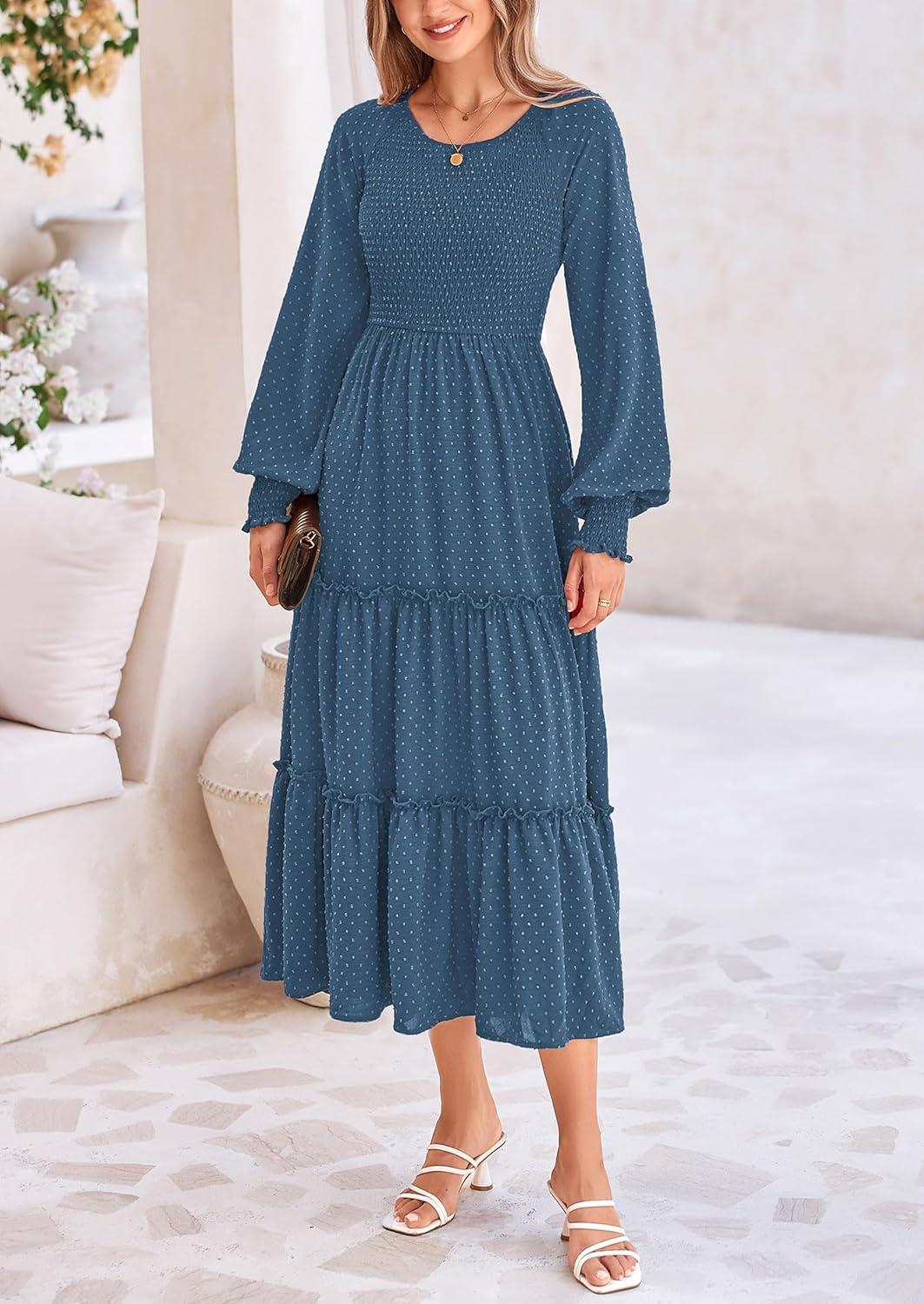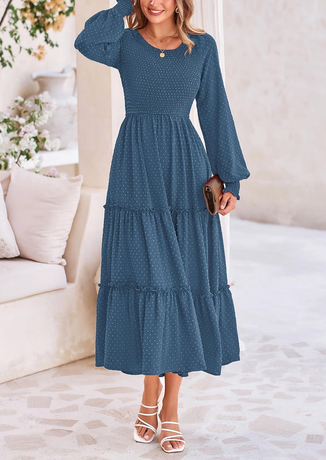PRETTYGARDEN Women’s Smocked Maxi Dress 2025 Fall Casual Long Sleeve Swiss Dot Ruffle Long Flowy Wedding Guest Dresses(Grey Blue)