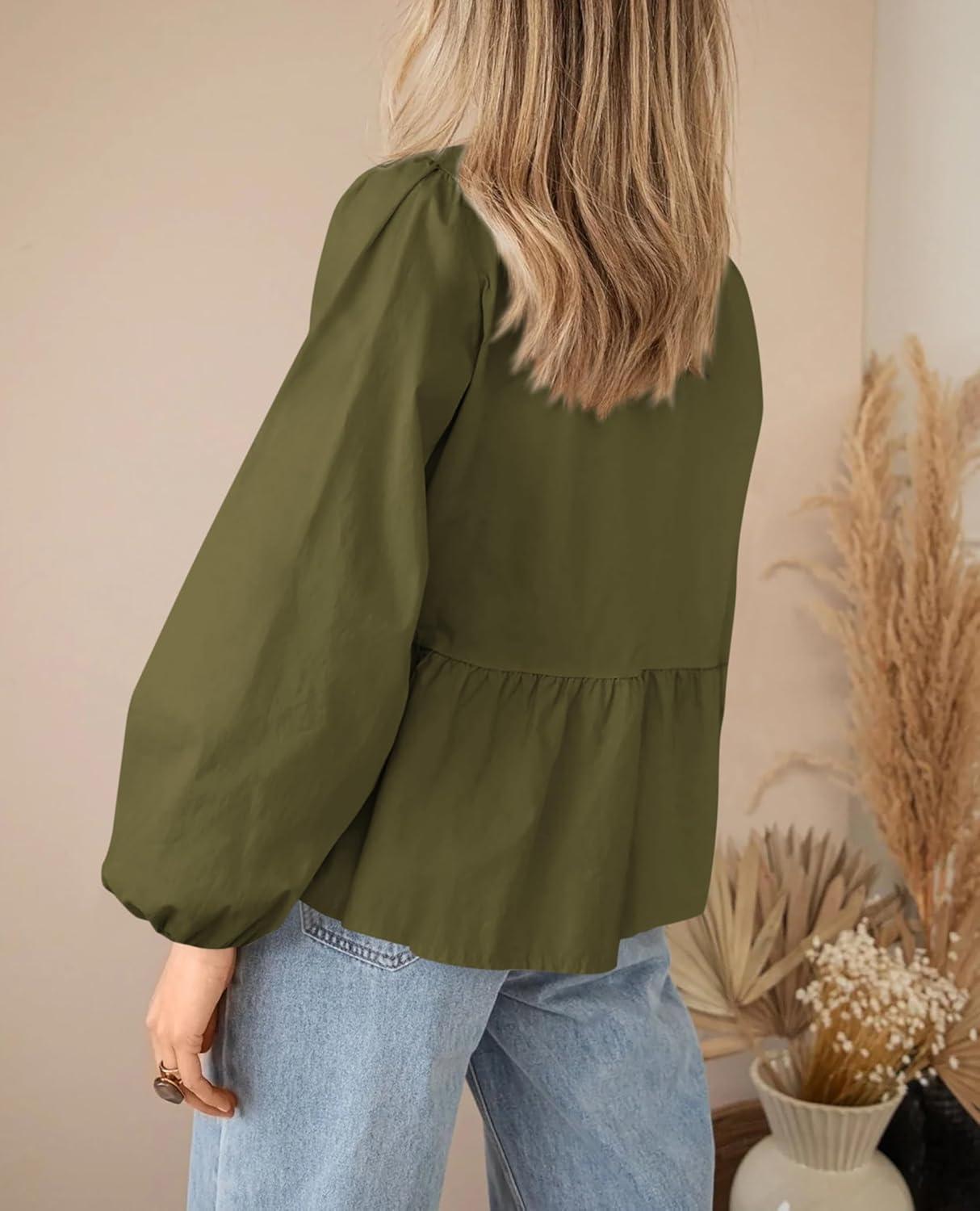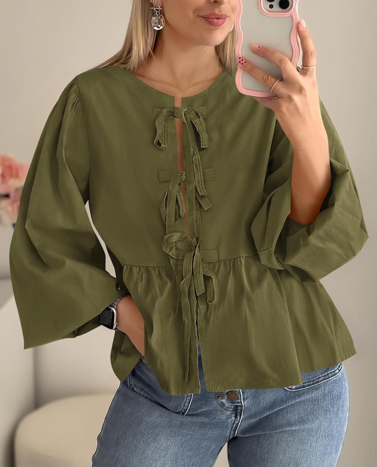 PRETTYGARDEN Women's Spring Fall Babydoll Peplum Blouse Shirt Puff Long Sleeve Bow Tie Front Trendy Cute Y2K Going Out Tops(Solid Army Green)