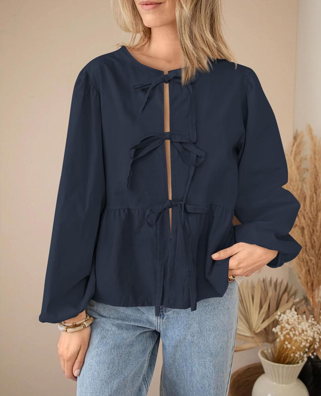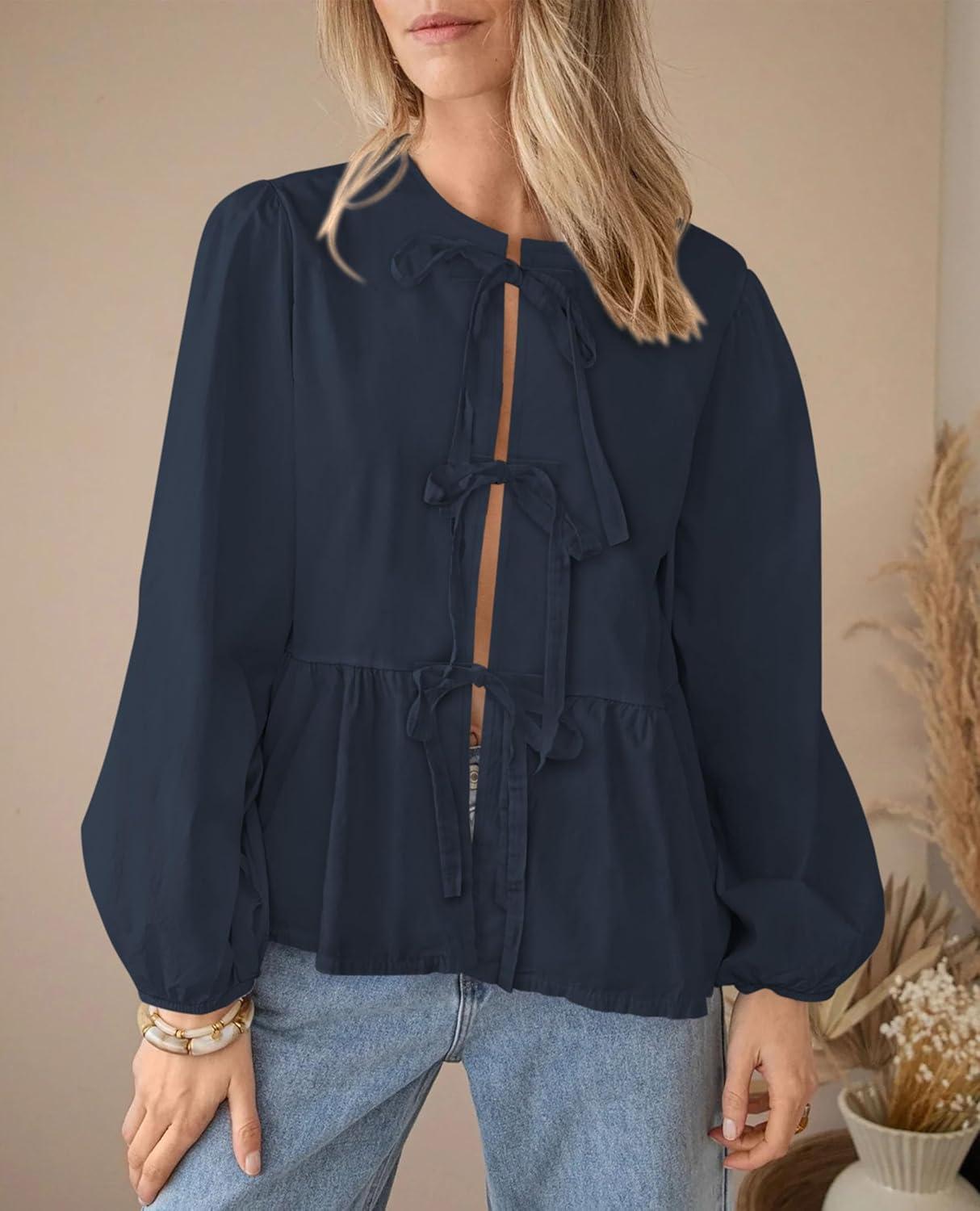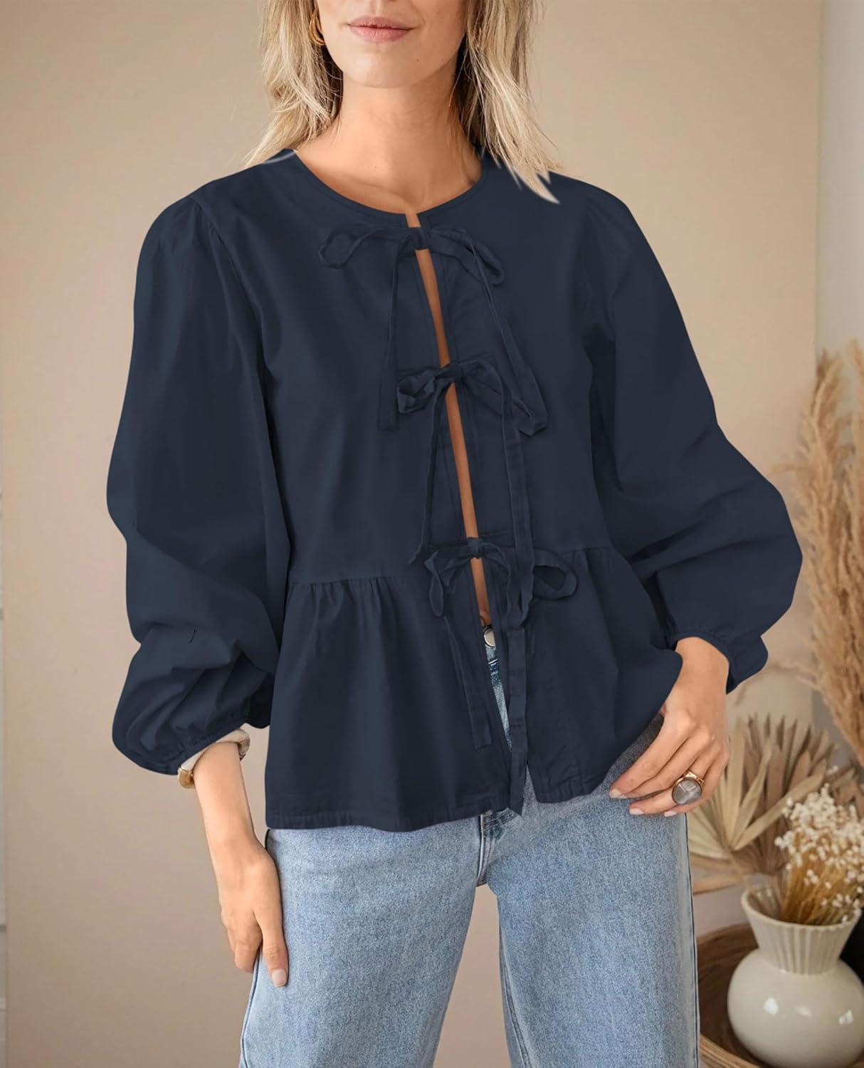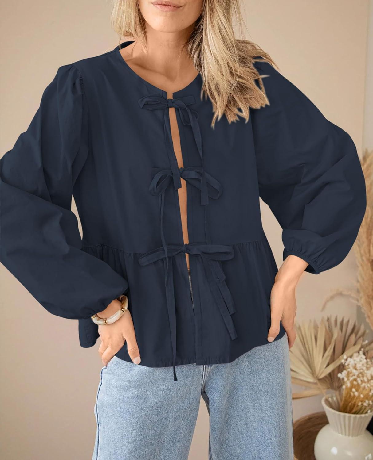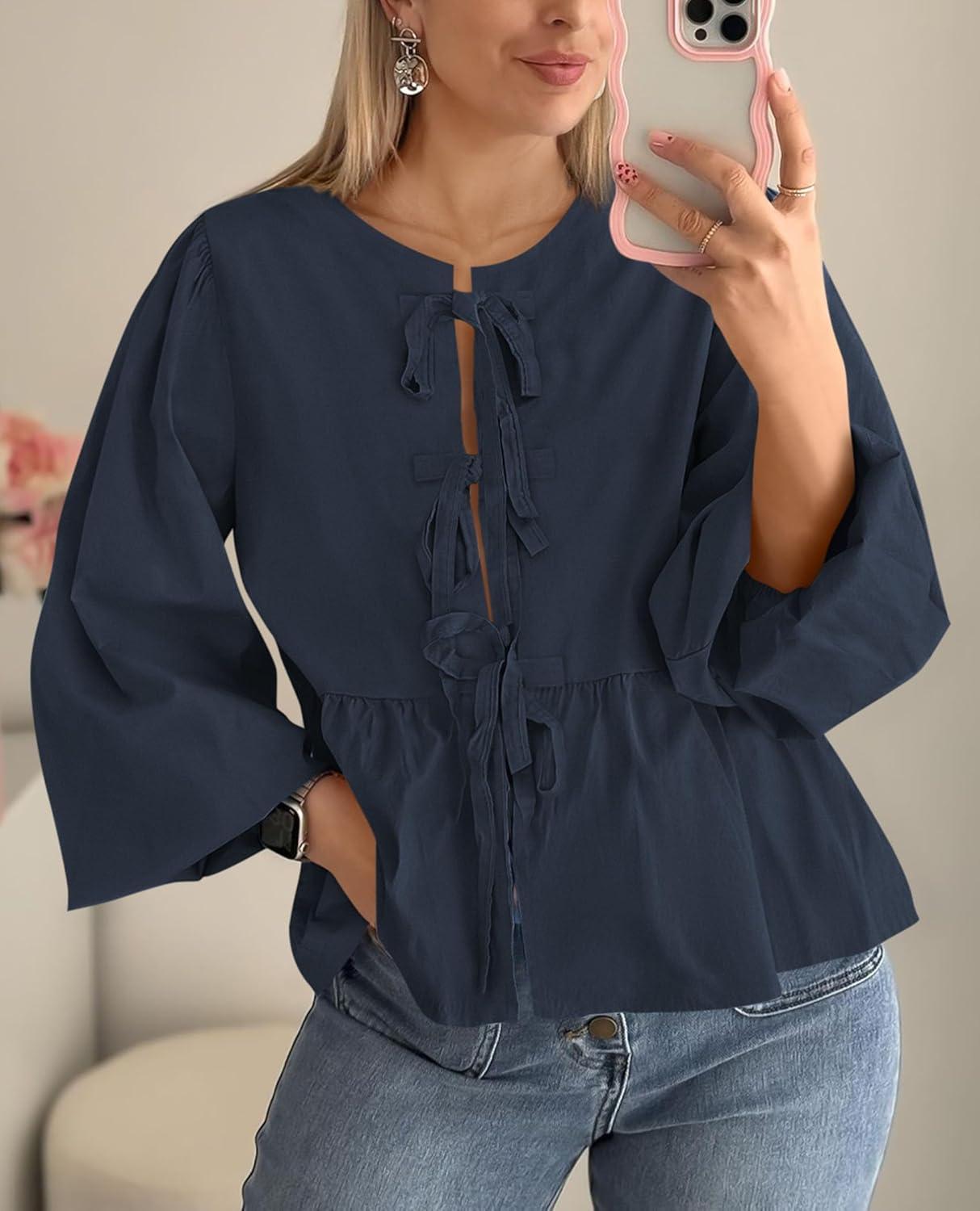 PRETTYGARDEN Women's Spring Fall Babydoll Peplum Blouse Shirt Puff Long Sleeve Bow Tie Front Trendy Cute Y2K Going Out Tops(Solid Navy)