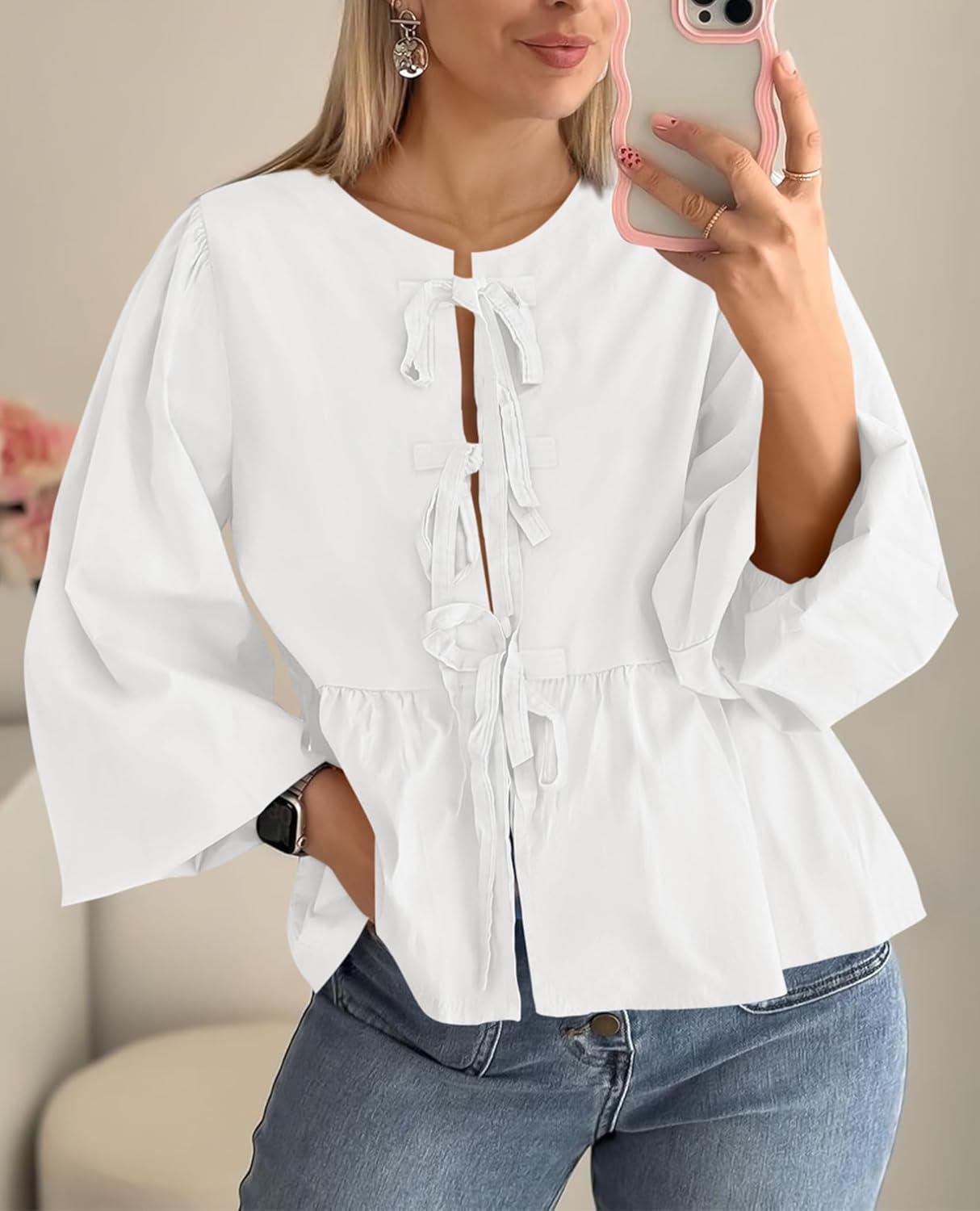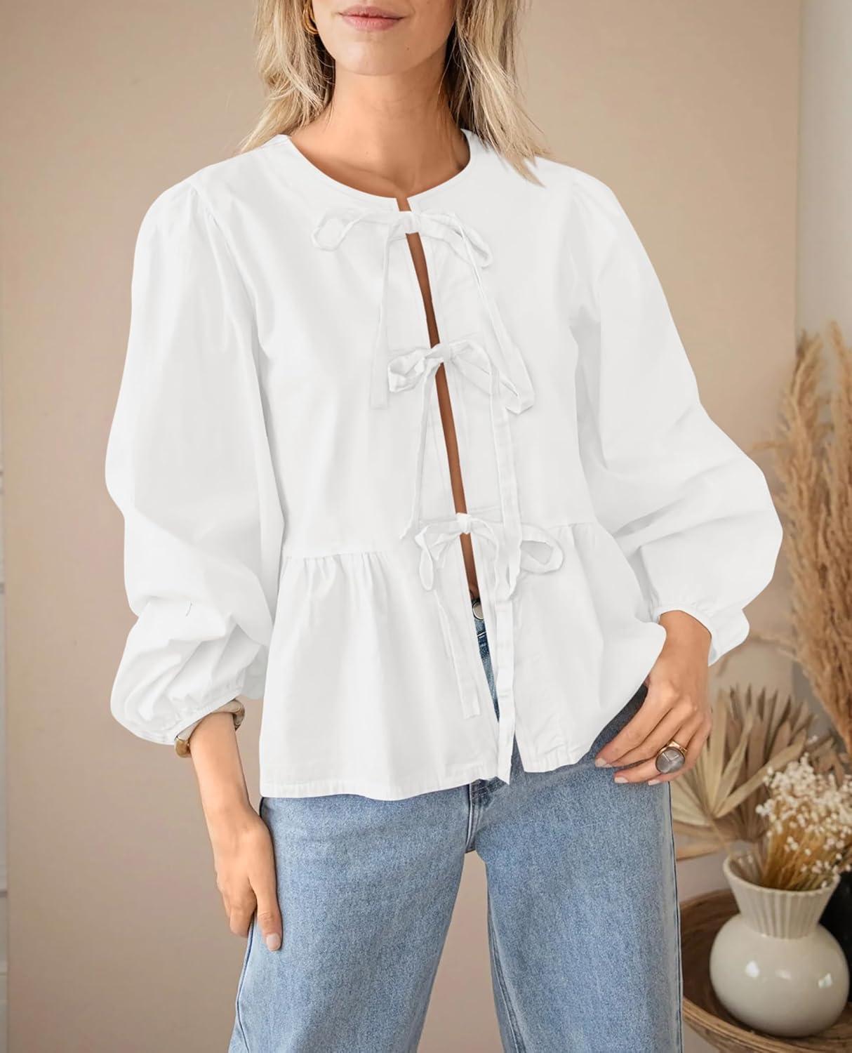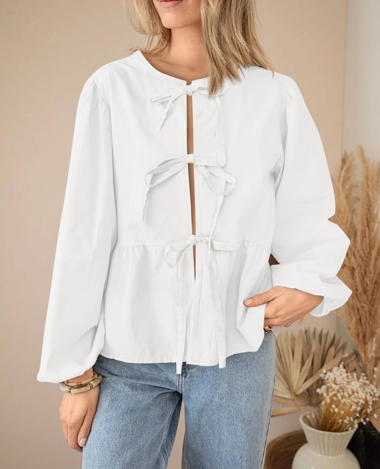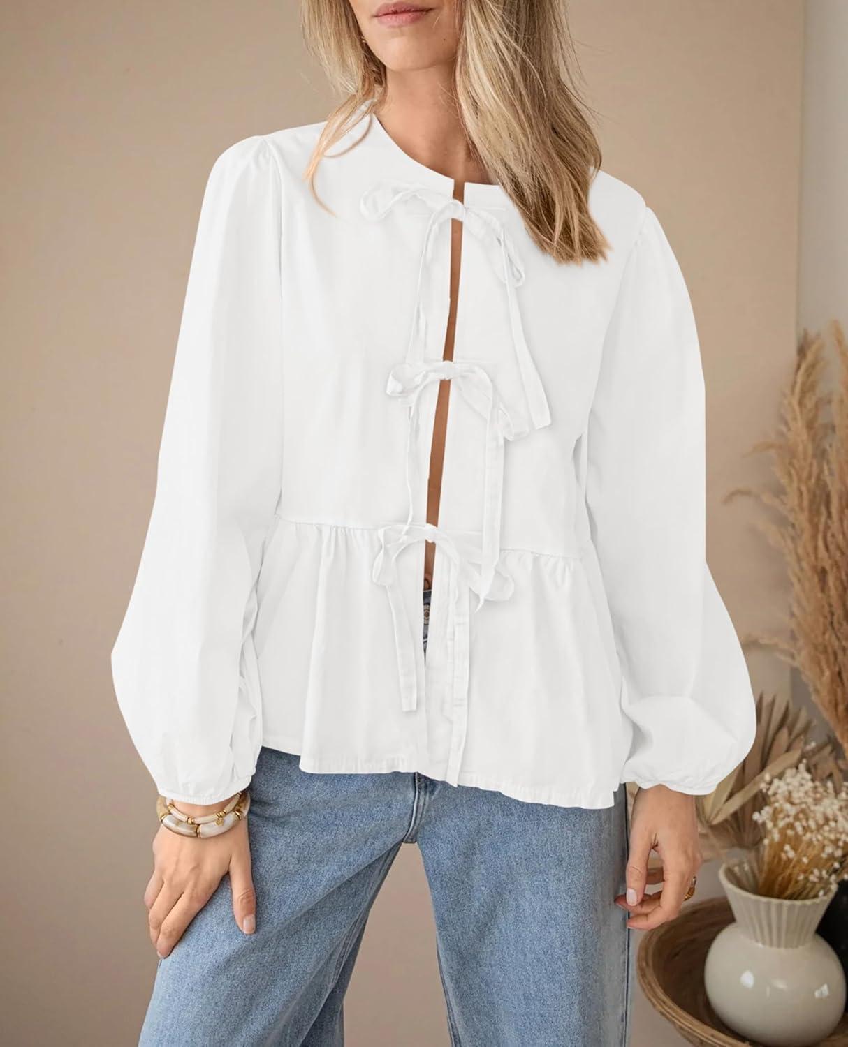 PRETTYGARDEN Women's Spring Fall Babydoll Peplum Blouse Shirt Puff Long Sleeve Bow Tie Front Trendy Cute Y2K Going Out Tops(White)