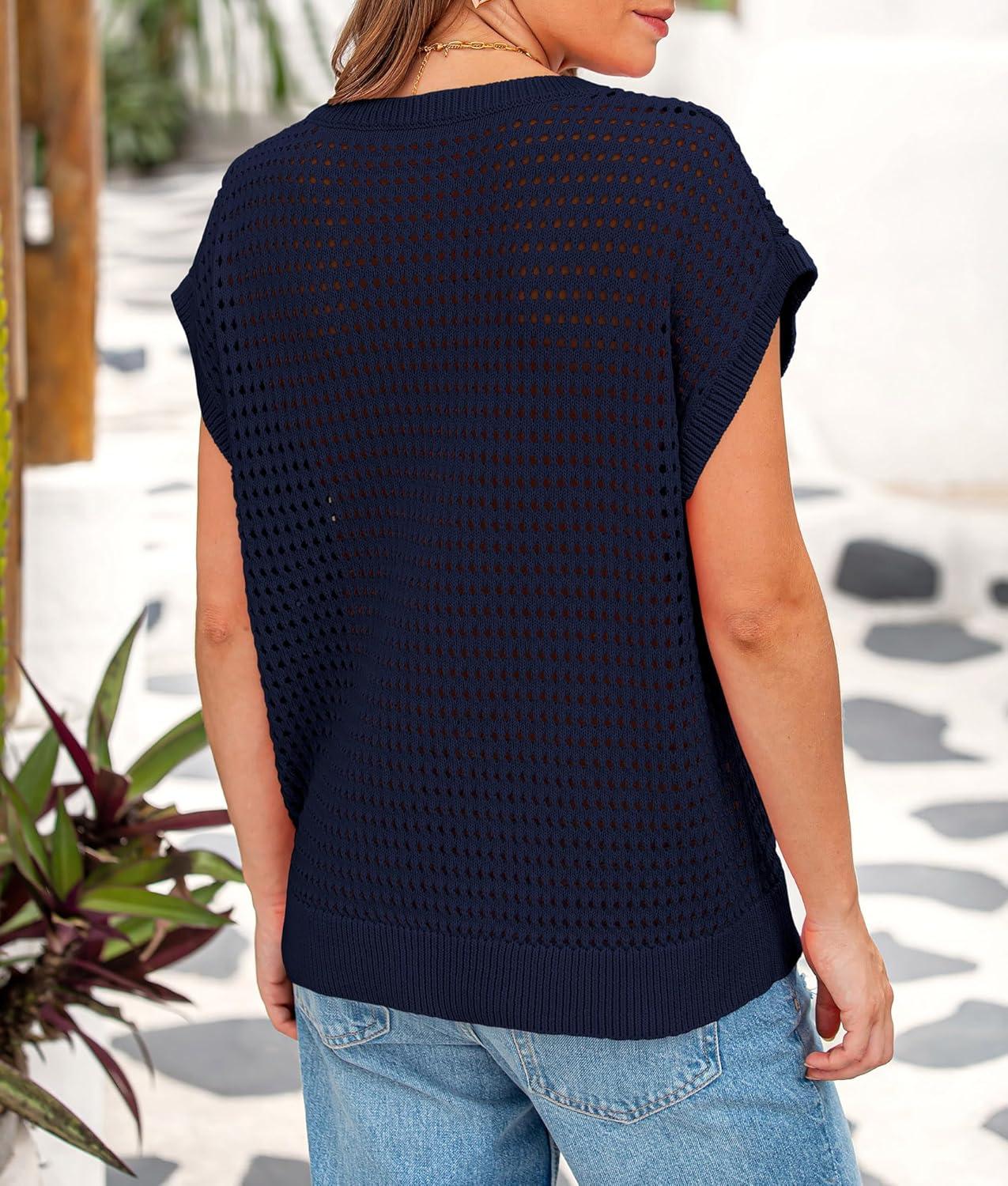 PRETTYGARDEN Womens Spring Tops 2025 Summer Shirts Crochet Cap Sleeve Sweater Pullover Cute Beach Vacation Clothes(Navy)