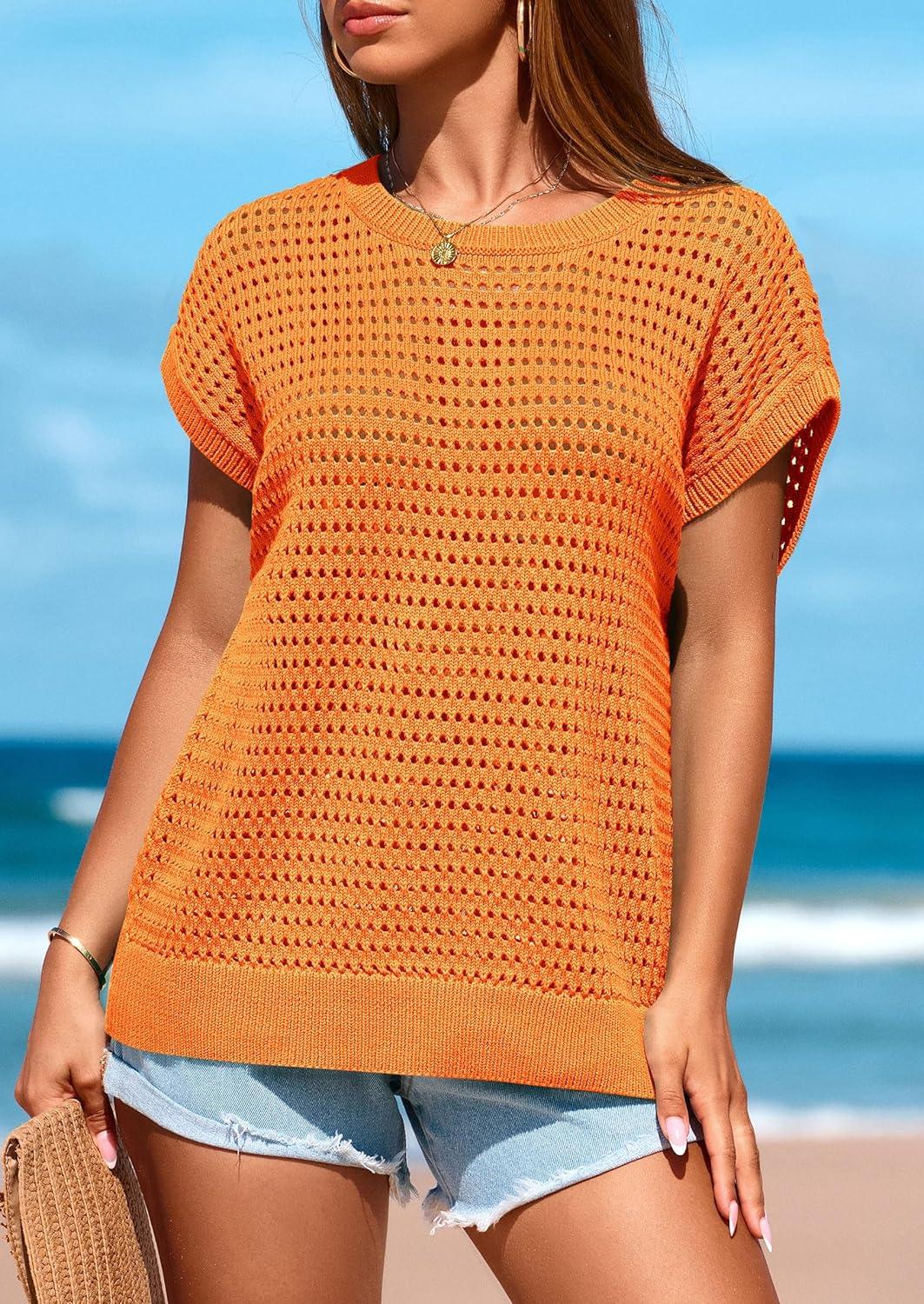 PRETTYGARDEN Womens Spring Tops 2025 Summer Shirts Crochet Cap Sleeve Sweater Pullover Cute Beach Vacation Clothes(Orange)