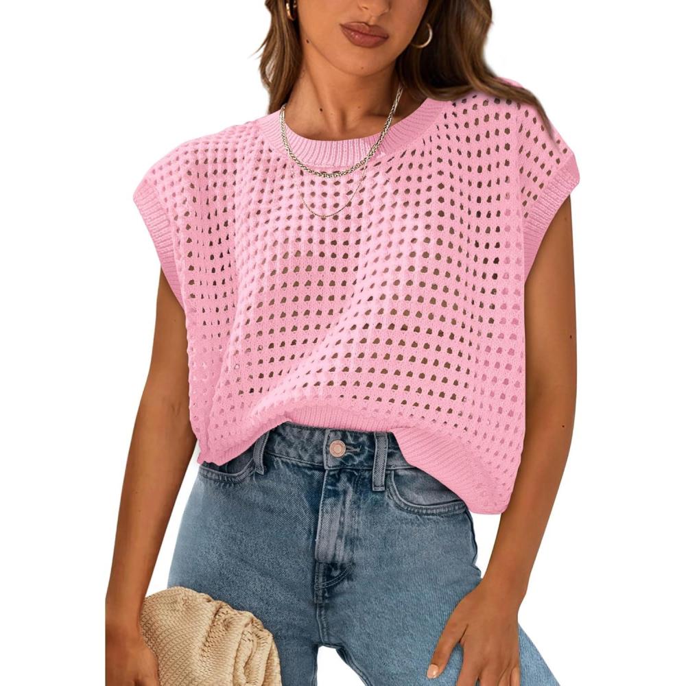 PRETTYGARDEN Womens Spring Tops 2025 Summer Shirts Crochet Cap Sleeve Sweater Pullover Cute Beach Vacation Clothes(Pink)