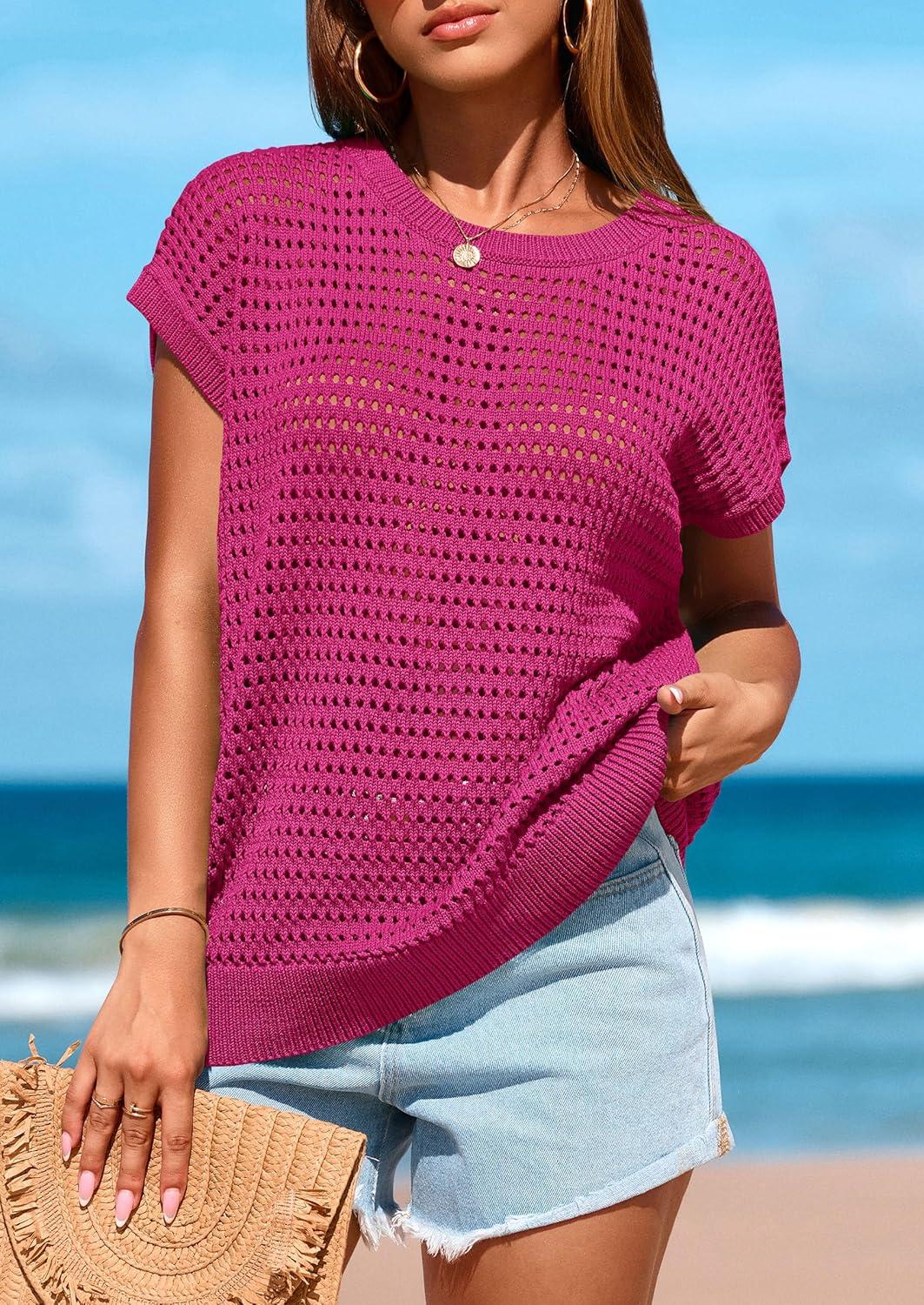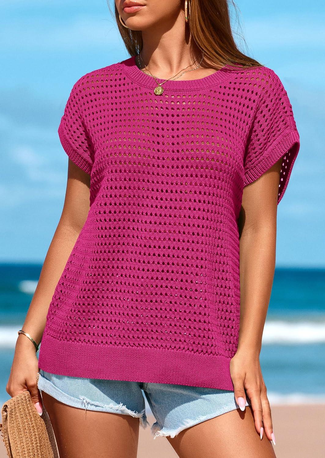PRETTYGARDEN Womens Spring Tops 2025 Summer Shirts Crochet Cap Sleeve Sweater Pullover Cute Beach Vacation Clothes(Rose Red)
