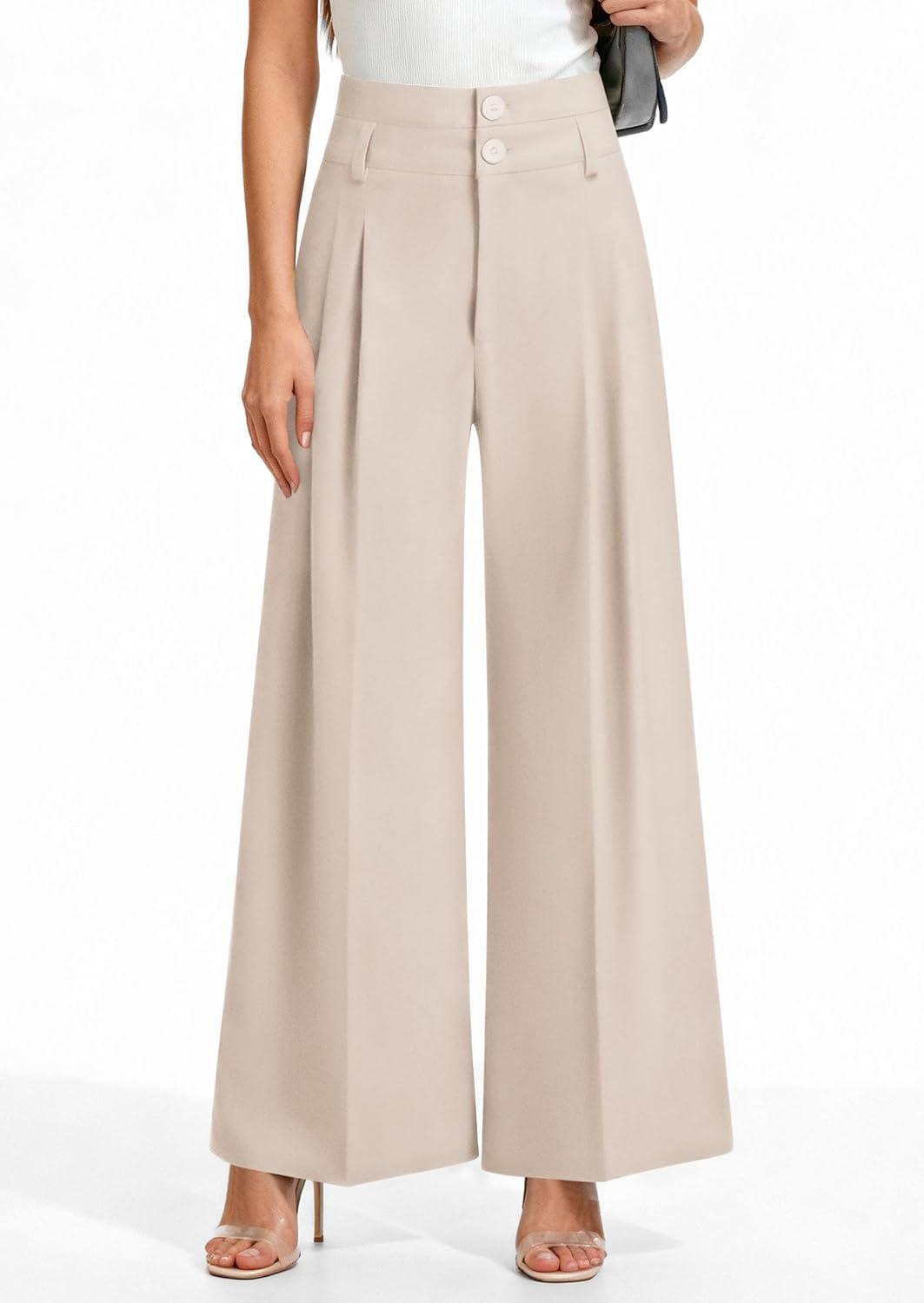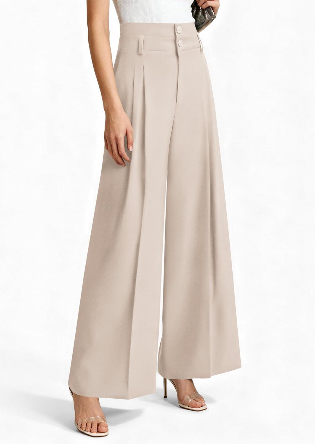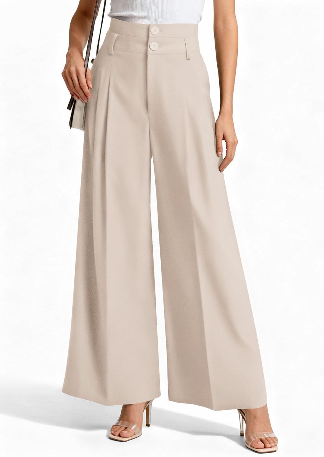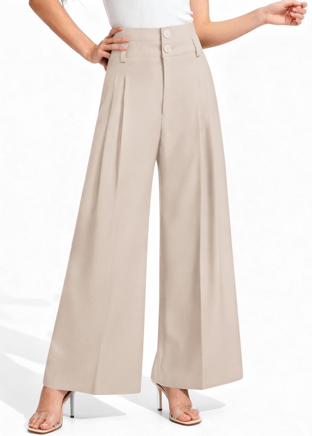 PRETTYGARDEN Womens Spring Wide Leg Palazzo Pants 2026 Trendy Loose Button High Waist Pleated Work Business Casual Trousers(Beige)
