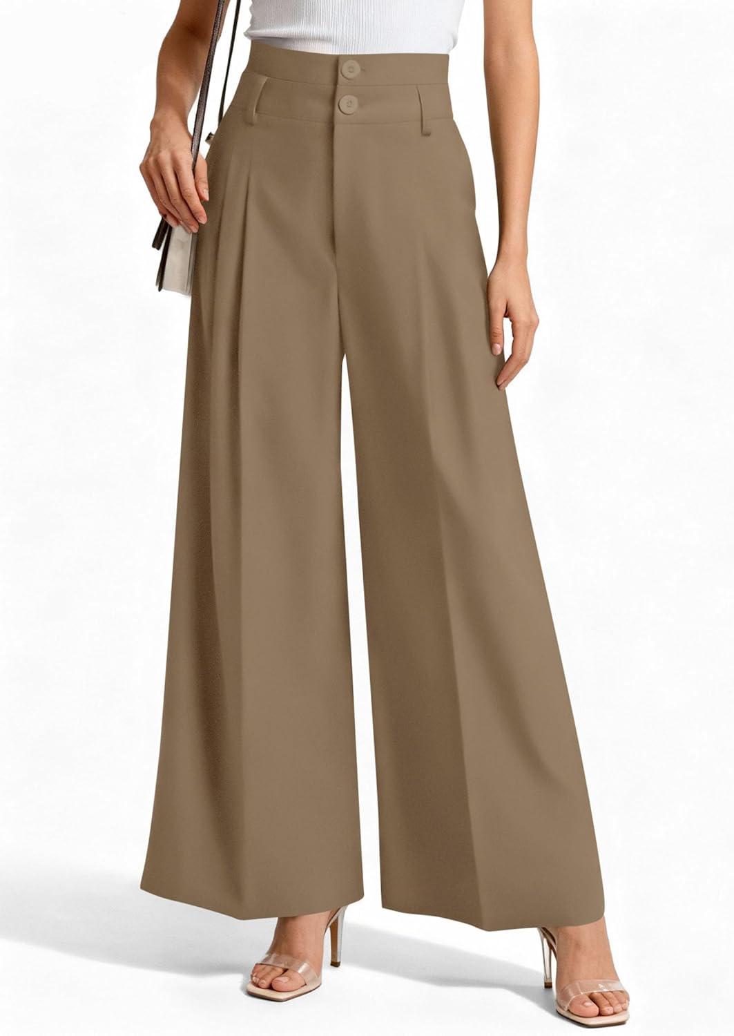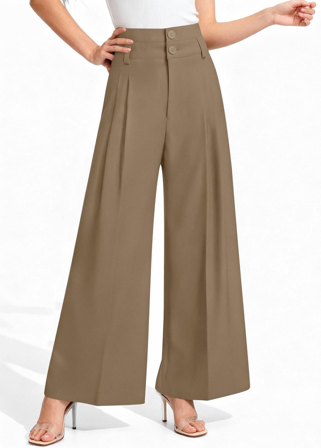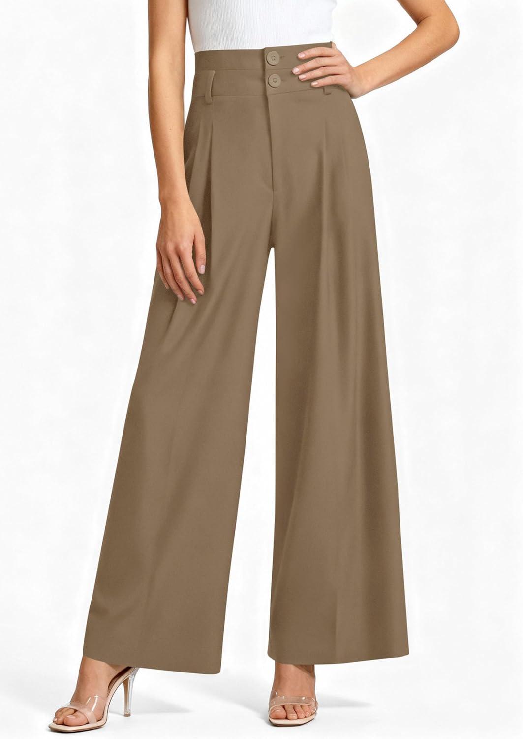 PRETTYGARDEN Womens Spring Wide Leg Palazzo Pants 2026 Trendy Loose Button High Waist Pleated Work Business Casual Trousers(Brown)