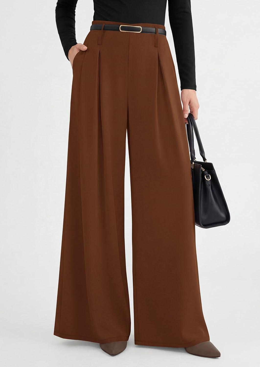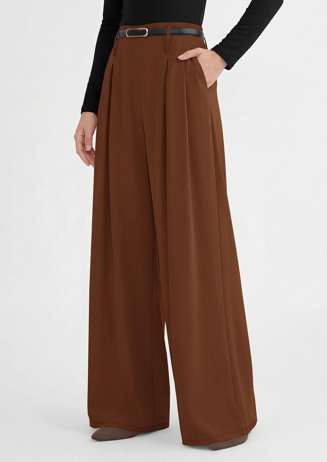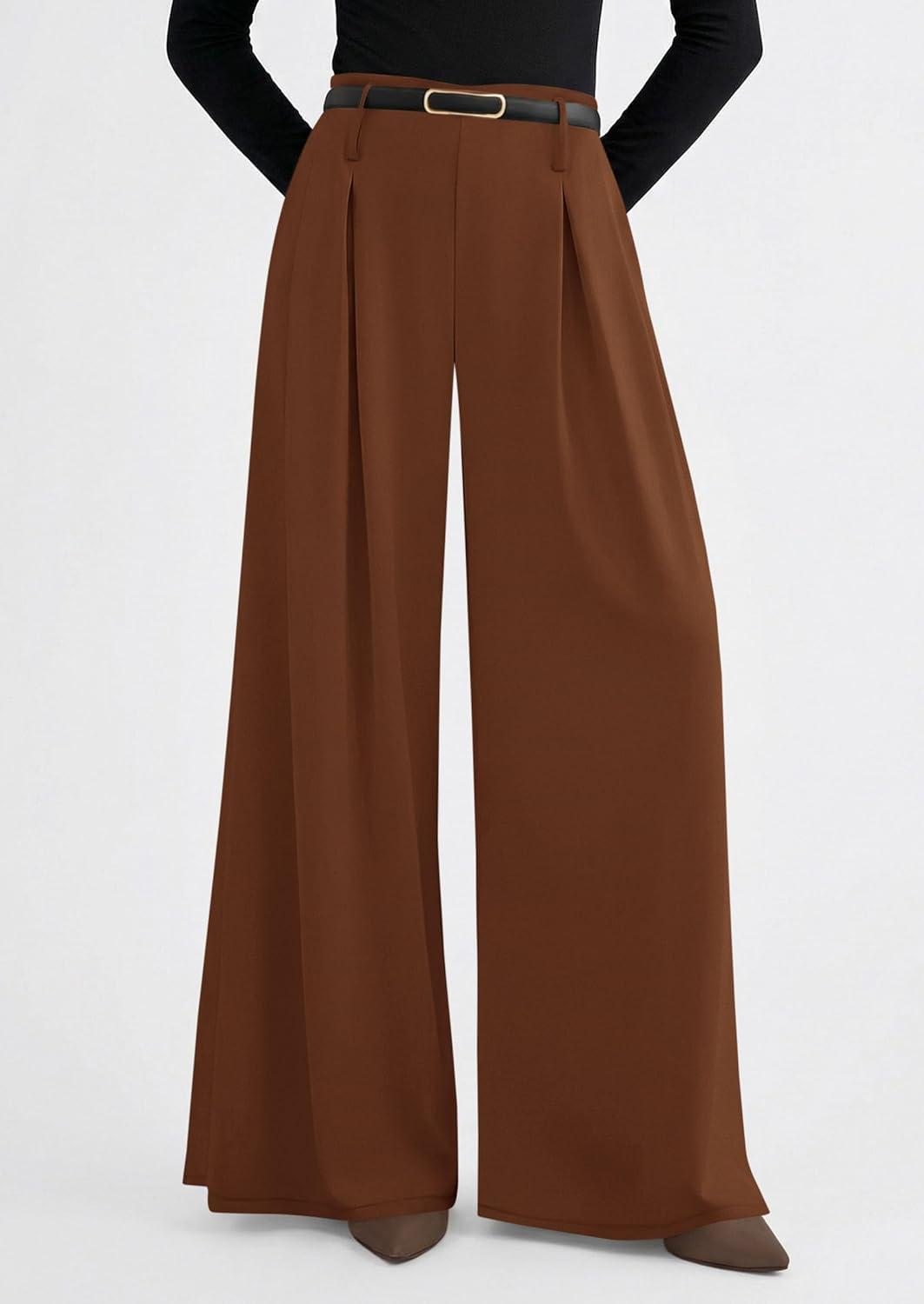 PRETTYGARDEN Womens Spring Wide Leg Trousers 2026 High Elastic Waist Loose Pleated Long Flowy Palazzo Work Pants with Pockets(Red Brown)