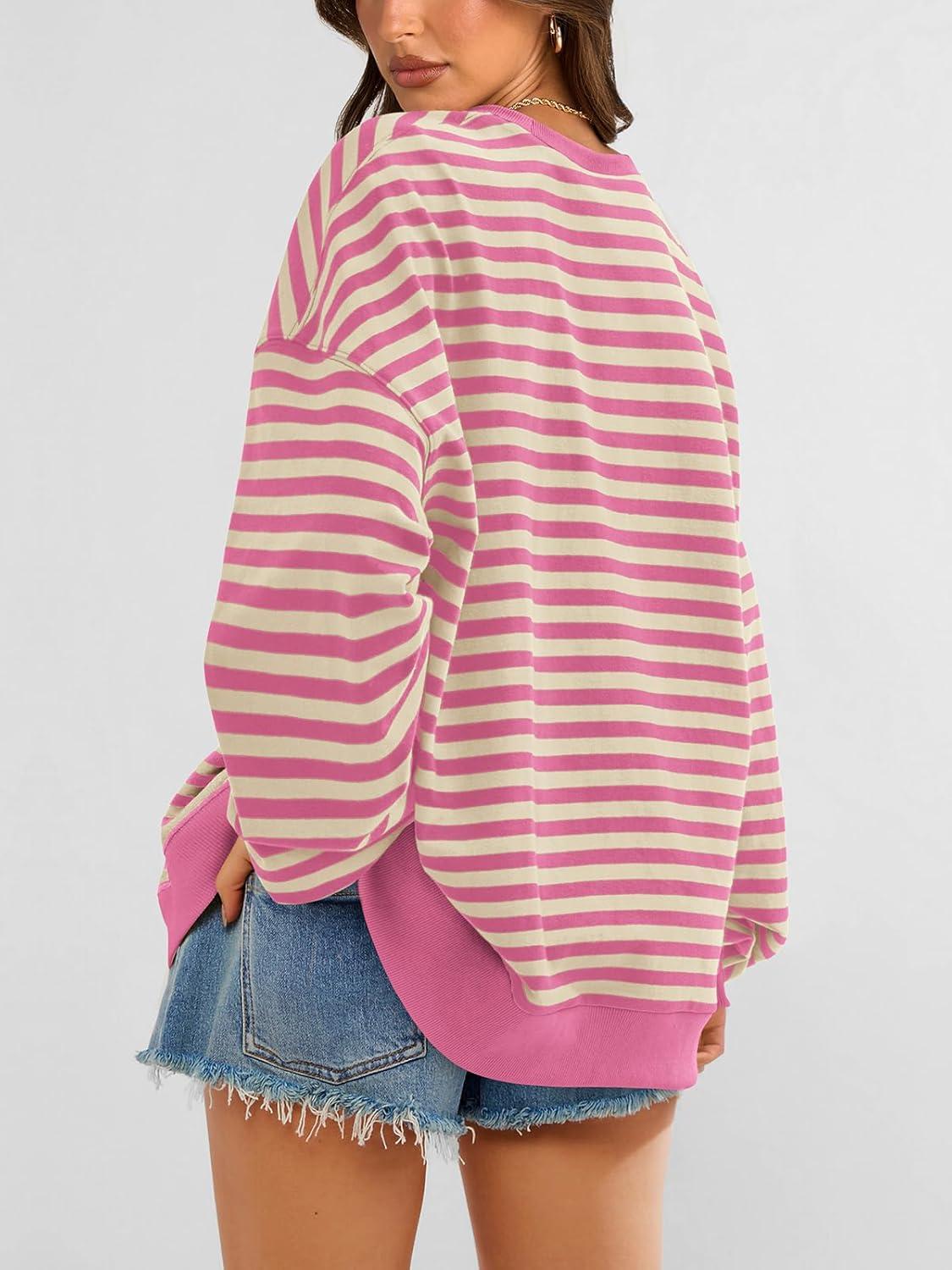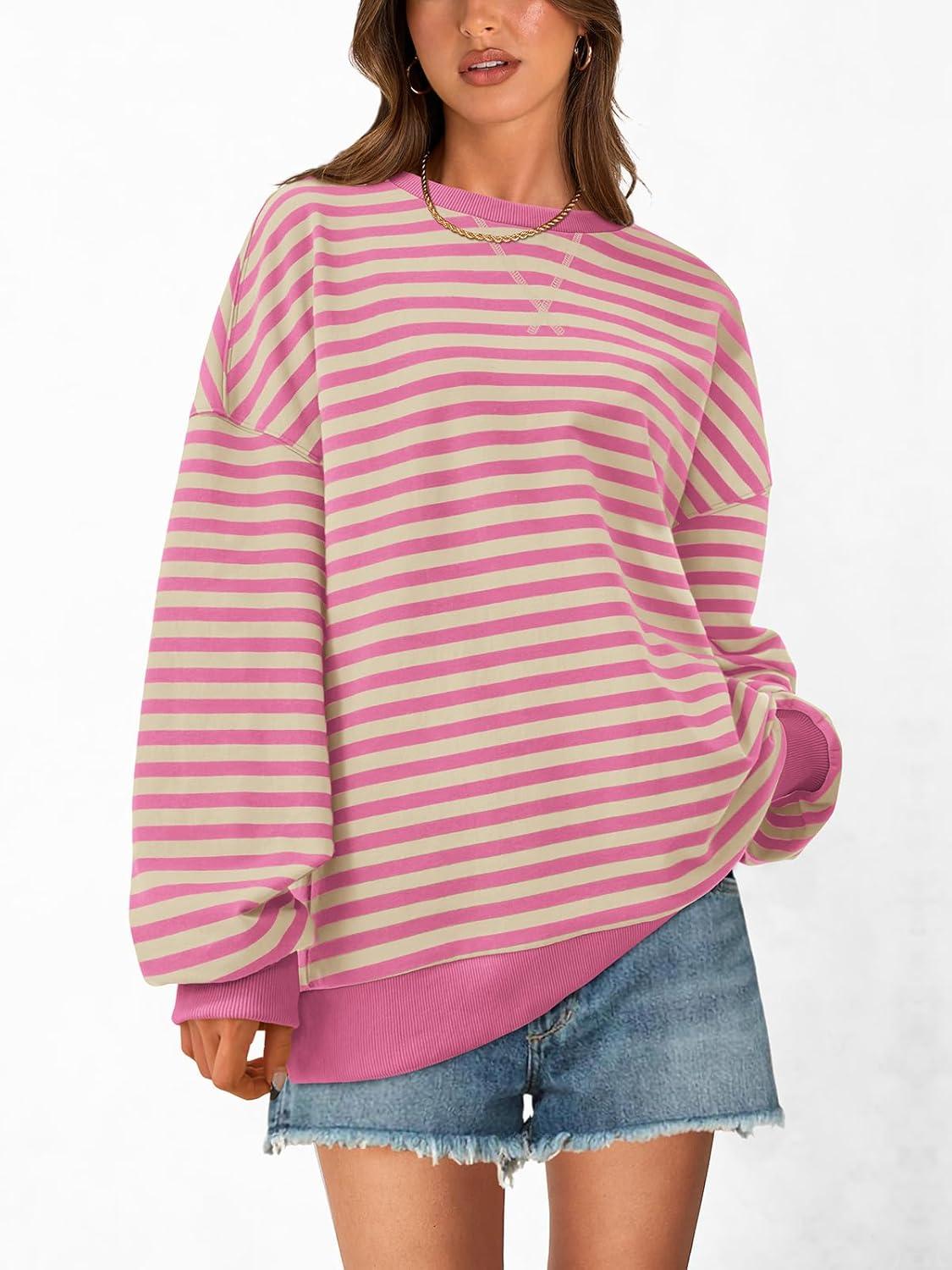 PRETTYGARDEN Womens Striped Oversized Sweatshirt Color Block Crew Neck Long Sleeve Casual Loose Pullover Top Y2K Clothes(Rose Pink White)