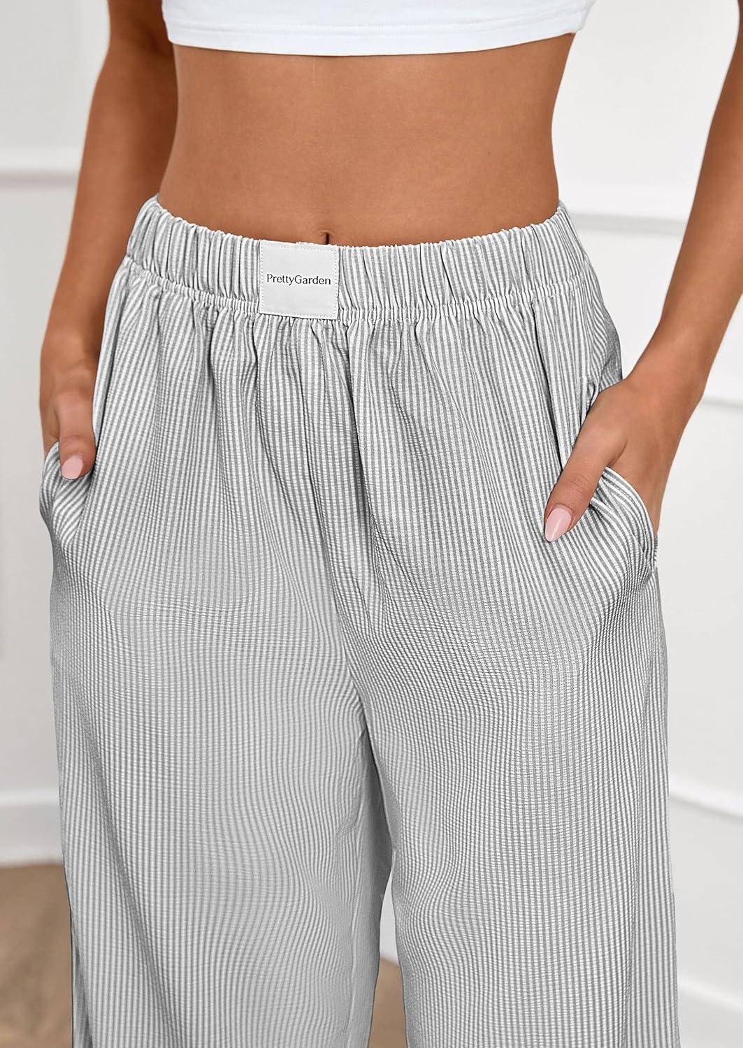 PRETTYGARDEN Women's Striped Pajama Pants 2025 Fall Fashion Clothing Lounge Sleep Pj Bottoms Comfy Casual Wide Leg Trousers(Black)
