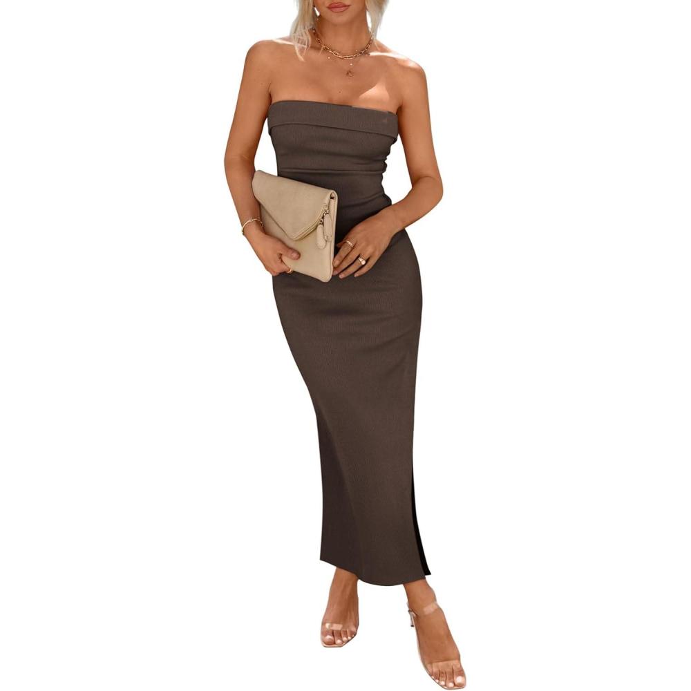 PRETTYGARDEN Women’s Summer Bodycon Maxi Tube Dress Ribbed Strapless Side Slit Long Going Out Casual Elegant Party Dresses(Coffee)
