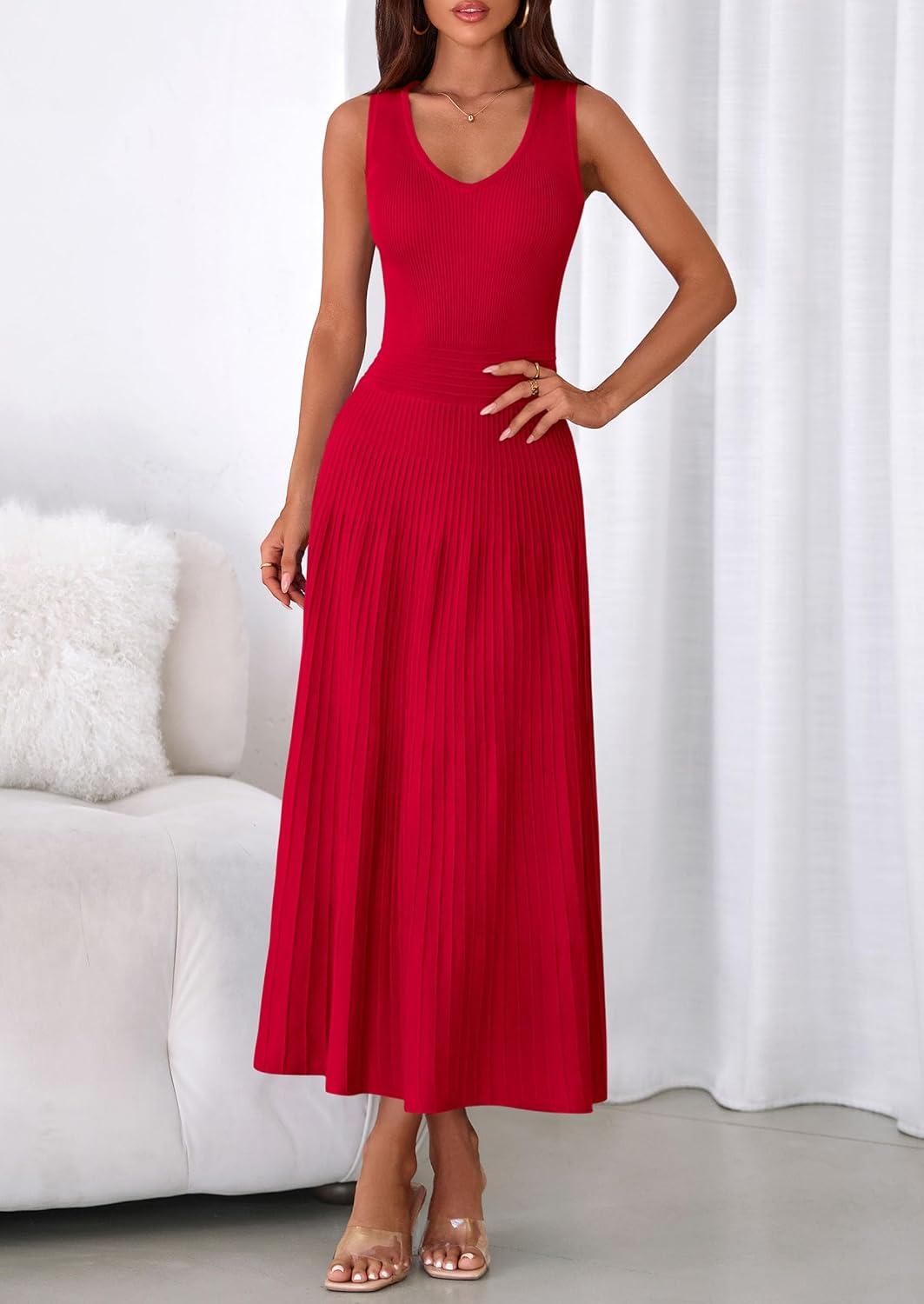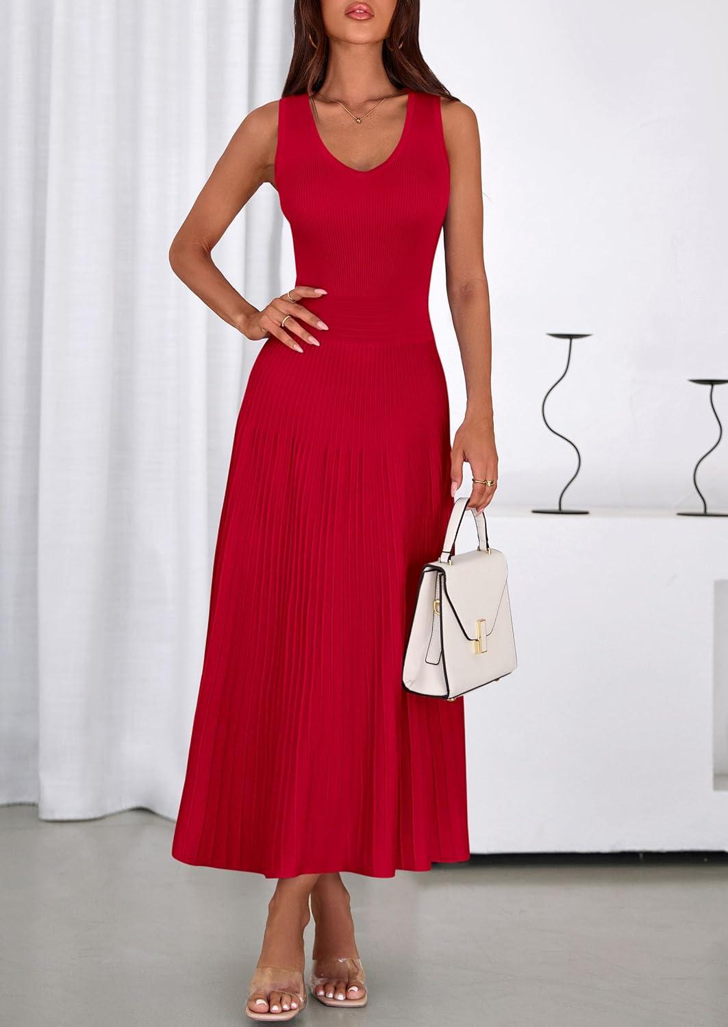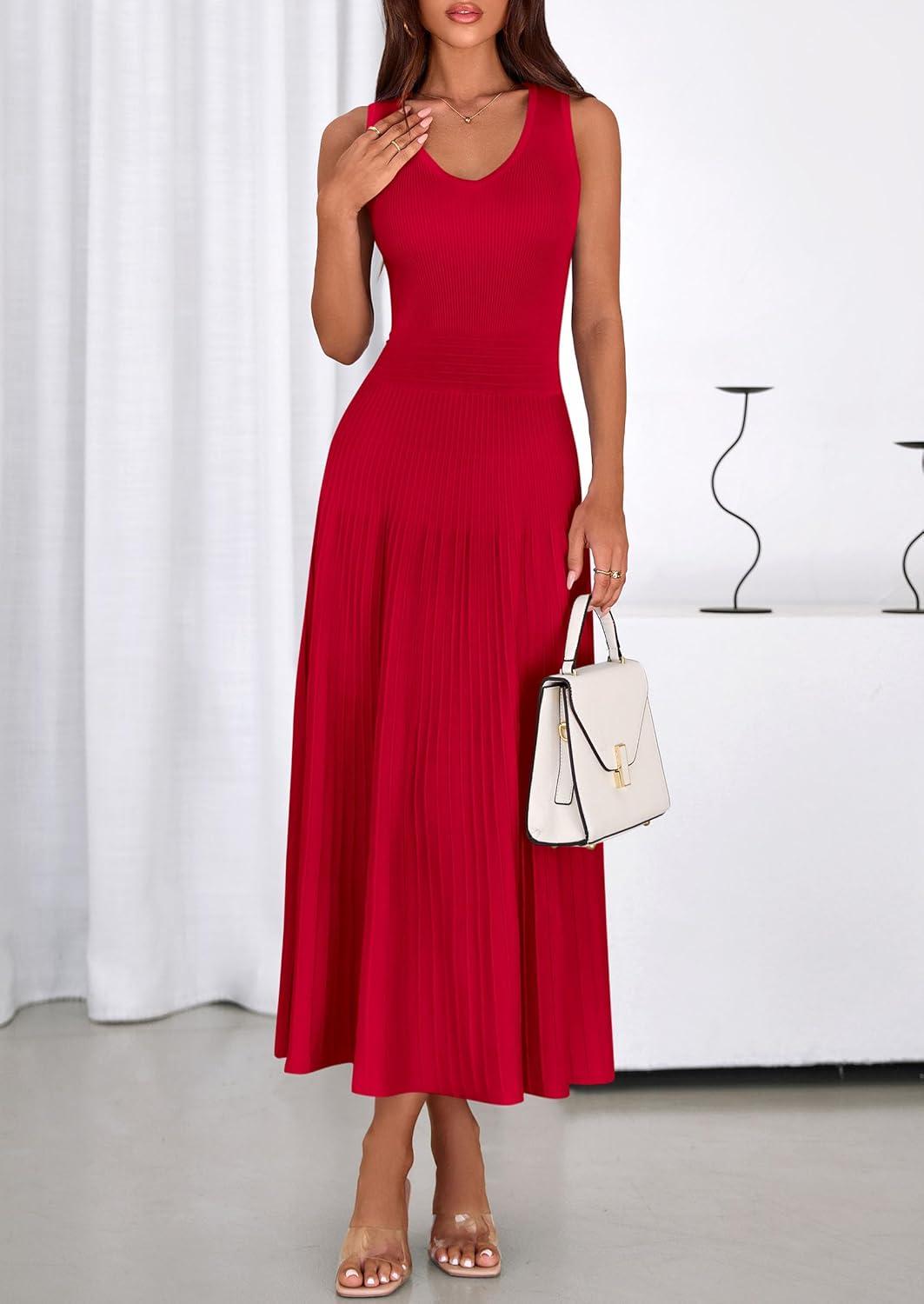 PRETTYGARDEN Women’s Summer Casual Dresses 2026 Spring Sleeveless V Neck Midi Business Work A Line Pleated Cocktail Dress(Red)