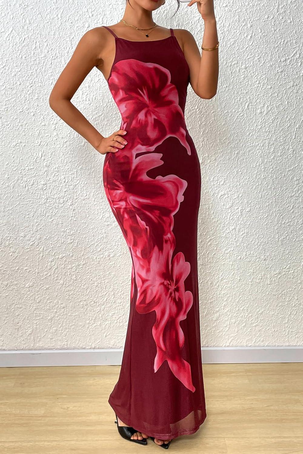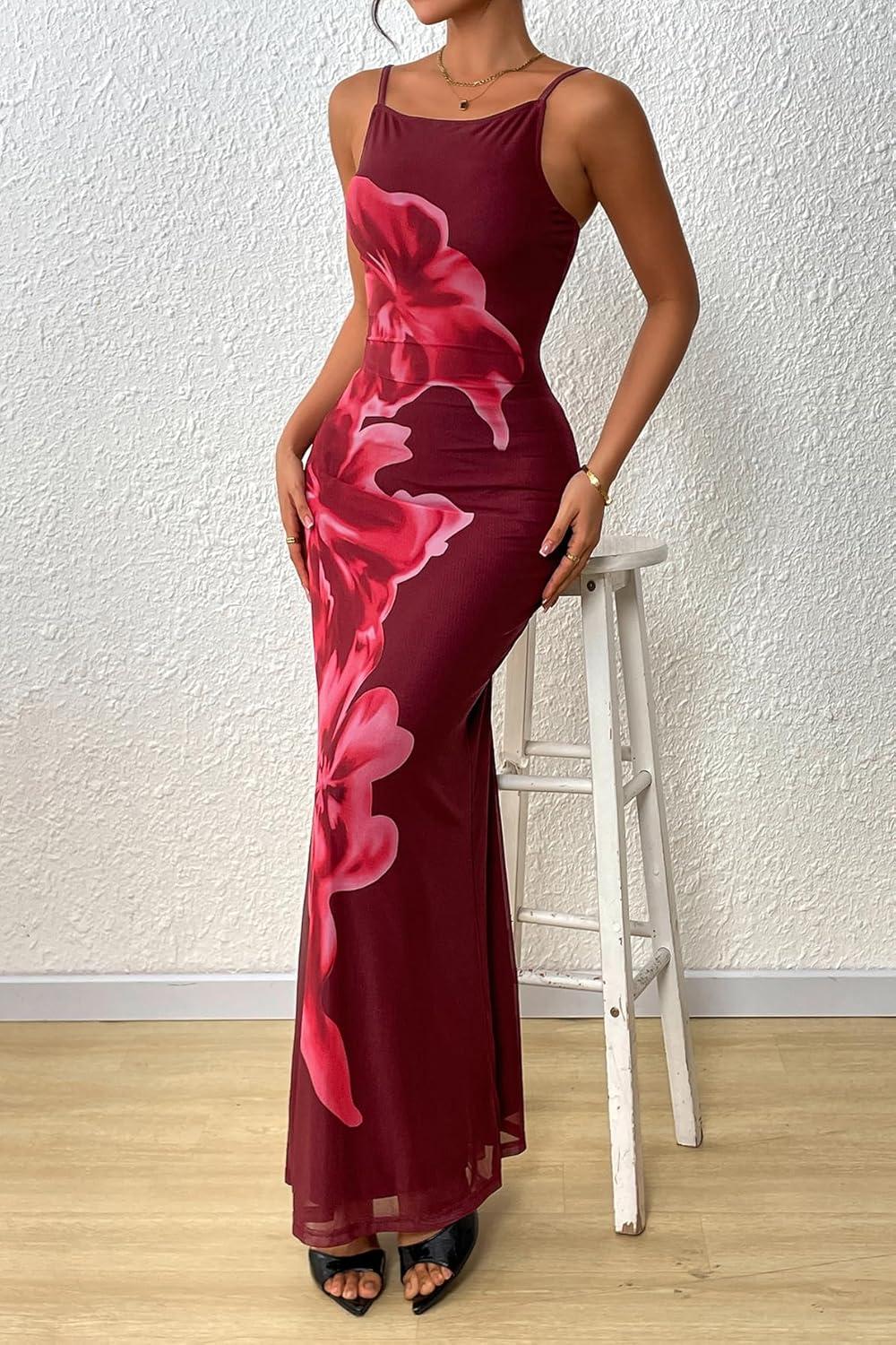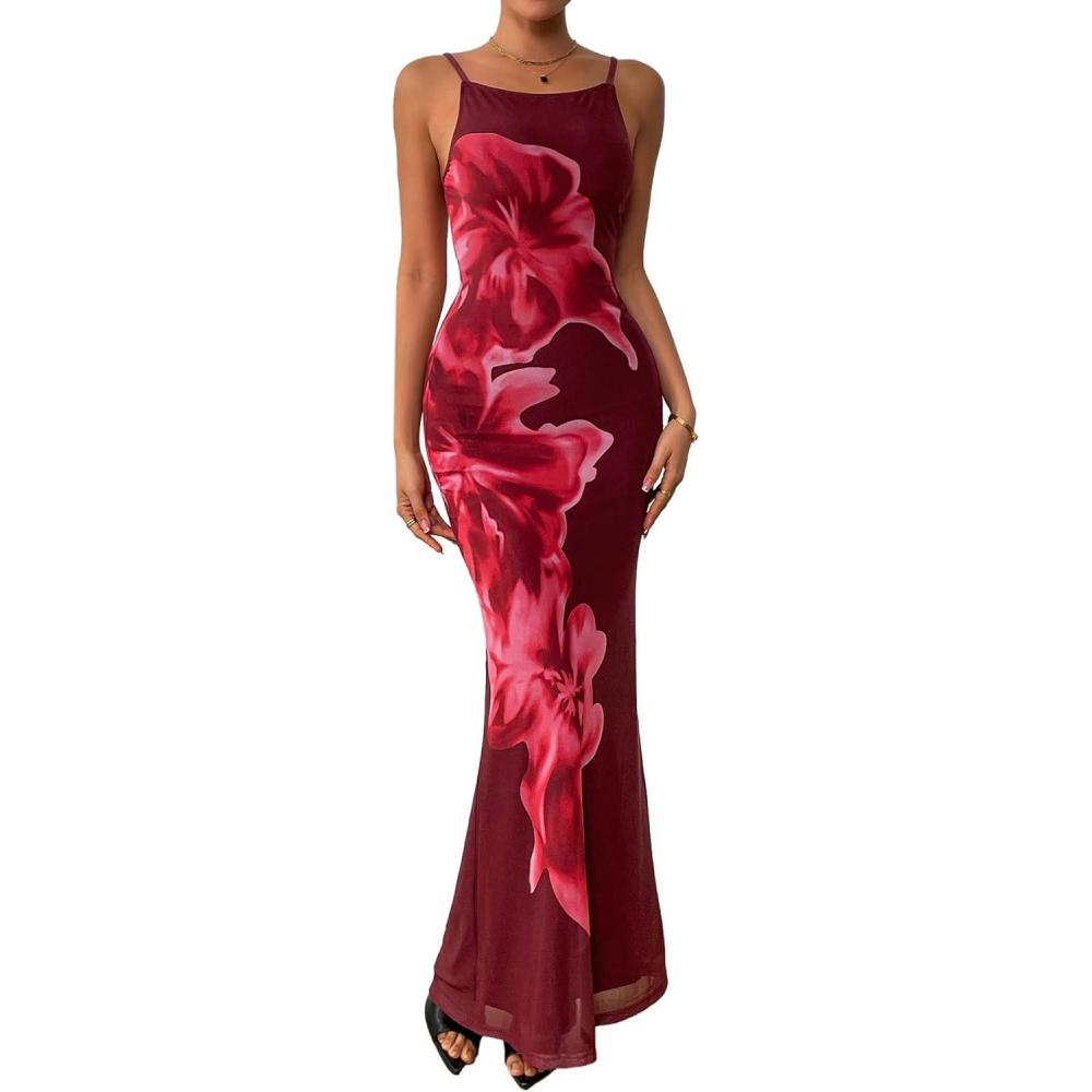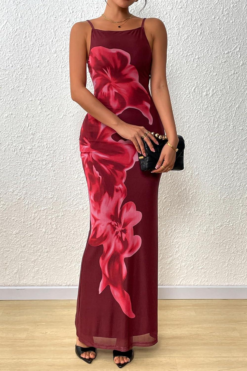 PRETTYGARDEN Womens Summer Dresses 2025 Elegant Spaghetti Straps Evening Gown Floral Print Bodycon Maxi Mesh Sundress(Wine Red and Red Floral)