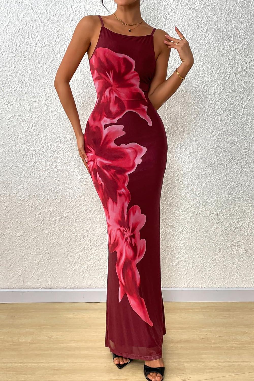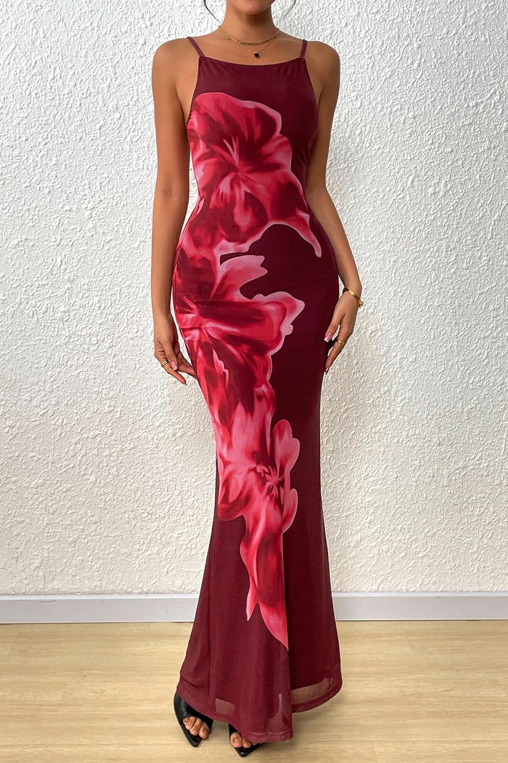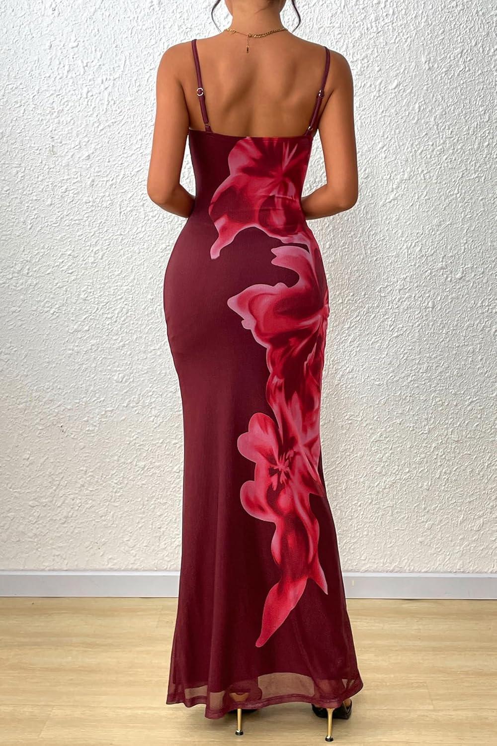PRETTYGARDEN Womens Summer Dresses 2025 Elegant Spaghetti Straps Evening Gown Floral Print Bodycon Maxi Mesh Sundress(Wine Red and Red Floral)
